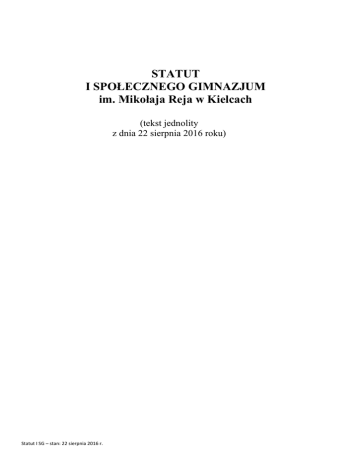 STATUT I SPOŁECZNEGO GIMNAZJUM im. Mikołaja Reja w Kielcach (tekst jednolity z dnia 22 sierpnia 2016 roku) Statut I SG – stan: 22 sierpnia 2016 r. 2 STATUT I SPOŁECZNEGO GIMNAZJUM IM. MIKOLAJA REJA W KIELCACH ROZDZIAŁ I NAZWA, TYP, CEL I ZADANIA SZKOŁY § 1. 1. Szkoła nosi nazwę I Społecznego Gimnazjum im. Mikołaja Reja w Kielcach, jest szkołą niepubliczną o uprawnieniach szkoły publicznej. 2. Szkoła jest trzyletnia i kończy się egzaminem zewnętrznym. 3. Szkoła daje możliwość dalszego kształcenia w technikum, liceum ogólnokształcącym lub szkole zawodowej. 4. Siedzibą szkoły jest miasto Kielce. 5. Realizacja celów i zadań szkoły wspierana jest przez szkolny program wychowawczy. 6. Nadrzędną ideą szkoły jest dobro dziecka. 7. Działalność dydaktyczno-wychowawcza oraz działalność organów szkoły i organizacji działających na jej terenie prowadzona jest zgodnie z przepisami prawa oraz ideami zawartymi w Konstytucji Rzeczypospolitej Polskiej, Powszechnej Deklaracji Praw Człowieka, Międzynarodowym Pakcie Praw Obywatelskich i Politycznych, Konwencji o Prawach Dziecka. Przestrzega również zasad pedagogiki. 8. Gimnazjum dla celów organizacyjnych jest połączone z przedszkolem i szkołą podstawową w zespół o nazwie Zespół Szkół Społecznych im. Mikołaja Reja w Kielcach. Połączenie nie narusza odrębności szkół w zakresie określonym w ustawie o systemie oświaty, w szczególności w zakresie uzyskiwania zezwolenia, cofania zezwolenia, wpisywania do ewidencji i wykreślania z niej, uzyskiwania i utraty uprawnień szkoły publicznej oraz uzyskiwania dotacji. Dyrektor Szkoły jest Dyrektorem Zespołu. 9. W szkole przebieg nauczania dokumentuje się w dzienniku elektronicznym. Jeżeli w statucie jest mowa o dzienniku, dzienniku lekcyjnym, dzienniku klasy lub dzienniku zajęć to rozumie się przez to dziennik elektroniczny. § 2. 1. Głównym celem szkoły jest zapewnienie uczniom możliwie pełnego rozwoju intelektualnego i fizycznego w warunkach poszanowania ich godności oraz wolności światopoglądowej i wyznaniowej. 2. Szkoła przygotowuje uczniów do wypełniania obowiązków rodzinnych i obywatelskich w oparciu o zasady solidarności, demokracji, tolerancji i sprawiedliwości. 3. Szkoła podejmuje wszelkie właściwe kroki mające na celu ochronę dziecka przed jakimikolwiek przejawami dyskryminacji. 4. Szkoła w granicach swoich możliwości zapewnia opiekę zdrowotną i pedagogiczną oraz warunki twórczego rozwoju dziecka, także poprzez organizację zajęć pozalekcyjnych. 5. Nauczyciele mają prawo nauczać zgodnie z wybranymi przez siebie i uzgodnionymi z Dyrektorem Zespołu metodami nauczania, przestrzegając zasad etyki zawodowej i przepisów prawa. 6. W szkole prowadzone są zajęcia religii. Ocenianie ucznia z religii odbywa się zgodnie z innymi przepisami. 7. Realizacja celów i zadań szkoły wspierana jest przez szkolny program wychowawczy i program profilaktyki ustalany przez Radę Nauczycieli po zaopiniowaniu przez Radę Szkoły. 8. W szkole jest udzielana i organizowana pomoc psychologiczno-pedagogiczna, którą organizuje Dyrektor Zespołu. Korzystanie z pomocy psychologiczno-pedagogicznej jest dobrowolne i nieodpłatne. Pomocy psychologiczno-pedagogicznej udzielają uczniom nauczyciele oraz inni specjaliści zatrudnieni w szkole. § 3. 1. Uczniowie, ich rodzice, nauczyciele oraz inni pracownicy szkoły tworzą społeczność szkolną. 2. Członkowie społeczności szkolnej uczestniczą w życiu szkoły bezpośrednio oraz poprzez udział swoich przedstawicieli w Radzie Nauczycieli, Radzie Rodziców, Radzie Uczniów i władzach Towarzystwa. ROZDZIAŁ II ORGAN PROWADZĄCY SZKOŁĘ § 4. 1. Szkoła jest placówką oświatowo-wychowawczą utworzoną, prowadzoną i nadzorowaną przez Świętokrzyskie Społeczne Towarzystwo Oświatowe w Kielcach oraz właściwe organy Towarzystwa w ramach ich kompetencji. 2. Statut Szkoły jest podstawowym aktem prawnym regulującym jej działalność. Tworzone na jego podstawie regulaminy nie mogą być z nim sprzeczne ani powtarzać kwestii rozstrzygniętych w ww. dokumencie. § 5. Nauczyciele i inni pracownicy szkoły są zatrudniani zgodnie z Kodeksem Pracy oraz uchwałami władz Towarzystwa. 2 3 ROZDZIAŁ III NADZÓR NAD SZKOŁĄ § 6. 1. Pedagogiczny nadzór nad szkołą sprawuje Świętokrzyski Kurator Oświaty w Kielcach. 2. Nadzór nad prowadzeniem i organizacją pracy szkoły sprawuje Świętokrzyskie Społeczne Towarzystwo Oświatowe w Kielcach oraz właściwe organy Towarzystwa w ramach swych kompetencji. ROZDZIAŁ IV ORGANY SZKOŁY ORAZ ZAKRES ICH ZADAŃ § 7. 1. Organami szkoły są: A. Dyrektor Szkoły; B. Rada Nauczycieli; C. Rada Szkoły; D. Rada Uczniów. 2. Decyzje i opinie Rady Nauczycieli i Rady Uczniów zapadają w formie uchwał zwykłą większością głosów przy obecności co najmniej połowy członków. Na wniosek co najmniej jednego z członków organu zarządza się głosowanie tajne. 3. Posiedzenia organów są protokołowane. 4. Uchwały organów szkoły winny być udostępniane członkom społeczności szkolnej. Organy szkoły mają obowiązek udzielania sobie wzajemnych informacji w nieprzekraczalnym terminie 10 dni. 5. Uchwały organów szkoły sprzeczne ze Statutem Szkoły lub innymi przepisami prawa mogą być zawieszone lub uchylone przez organ prowadzący. O zawieszeniu lub uchyleniu uchwały organ prowadzący niezwłocznie powiadamia organ szkoły, który uchwałę podjął. 6. Opinie organów szkoły w sprawach określonych Statutem, o ile dalsze postanowienia Statutu nie stanowią inaczej, formułowane są w terminie do 14 dni. § 8. 1. Organy szkoły z własnej inicjatywy lub na wniosek władz Towarzystwa mają prawo do wyrażania opinii, składania wniosków w każdej sprawie dotyczącej szkoły i przedstawiania ich właściwym adresatom. 2. Organy szkoły (z wyjątkiem Dyrektora Szkoły) nie mogą reprezentować szkoły na zewnątrz. Podrozd