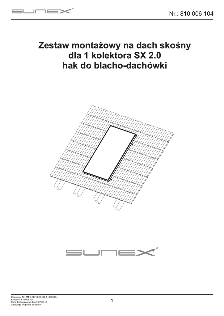 Nr.: 810 006 104 Zestaw montażowy na dach skośny dla 1 kolektora SX 2.0 hak do blacho-dachówki Dokument Nr: ZM.S.SX.1K.20.BD_810006104 Exact Nr: 810 006 104 Dane techniczne na dzień: 07.03.11 Zastrzega się prawo do zmain 1 Nr.: 810 006 104 9 150 0÷ 170 0 A Hak do blacho-dachówki ≈150 ≈828 1128 ≈150 Wykaz elementów Poz. Opis Ilość 1 Hak do blachy trapezowej i falistej (podstawa + ramię) 4 kpl. 2 Profil aluminiowy 16x34 - L= 1128mm 2 szt. 3 Wieszak 100x4 - długi 2 szt. 4 Nakładka nierdzewna 30x74mm 2 szt. 5 Nakładka nierdzewna 30x35mm 4 szt. 6 Śruba zamkowa nierdzewna M8x20 + nakrętka kołnierzowa 8 kpl. 7 Nakładka aluminiowa 30x120mm - łącznik belki 2 szt. 8 Śruba zamkowa nierdzewna M8x30 + nakrętka kołnierzowa 8 kpl. 9 Wkręt 8x160 8 szt. Dokument Nr: ZM.S.SX.1K.20.BD_810006104 Exact Nr: 810 006 104 Dane techniczne na dzień: 07.03.11 Zastrzega się prawo do zmain 2 Nr.: 810 006 104 1. Przygotowanie dachu do montażu zestawu. 15 00 ÷1 70 0 Zamocować haki przy pomocy wkrętów ocynkowanych. ≈82 8 Dokument Nr: ZM.S.SX.1K.20.BD_810006104 Exact Nr: 810 006 104 Dane techniczne na dzień: 07.03.11 Zastrzega się prawo do zmain 3 Nr.: 810 006 104 2. Montaż elementów haka i profila aluminiowego 2 . 2 9 1 6 4. Założyć wieszaki na dolny profil aluminiowy celem podtrzymania kolektora z jego dwóch stron. 3. Sposób montażu wieszaka długiego 3 . 3 2 6. Przymocować kolektor przy pomocy nakładki nierdzewnej kompletu śrub 6 . 5. Wsunąć kolektor od góry. 5 Dokument Nr: ZM.S.SX.1K.20.BD_810006104 Exact Nr: 810 006 104 Dane techniczne na dzień: 07.03.11 Zastrzega się prawo do zmain 4 6 5 oraz Nr.: 810 006 104 7. Montaż kolektora na profilach aluminiowych 2 . 6 6 5 2 1 9 6 6 5 3 2 1 9 Poz. Opis 2 Hak do blachy trapezowej i falistej (podstawa + ramię) Profil aluminiowy 3 Wieszak 100x4 - długi 4 Nakładka nierdzewna 30x74mm 5 Nakładka nierdzewna 30x35mm 1 6 7 Dokument Nr: ZM.S.SX.1K.20.BD_810006104 Exact Nr: 810 006 104 Dane techniczne na dzień: 07.03.11 Zastrzega się prawo do zmain 5 Śruba zamkowa nierdzewna M8x20 + nakrętka kołnierzowa Nakładka aluminiowa 30x120mm - łącznik belki 8 Śruba zamkowa nierdzewna M8x30 + nakrętka kołnierzowa 9 Wkręt ocynkowany 8x160 Nr.: 810 006 104 8. Przykład montażu dwóch zestawów. 2 8 7 Wsunąć dwie śruby 8 w dolną część profilu aluminiowego 2 jednego zestawu montażowego oraz dwie śruby w dolną część profilu aluminiowego drugiego zestawu montażowego. Zsunąć profile aluminiowe, a następnie założyć aluminiowy łącznik belki 7 i mocno przykręcić. 8 9. Przymocować kolektory przy pomocy nakładki nierdzewnej Czynność należy powtórzyć na górnym profilu. 6 4 6 Dokument Nr: ZM.S.SX.1K.20.BD_810006104 Exact Nr: 810 006 104 Dane techniczne na dzień: 07.03.11 Zastrzega się prawo do zmain 6 4 oraz kompletu śrub 6 .