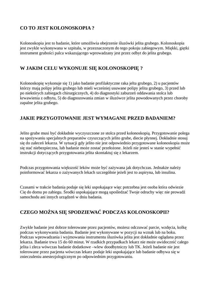 CO TO JEST KOLONOSKOPIA ? Kolonoskopia jest to badanie, które umożliwia obejrzenie śluzówki jelita grubego. Kolonoskopia jest zwykle wykonywana w szpitalu, w przeznaczonym do tego pokoju zabiegowym. Miękki, giętki instrument grubości palca wskazującego wprowadzany jest przez odbyt do jelita grubego. W JAKIM CELU WYKONUJE SIĘ KOLONOSKOPIĘ ? Kolonoskopię wykonuje się 1) jako badanie profilaktyczne raka jelta grubego, 2) u pacjentów którzy mają polipy jelita grubego lub mieli wcześniej usuwane polipy jelita grubego, 3) przed lub po niektórych zabiegach chirurgicznych, 4) do diagnostyki zaburzeń oddawania stolca lub krwawienia z odbytu, 5) do diagnozowania zmian w śluzówce jelita powodowanych przez choroby zapalne jelita grubego. JAKIE PRZYGOTOWANIE JEST WYMAGANE PRZED BADANIEM? Jelito grube musi być dokładnie wyczyszczone ze stolca przed kolonoskopią. Przygotowanie polega na spożywaniu specjalnych preparatów czyszczących jelito grube, diecie płynnej. Dokładnie stosuj się do zaleceń lekarza. W sytuacji gdy jelito nie jest odpowiednio przygotowane kolonoskopia może się stać niebezpieczna, lub badanie może zostać przełożone. Jeżeli nie jesteś w stanie wypełnić instrukcji dotyczących przygotowania jelita skontaktuj się z lekarzem. Podczas przygotowania większość leków może być zażywana jak dotychczas. Jednakże należy poinformować lekarza o zażywanych lekach szczególnie jeżeli jest to aspiryna, lub insulina. Czasami w trakcie badania podaje się leki uspokajaące więc potrzebna jest osoba która odwiezie Cię do domu po zabiegu. Środki uspokajające mogą upośledzać Twoje odruchy więc nie prowadź samochodu ani innych urządzeń w dniu badania. CZEGO MOŻNA SIĘ SPODZIEWAĆ PODCZAS KOLONOSKOPII? Zwykle badanie jest dobrze tolerowane przez pacjentów, możesz odczuwać parcie, wzdęcia, kolkę podczas wykonywania badania. Badanie jest wykonywane w pozycji na wznak lub na boku. Podczas wprowadzania i wyjmowania instrumentu śluzówka jelita jest dokładnie oglądana przez lekarza. Badanie trwa 15 do 60 minut. W rzadkich przypadkach lekarz nie może uwidocznić całego jelita i zleca wówczas badanie dodatkowe –wlew doodbytniczy lub TK. Jeżeli badanie nie jest tolerowane przez pacjenta wówczas lekarz podaje leki uspokajające lub badanie odbywa się w znieczuleniu anestezjologicznym po odpowiednim przygotowaniu. CO W PRZYPADKU JEŻELI KOLONOSKOPIA WYKAŻE PATOLOGIĘ? Jeżeli lekarz podczas badania zauważa podejrzaną okolicę może wykonać biopsję którą przesyła do badania histpatologicznego. Znajdowane polipy zwykle usuwa się podczas badania. Większość polipów ma charakter łagodny ale określane jest to dopiero po badaniu mikroskopowym. Polipy usuwa się używając koagulacji. Jeżeli polipów jest wiele lub mają one duże rozmiary do ich usunięcia może być wymagane kilka badań kolonoskopowych. Miejsca krwawienia mogą być zidentyfikowane podczas kolonoskopii i ostrzyknięte specjalnymi preparatami obliterującymi lub skoagulowane. Usuwanie polipów jest ważnym elementem zapobiegania rakowi jelita grubego. PO KOLONOSKOPII ? Po badaniu lekarz wyjaśni ci wyniki. Po badaniu możesz odczuwać wzdęcia i kurcze powodowane przez powietrze wprowadzone do jelita podczas badania. Uczucie to mija po oddaniu wiatrów. Po badaniu możesz odżywiać się i powrócić do normalnej aktywności życiowej tego samego dnia. Nie powinieneś prowadzić samochodu lub innych urządzeń w dniu badania jeśli otrzymałeś środki uspokajające. Jeżeli otrzymałeś środki uspokajające to pozostaniesz pod obserwacją przez 1-2 godziny. Będziesz potrzebował kogoś kto odwiezie Cię do domu po zabiegu. Jeżeli nie pamiętasz instrukcji które lekarz przekazał Ci po badaniu skontaktuj się z nim następnego dnia. Jeżeli podczas badania wykryto polipy będziesz wymagał/a kontrolnej kolonoskopii. Lekarz poinformuje Cię kiedy powinno wykonać się kontrolne badanie. JAKIE SĄ POWIKŁANIA BADANIA ? Kolonoskopia i biopsja są badaniami bezpiecznymi w rękach doświadczonego endoskopisty. Komplikacje są rzadkie jednakże mogą wystąpić. Należą do nich krwawienie z miejsca biopsji lub polipektomii oraz perforacja jelita. Perforacja może wymagać zabiegu operacyjnego do zaopatrzenia miejsca perforacji. Transfuzje krwi po badaniu kolonoskopwym należą do rzadkości. Bardzo rzadko występują objawy uboczne po podaniu leków uspokajających. Również w miejscu wkłucia do żyły może powstać bolesne zgrubienie. Do złagodzenia dolegliwości stosuje się ciepły, wilgotny okład na miejsce wkłucia. W przypadku gdy występują objawy takie jak: ból brzucha, gorączka, dreszcze lub krwawienie z odbytu w ilości więcej niż pół szklanki należy skontaktować się niezwłocznie z lekarzem. Podkrwawiania z odbytu mogą trwać do kilku dni po badaniu.