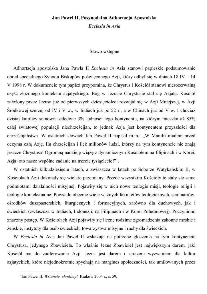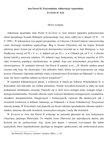 Jan Paweł II, Posynodalna Adhortacja Apostolska Ecclesia in Asia Słowo wstępne Adhortacja apostolska Jana Pawła II Ecclesia in Asia stanowi papieskie podsumowanie obrad specjalnego Synodu Biskupów poświęconego Azji, który odbył się w dniach 18 IV – 14 V 1998 r. W dokumencie tym papież przypomina, że Chrystus i Kościół stanowi nierozerwalną część złożonego kontekstu azjatyckiego. Bóg w Jezusie Chrystusie stał się Azjatą. Kościół założony przez Jezusa już od pierwszych dziesięcioleci rozwijał się w Azji Mniejszej, w Azji Środkowej szerzej od IV i V w., w Indiach już po 52 r., a w Chinach już od V w. I chociaż dzisiaj katolicy stanowią zaledwie 3% ludności tego kontynentu, na którym mieszka aż 85% całej światowej populacji niechrześcijan, to jednak Azja jest kontynentem przyszłości dla chrześcijaństwa. W ostatnich słowach Jan Paweł II napisał m.in.: „W Manilii miałem przed oczyma całą Azję. Ilu chrześcijan i ileż milionów ludzi, którzy na tym kontynencie nie znają jeszcze Chrystusa! Ogromną nadzieję wiążę z dynamicznym Kościołem na filipinach i w Korei. Azja: oto nasze wspólne zadanie na trzecie tysiąclecie!”1. W ostatnich kilkudziesięciu latach, a zwłaszcza w latach po Soborze Watykańskim II, w Kościołach Azji dokonały się wielkie przemiany. Przede wszystkim Kościoły te stały się same podmiotami działalności misyjnej. Pojawiły się w nich nowe teologie misji, teologie religii i teologie kontekstualne. Powstało obecnie wiele ważnych fakultetów teologicznych, seminariów, ośrodków duszpasterskich, liturgicznych i formacyjnych, zarówno dla duchowych, jak i świeckich (zwłaszcza w Indiach, Indonezji, na Filipinach i w Korei Południowej). Poczyniono znaczny postęp. W Kościołach Azji pojawiły się liczne rodzime zgromadzenia zakonne męskie i żeńskie, instytuty dla osób świeckich, towarzystwa misyjne i ruchy dla świeckich. W Ecclesia in Asia Jan Paweł II wskazuje na potrzebę głoszenia na tym kontynencie Chrystusa, jedynego Zbawiciela. To właśnie Jezus Zbawiciel jest największym darem, jaki Kościół ma do zaoferowania Azji. Jezus jest darem i zarazem wyzwaniem dla kultur azjatyckich, które niejednokrotnie spychają na margines społeczności, tak umiłowanych przez 1 Jan Paweł II, Wstańcie, chodźmy!, Kraków 2004 r., s. 59. Jezusa ubogich, „nieczystych”, dzieci czy zmarłych. Do dzisiaj Jezus jest prawdziwym „skandalem” dla kultury zdominowanej przez system kastowy, przez strach przed śmiercią, przez pogoń za „sukcesem”. Osoba Chrystusa budzi też kontrowersje przez ukazywanie prawdy, iż przez niego człowiek może w pełni zjednoczyć się z osobowym Bogiem – dobrym Ojcem. Podczas obrad Synodu Biskupów poświęconego Azji zwracano często uwagę na różnice kulturowe między Wschodem a Zachodem, które są źródłem wielu nieporozumień i braku akceptacji chrześcijaństwa w Azji. Stąd też w adhortacji posynodalnej Jan Paweł II zwrócił szczególną uwagę na problem inkulturacji Ewangelii w Azji. Papież przypomniał iż poszukiwania inkulturacyjne nie mają się zwracać tylko ku przeszłości (posługiwać się znakami dawnych tradycji), ale winny być otwarte na aktualną sytuację i potrzeby poszczególnych narodów azjatyckich (nr 22).mówiąc o inkulturacji w teologii papież przypomniał, że ojcowie Synodu zasugerowali nowe tytuły chrystologiczne, wiele znaczące dla mentalności azjatyckiej i pozostające w ścisłej łączności z tradycją biblijną (Jezus jako „Mistrz Mądrości”, „Uzdrowiciel”, „Wyzwoliciel”, „Przewodnik Duchowy”, „Oświecony”, „Współczujący”). Te tytuły wyrażają poszukiwanie „azjatyckiego oblicza Jezusa” i odwołują się do uniwersalnego wymiaru zbawienia, przyniesionego przez Jezusa. Azja, jak wielokrotnie podkreśla adhortacja, jest kontynentem wielu podziałów społecznych. Ta rzeczywistość domaga się podjęcia przez Kościół różnych wymiarów solidarności, począwszy od solidarności pomiędzy poszczególnymi Kościołami, po pomoc młodym Kościołom oraz Kościołom cierpiącym i prześladowanym (nr 28). Bezpośrednio papież wspomina Kościół w Chinach Ludowych. Wymienia też Kościół Korei Północnej (aby Północ i Południe pojednały się) oraz Kościół jerozolimski (aby zapewniał „pokój i integralność” miasta). Zachęca także do działalności na polu społecznym, gdyż kryzys ekonomiczny, kultura śmierci i zjawisko marginalizacji pomnażają ilość biednych ludzi, dzieci wykorzystywanych do pracy, zniewolonych kobiet, migrantów, itp. Troska o przestrzeganie praw ludzkich w takim kontekście jest wielkim wyzwaniem, którego Kościół „nie może odrzucić lub uniknąć” (nr 33). W ostatnim rozdziale adhortacji, zatytułowanym „Świadkowie Ewangelii”, kierując zaproszenie di zgromadzeń i instytutów misyjnych oraz diecezji, Jan Paweł II zachęca do wzmożenia wysiłku misyjnego na rzecz Azji. Papież podkreśla wielką rolę świeckich – zwłaszcza młodych – w dziele misyjnym (nr 46). Wśród ważnych narzędzi ewangelizacji papież wymienia m.in. środki społecznego przekazu. Jednak ponad wszystkimi środkami wspomina „wielką liczbę świadków wiary”, męczenników którzy są „nowym posiewem w każdym zakątku kontynentu” (nr 49). W niniejszej publikacji po raz pierwszy został zaprezentowany polskojęzyczny tekst adhortacji Ecclesia In Asia. Tuż po nim przedstawiono główne idee teologiczne adhortacji, umieszczone w kontekście miejscowego Kościoła. Następnie przedstawiono wybrane aspekty życia Kościoła w Chinach i Azji Środkowej, zaangażowanie polskich misjonarzy w Azji oraz wietnamską wspólnotę katolicką w Polsce. Kolejny blok tematyczny obejmuje problemy związane z dialogiem międzyreligijnym w Azji. Ostatnia część omawia przeszłość i współczesność sytuacji religijnej w Japonii. Publikacja ta