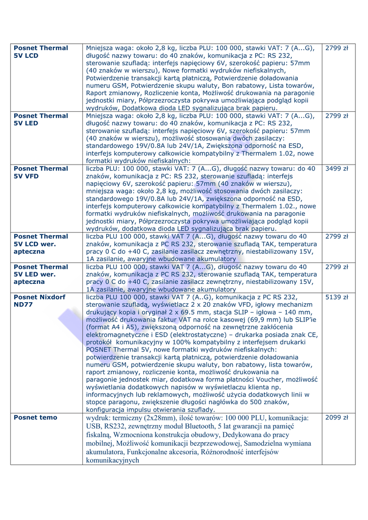Posnet Thermal 5V LCD Posnet Thermal 5V LED Posnet Thermal 5V VFD Posnet Thermal 5V LCD wer. apteczna Posnet Thermal 5V LED wer. apteczna Posnet Nixdorf ND77 Posnet temo Mniejsza waga: około 2,8 kg, liczba PLU: 100 000, stawki VAT: 7 (A...G), długość nazwy towaru: do 40 znaków, komunikacja z PC: RS 232, sterowanie szufladą: interfejs napięciowy 6V, szerokość papieru: 57mm (40 znaków w wierszu), Nowe formatki wydruków niefiskalnych, Potwierdzenie transakcji kartą płatniczą, Potwierdzenie doładowania numeru GSM, Potwierdzenie skupu waluty, Bon rabatowy, Lista towarów, Raport zmianowy, Rozliczenie konta, MoŜliwość drukowania na paragonie jednostki miary, Półprzezroczysta pokrywa umoŜliwiająca podgląd kopii wydruków, Dodatkowa dioda LED sygnalizująca brak papieru. Mniejsza waga: około 2,8 kg, liczba PLU: 100 000, stawki VAT: 7 (A...G), długość nazwy towaru: do 40 znaków, komunikacja z PC: RS 232, sterowanie szufladą: interfejs napięciowy 6V, szerokość papieru: 57mm (40 znaków w wierszu), moŜliwość stosowania dwóch zasilaczy: standardowego 19V/0.8A lub 24V/1A, Zwiększona odporność na ESD, interfejs komputerowy całkowicie kompatybilny z Thermalem 1.02, nowe formatki wydruków niefiskalnych: liczba PLU: 100 000, stawki VAT: 7 (A...G), długość nazwy towaru: do 40 znaków, komunikacja z PC: RS 232, sterowanie szufladą: interfejs napięciowy 6V, szerokość papieru: 57mm (40 znaków w wierszu), mniejsza waga: około 2,8 kg, moŜliwość stosowania dwóch zasilaczy: standardowego 19V/0.8A lub 24V/1A, zwiększona odporność na ESD, interfejs komputerowy całkowicie kompatybilny z Thermalem 1.02., nowe formatki wydruków niefiskalnych, moŜliwość drukowania na paragonie jednostki miary, Półprzezroczysta pokrywa umoŜliwiająca podgląd kopii wydruków, dodatkowa dioda LED sygnalizująca brak papieru. liczba PLU 100 000, stawki VAT 7 (A...G), długość nazwy towaru do 40 znaków, komunikacja z PC RS 232, sterowanie szufladą TAK, temperatura pracy 0 C do +40 C, zasilanie zasilacz zewnętrzny, niestabilizowany 15V, 1A zasilanie, awaryjne wbudowane akumulatory liczba PLU 100 000, stawki VAT 7 (A...G), długość nazwy towaru do 40 znaków, komunikacja z PC RS 232, sterowanie szufladą TAK, temperatura pracy 0 C do +40 C, zasilanie zasilacz zewnętrzny, niestabilizowany 15V, 1A zasilanie, awaryjne wbudowane akumulatory liczba PLU 100 000, stawki VAT 7 (A..G), komunikacja z PC RS 232, sterowanie szufladą, wyświetlacz 2 x 20 znaków VFD, igłowy mechanizm drukujący kopia i oryginał 2 x 69.5 mm, stacja SLIP – igłowa – 140 mm, moŜliwość drukowania faktur VAT na rolce kasowej (69,9 mm) lub SLIP’ie (format A4 i A5), zwiększoną odporność na zewnętrzne zakłócenia elektromagnetyczne i ESD (elektrostatyczne) – drukarka posiada znak CE, protokół komunikacyjny w 100% kompatybilny z interfejsem drukarki POSNET Thermal 5V, nowe formatki wydruków niefiskalnych: potwierdzenie transakcji kartą płatniczą, potwierdzenie doładowania numeru GSM, potwierdzenie skupu waluty, bon rabatowy, lista towarów, raport zmianowy, rozliczenie konta, moŜliwość drukowania na paragonie jednostek miar, dodatkowa forma płatności Voucher, moŜliwość wyświetlania dodatkowych napisów w wyświetlaczu klienta np. informacyjnych lub reklamowych, moŜliwość uŜycia dodatkowych linii w stopce paragonu, zwiększenie długości nagłówka do 500 znaków, konfiguracja impulsu otwierania szuflady. 2799 zł wydruk: termiczny (2x28mm), ilość towarów: 100 000 PLU, komunikacja: USB, RS232, zewnętrzny moduł Bluetooth, 5 lat gwarancji na pamięć fiskalną, Wzmocniona konstrukcja obudowy, Dedykowana do pracy mobilnej, MoŜliwość komunikacji bezprzewodowej, Samodzielna wymiana akumulatora, Funkcjonalne akcesoria, RóŜnorodność interfejsów komunikacyjnych 2099 zł 2799 zł 3499 zł 2799 zł 2799 zł 5139 zł Podane ceny są cenami netto, naleŜy do nich doliczyć 22% VAT.