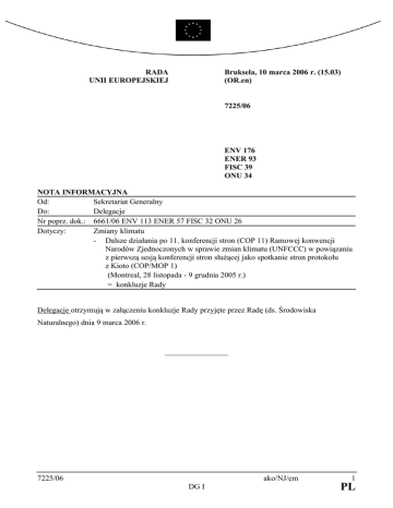 RADA UNII EUROPEJSKIEJ Bruksela, 10 marca 2006 r. (15.03) (OR.en) 7225/06 ENV 176 ENER 93 FISC 39 ONU 34 NOTA INFORMACYJNA Od: Sekretariat Generalny Do: Delegacje Nr poprz. dok.: 6661/06 ENV 113 ENER 57 FISC 32 ONU 26 Dotyczy: Zmiany klimatu - Dalsze działania po 11. konferencji stron (COP 11) Ramowej konwencji Narodów Zjednoczonych w sprawie zmian klimatu (UNFCCC) w powiązaniu z pierwszą sesją konferencji stron służącej jako spotkanie stron protokołu z Kioto (COP/MOP 1) (Montreal, 28 listopada - 9 grudnia 2005 r.) = konkluzje Rady Delegacje otrzymują w załączeniu konkluzje Rady przyjęte przez Radę (ds. Środowiska Naturalnego) dnia 9 marca 2006 r. ________________ 7225/06 ako/NJ/em DG I 1 PL ZAŁĄCZNIK Dalsze działania po 11. konferencji stron (COP 11) Ramowej konwencji Narodów Zjednoczonych w sprawie zmian klimatu (UNFCCC) w powiązaniu z pierwszą sesją konferencji stron służącą jako spotkanie stron protokołu z Kioto (COP/MOP 1) (Montreal, 28 listopada - 9 grudnia 2005 r.) - konkluzje Rady Rada Unii Europejskiej, 1. PODKREŚLA swoje głębokie zaangażowanie - zadeklarowane ostatnio przez Radę Europejską w grudniu 2005 r. - w przyspieszenie rozwiązywania problemu zmian klimatu; 2. Z ogromnym ZADOWOLENIEM PRZYJMUJE konstruktywny i dalekosiężny plan działania z Montrealu, opracowany podczas 11. konferencji stron (COP 11) Ramowej konwencji Narodów Zjednoczonych w sprawie zmian klimatu („konwencji”) oraz pierwszej sesji konferencji stron służącej jako spotkanie stron protokołu z Kioto (COP/MOP 1) (Montreal, 28 listopada - 9 grudnia 2005 r.), a zwłaszcza przyjęcie protokołów z Marrakeszu zawierających mechanizm oceny zgodności, ulepszenie działania konwencji oraz protokołu z Kioto, w szczególności mechanizmu czystego rozwoju (Clean Development Mechanism CDM) i mechanizmu wspólnego wypełniania zobowiązań (Joint Implementation JI), przyjęcie pięcioletniego programu prac nad adaptacją oraz dalsze działania w ramach konwencji i protokołu z Kioto; a także DOSTRZEGA z uznaniem rozpoczęcie procesu omawiania kwestii wylesiania w krajach rozwijających się, które jest przyczyną około 20% emisji światowych antropogenicznych gazów cieplarnianych; 3. PRZYJMUJE ZE szczególnym ZADOWOLENIEM decyzję o rozpoczęciu przez strony wymienione w załączniku I konwencji rozpatrywania dalszych zobowiązań na okres po roku 2012 zgodnie z art. 3 ust. 9 protokołu z Kioto oraz decyzję o podjęciu dialogu w sprawie długofalowych wspólnych działań w zakresie zmian klimatu, polegających na przyspieszeniu wdrażania konwencji, co pozwoli na wymianę doświadczeń oraz analizę podejść strategicznych; 7225/06 ZAŁĄCZNIK ako/NJ/em DG I 2 PL 4. NADAL JEST zdania, że w obydwu procesach należy kierować się podstawowym celem konwencji: ustabilizowanie koncentracji gazów cieplarnianych w atmosferze na poziomie, który zapobiegałby niebezpiecznej antropogenicznej ingerencji w system klimatyczny w okresie wystarczającym do naturalnej adaptacji ekosystemów do zmian klimatu, aby uniknąć zagrożenia produkcji żywności i umożliwić trwały rozwój ekonomiczny; PONOWNIE WYRAŻA OPINIĘ, że aby cel ten został osiągnięty, ogólna średnia światowa temperatura przy powierzchni ziemi nie powinna przekraczać poziomu sprzed okresu uprzemysłowienia o więcej niż 2°C i że konieczne będzie przeprowadzenie znacznej redukcji światowych emisji zgodnie z zasadą określania wspólnych, choć zróżnicowanych, zakresów odpowiedzialności i odpowiednich możliwości; ODNOTOWUJE, że redukcja emisji wymagać będzie, aby globalne emisje gazów cieplarnianych osiągnęły maksymalne wartości w ciągu najbliższych dwudziestu lat, a następnie aby uległy znacznemu obniżeniu o co najmniej 15%, a może nawet o 50% do roku 2050 w porównaniu do poziomów z roku 1990; ZAUWAŻA, że brak sukcesu w natychmiastowym przeprowadzeniu takich redukcji doprowadziłby do zwiększonego ryzyka wystąpienia nagłych zmian klimatu; WIERZY, że plan działania z Montrealu dostarcza odpowiednich środków do podjęcia dyskusji ze wszystkimi stronami na temat metod i środków pozwalających na osiągnięcie tego celu; 5. PODKREŚLA, że konieczne jest zapewnienie kluczowej roli światowego rynku emisji związków węgla oraz ciągłego i skutecznego funkcjonowania elastycznych mechanizmów, co umożliwi przeprowadzenie znacznych redukcji emisji w sposób efektywny pod względem kosztów oraz przyspieszy rozwój, ukierunkowanie oraz transfer technologii, praktyk i procesów przyjaznych klimatowi; w związku z tym PRZYPOMINA o potrzebie zajęcia się zagadnieniem długoterminowej pewności stanowiącej część przeglądu systemu UE handlu uprawnieniami do emisji oraz o swoim zamiarze powiązania tego systemu z innymi systemami handlu uprawnieniami do emisji, po to by ustanowić efektywny światowy rynek uprawnień do emisji. 7225/06 ZAŁĄCZNIK ako/NJ/em DG I 3 PL 6. PRZYPOMINA, że Rada (ds. Środowiska Naturalnego), która zebrała się w grudniu 2004 r. oraz w marcu 2005 r., a także Rada Europejska na swoim wiosennym posiedzeniu w 2005 r. rozpoczęły przygotowywanie średnio- i długofalowej strategii UE, nastawionych na zwalczanie zmian klimatu i zgodnych z celem polegającym na nieprzekraczaniu 2°C; bez uszczerbku dla nowych metod różnicowania stron w przyszłych, uczciwych i elastycznych ramach PODKREŚLA swój zamiar zbadania wraz z innymi stronami strategii osiągnięcia koniecznych redukcji emisji i POTWIERDZA, że w tym kontekście należy przeanalizować sposoby zmniejszania emisji przez grupę państw rozwiniętych, tak aby emisje zostały obniżone o 15-30% do roku 2020 w porównaniu z punktem odniesienia wyznaczonym w protokole z Kioto i do roku 2050 zgodnie z konkluzjami Rady (ds. Środowiska Naturalnego) z marca 2005 r.; w związku z tym OCZEKUJE, że Komisja przeprowadzi dalszą analizę korzyści oraz kosztów związanych ze strategiami redukcj