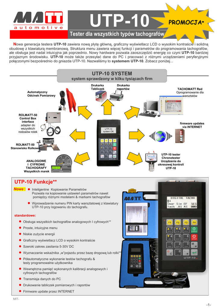 UTP-10 PROMOCJA* Tester dla wszystkich typów tachografów Nowa generacja testera UTP-10 zawiera nową płytę główną, graficzny wyświetlacz LCD o wysokim kontraście i solidną obudowę z klawiaturą membranową. Struktura menu zawiera więcej funkcji i parametrów do programowania tachografów, ale obsługa jest nadal intuicyjna jak poprzednio. Nowy hardware pozwala zaoszczędzić energię co czyni UTP-10 bardziej przyjaznym środowisku. UTP-10 może także przesyłać dane do PC i pracować z różnymi urządzeniami peryferyjnymi połączonymi bezpośrednio do gniazda UTP-10. Nazwaliśmy to systemem UTP-10. Zobacz poniżej... UTP-10 SYSTEM system sprawdzony w kilku tysiącach firm Drukarka Tabliczek Drukarka raportów Automatyczny Odcinek Pomiarowy ROLMATT-50 Control Box interface adapter do wszystkich rodzajów rolek TACHOMATT Red Oprogramowanie dla warsztatów firmware updates via INTERNET ROLMATT-50 Stanowisko Rolkowe ANALOGOWE I CYFROWE TACHOGRAFY Wszystkich marek UTP-10 tester Chronotester Urządzenie do okresowej kontroli UTP-10 UTP-10 Funkcje** Nowe : Inteligentne Kopiowanie Parametrów Pozwala na kopiowanie ustawień parametrów nawet pomiędzy różnymi modelami & markami tachografów Wprowadzenie numeru PIN karty warsztatowej z klawiatury UTP-10 przy logowaniu do tachografu. standardowe: Obsługa wszystkich tachografów analogowych I cyfrowych** Proste, intuicyjne menu Niskie zużycie energii Graficzny wyświetlacz LCD o wysokim kontraście Szeroki zakres zasilania 5-30V DC Wyznaczanie wskaźnika „w”pojazdu przez bazę drogową lub rolki** Półautomatyczne wykonanie testów tachografu & testy programowalne użytkownika Wewnętrzna pamięć wykonanych kalibracji analogowych i cyfrowych tachografów Transmisja danych do PC Drukowanie tabliczek pomiarowych i raportów Firmware update przez INTERNET MIT- -1- UTP-10 charaktyrystyka techniczna **: napięcie operacyjne: 5 – 30 V DC (4xAA akum., lub 4x AA baterie alkaliczne, lub gniazdo zewnętrzne zapalniczki samochodu 12/24V lub DC zasilacz ) – Czas na ładowanie nie jest konieczny-wymień baterie lub podłącz do zużycie energii: max 1,0 W ( czas pracy min. 15 godzin na pełnych bateriach ) wymiary: WxHxB waga: 0,4 kg włączając baterie temperatura pracy: -5 ... +55 °C względna wilgotność: 10 ... 95 % gniazda zapalniczki samochodowej 203x100x40 stopień ochrony: IP-40 ___________________________________________________________________________________ wyświetlacz: LCD FSTN wyświetlacz graficzny, 128 x 64dots, białe podświetlenie, dwa rodzaje czcionek klawiatura: membranowa klawiatura., 20 klawiszy (4klawisze funkcjonalne) wbudowany interfejs: RS 232, K-line, KWP 2000 protocol, źródło częstotliwości: wewnętrzny, wysokiej stabilności generator TCXO +/- 1,5 ppm (jest wykorzystywany podczas Testu Zegara Tachografu – kilkadziesiąt razy bardziej stabilny niż inne testery) ___________________________________________________________________________________ wyznaczanie współczynnika W pojazdu przez: odcinek pomiarowy 20m... 10 000m, ( WI- pełne impulsy, WII impulsy ułamkowe ) ręcznie lub przez Automatyczny Odcinek Pomiarowy stanowisko rolkowe 2,5 ...50 km/h, ( ROLMATT-50 control box interfejs - pomiar przeprowadzany na dwóch kołach) zliczanie obrotów na odcinku pomiarowym za pomocą przetwornika ( 8/10imp/obr lub 50/100imp/obr ) zakres pomiaru współczynnika w 300... 15 000 rot/km (dla tachografu mechanicznego) zakres pomiaru stałej k 2400... 65 535 imp/km, jednostka 1imp/km zakres zliczenia impulsów 1... 16 000 000 imp symulacja prędkości 0,1 ... 250 km/h, jednostka 0,1km/h , k=2400...25 000 imp/km symulacja przebytej drogi 100... 99 999m jednostka 1m pomiar odchyłki zegara tachografu +/- 120s/24h jednostka 0,1s/24h (sonda chronokomparatora, D-gniazdo) ___________________________________________________________________________________ 4 programowalne półautomatyczne testy, 24 kroki każdy (prędkość, czas, aktywność, dystans) – ustawiane w zależności od obowiązującego prawa ustalone testy do tachografów cyfrowych I analogowych pamięć wykonanych kalibracji (16 cyfrowych + 8 analogowych ) przeliczanie przełączników DIL na stałą k i odwrotnie Promocyjny zestaw zawiera: UTP-10 LIGHT tester; 1381,SE5000, SmarTach, EFAS-3 Function Set; cztery kable, instrukcję - Szybki start, 4 xAA baterie + ładowarkę, małą walizkę. Kabel M1 (tachografy cyfrowe); * - promocja ważna do : 30.11.2010 ** - zależy od zamówionej wersji Kabel L1 (VR2400); Kabel K (1324) Kabel F3 (zasilanie zewnętrzne UTP-10 z gniazda zapal.sam.+ AOP gniazdo); Zapytaj swojego dystrybutora o promocję: Czy wiedziałeś ? Homologacja pierwszej generacji UTP-10, MATT była w roku 1999. Mamy więc ponad 10 letnie doświadczenie w testerach tachografów. Inżynierowie MATT ciągle rozwijają tester UTP-10, bazując na doświadczeniu naszych klientów i techników serwisu tachografów MATT. Tak więc… UTP-10 jest taki jaki powinien być: ► łatwy w użyciu, ► szybki w obsłudze, ► nowoczesny i wydajny -2-