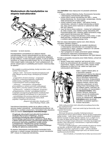 Wademekum dla kandydatów na stopnie instruktorskie Instruktor – to brzmi dumnie… Prawdopodobnie rozważałaś/eś już zdobycie stopnia instruktorskiego. Pewnie zastanawiałaś/eś się nad tym, jakie korzyści przyniesie Ci ten stopień, jakie uprawnienia nabędziesz po jego zdobyciu. A może zwyczajnie uważasz, że jest to kolejne wyzwanie na Twojej harcerskiej drodze? No i to, że zdobyty przez Ciebie stopień będzie motywacją dla Twoich podopiecznych, bo pewnie zaimponujesz im podkładką pod krzyżem i kolorową lilijką na rękawie? Bez względu na pełnioną funkcję, każdy instruktor wobec zuchów i harcerzy jest: - jednym z nich – harcerzem również pracującym nad sobą, idącym tą samą drogą i dzielącym jej wszelkie trudy, - przyjacielem i bratem (siostrą) – związanym uczuciowo, serdeczną przyjaźnią i zaufaniem, solidarnością, wspólnymi marzeniami i wspomnieniami razem przebytej drogi, - „mistrzem” – autorytetem, wiarygodnym przewodnikiem w świecie wartości, wskazującym drogę dobra, prawdy i piękna, po której sam idzie, - wychowawcą – mądrym i wrażliwym „terapeutą”, „przyspieszaczem rozwoju”, potrafiącym dostrzec i rozumieć wewnętrzne przeobrażenia i trudności jego młodych przyjaciół, potrafiącym im w tym pomóc, - samodzielnym (bez pomocy odgórnej), świadomym i odpowiedzialnym organizatorem harcerskich zespołów i inspiratorem ich pracy. „Stopnie instruktorskie. Książka prób”. Ruch Płaskiego Węzła, 1986. Instruktorem/instruktorką zostaje się po odbyciu próby na pierwszy stopień instruktorski – przewodnika/przewodniczki i jej zamknięciu z wynikiem pozytywnym. Komendant hufca dopuszcza wtedy do złożenia Zobowiązania Instruktorskiego: Przyjmuję obowiązki instruktorki/instruktora Związku Harcerstwa Polskiego. Jestem świadoma/świadomy odpowiedzialności harcerskiego wychowawcy i opiekuna. Będę dbać o dobre imię harcerstwa, przestrzegać Statutu ZHP, pracować nad sobą, pogłębiać swoją wiedzę i umiejętności. Wychowam swego następcę. Powierzonej przez Związek Harcerstwa Polskiego służby nie opuszczę samowolnie. Po złożeniu Zobowiązania Instruktorskiego komendant hufca przyjmuje w rozkazie nowego instruktora w poczet instruktorów ZHP i wręcza mu książeczkę instruktorską. Jako instruktor masz więcej praw niż pozostali członkowie związku: możesz odbierać Obietnicę Zucha, Przyrzeczenie Harcerskie i Zobowiązanie Instruktorskie (§20 Statutu), możesz pełnić funkcję instruktorską (do 2001 r. zwaną funkcją statutową), np. drużynowego, szczepowego, członka władz powierzanych w trybie wyboru, możesz wybierać swoje władze – jeśli pełnisz funkcję instruktorską i zaliczono Ci służbę instruktorską za ostatni rok, masz czynne prawo wyborcze w wyborach do władz ZHP (§37 Statutu), masz też bierne prawo wyborcze – możesz być wybierana/y do władz związku, choć niektóre funkcje (Naczelnika ZHP, Przewodniczącego ZHP i członków sądów harcerskich) mogą pełnić jedynie harcmistrzowie (§37 Statutu), 1/3 pełniących funkcje instruktorskie w hufcu może, w razie takiej potrzeby, wnioskować do komendanta chorągwi o zwołanie zjazdu nadzwyczajnego hufca Masz też więcej obowiązków (oprócz tych, które dotyczą wszystkich członków związku): masz obowiązek kierowania się zasadami określonymi w Zobowiązaniu Instruktorskim oraz szczególnej troski o powierzone Ci dzieci i młodzież, zwłaszcza o ich zdrowie i bezpieczeństwo (§21 Statutu), chęć wystąpienia ze związku powinieneś zgłosić składając oświadczenie właściwemu komendantowi hufca, komendantowi chorągwi lub Naczelnikowi ZHP (§26 Statutu). Ponadto w przypadku naruszania przez Ciebie Statutu, uchwał lub decyzji władz: sprawę Twoją może rozpatrzyć sąd harcerski hufca, oprócz kar przewidzianych dla wszystkich członków związku (upomnienie, nagany, wykluczenia z ZHP), możesz zostać pozbawiony na okres do 4 lat, całości lub części praw członkowskich (§28 Statutu). Jeden z zapisów Statutu głosi, że w harcerskim systemie wychowawczym istotną rolę odgrywa osobisty przykład instruktora. Jest on warunkiem skuteczności metody harcerskiej. Swoją postawą instruktor powinien dawać przykład osiągania wartości, którym służy harcerstwo, pokazywać, że życie według Prawa Harcerskiego może być źródłem radości. Instruktor nie jest ani dowódcą, ani nauczycielem – jest starszym bratem, który zuchowi, harcerce, harcerzowi stwarza warunki do kształtowania charakteru i jest dla niego/niej wzorem do naśladowania. Autorytet instruktora opiera się przede wszystkim na postawie zgodnej z Prawem Harcerskim. Jakie cechy powinien mieć człowiek prowadzący harcerską pracę wychowawczą? Odpowiedź prosta – musi sam umieć żyć po harcersku, musi rozumieć harcerstwo. Co to znaczy? Kierować się zawsze, wszędzie, bezkompromisowo drogowskazem Prawa Harcerskiego. Starać się być przyjacielem całego świata – ludzi, Ziemi, natury, w przeszłości i przyszłości. Patrzeć uważnie na ludzi, Ziemię i naturę, na to, co było i na to, do czego się dąży, pod ich kątem widzenia, nie pod własnym. Starać się pomagać innym odczuwać i rozumieć, by postępować zgodnie z tym odczuciem i rozumieniem w myśl harcerskiego wezwania „Czuwaj”. (…) Cech tych i wypływającego z nich stosunku do życia nie można się nauczyć, przyswoić sobie tylko zewnętrznie. Trzeba je odnaleźć i rozwinąć, wychować w sobie – jeśli się odnaleźć dadzą. Jeśli jest się pozbawionym tych cech, nie można zostać wychowawcą harcerskim. Ewa Grodecka „O metodzie harcerskiej i jej stosowaniu” Stopnie instruktorskie są zdobywane praktycznie od początków harcerstwa. Są odzwierciedleniem poziomu wiedzy, dojrzałości społecznej i umiejętności wychowawczych instruktora. Zdobywając kolejne stopnie, nabywasz kolejne uprawnienia, wynikające 