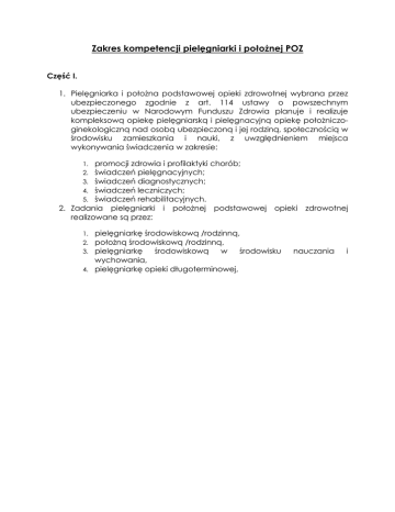 Zakres kompetencji pielęgniarki i połoŜnej POZ Część I. 1. Pielęgniarka i połoŜna podstawowej opieki zdrowotnej wybrana przez ubezpieczonego zgodnie z art. 114 ustawy o powszechnym ubezpieczeniu w Narodowym Funduszu Zdrowia planuje i realizuje kompleksową opiekę pielęgniarską i pielęgnacyjną opiekę połoŜniczoginekologiczną nad osobą ubezpieczoną i jej rodziną, społecznością w środowisku zamieszkania i nauki, z uwzględnieniem miejsca wykonywania świadczenia w zakresie: promocji zdrowia i profilaktyki chorób; świadczeń pielęgnacyjnych; świadczeń diagnostycznych; świadczeń leczniczych; świadczeń rehabilitacyjnych. 2. Zadania pielęgniarki i połoŜnej podstawowej realizowane są przez: 1. 2. 3. 4. 5. opieki zdrowotnej 1. pielęgniarkę środowiskową /rodzinną, 2. połoŜną środowiskową /rodzinną, 3. pielęgniarkę środowiskową w środowisku wychowania, 4. pielęgniarkę opieki długoterminowej, nauczania i Część II. A. Zakres kompetencji pielęgniarki środowiskowej/rodzinnej Pielęgniarka środowiskowa/rodzinna planuje i realizuje kompleksową opiekę pielęgniarską nad jednostką, rodziną, społecznością w środowisku zamieszkania z uwzględnieniem miejsca wykonywania świadczenia obejmując opieką: 1. zdrowych i chorych niezaleŜnie od płci i wieku, 2. osoby niepełnosprawne, 3. osoby w stanie terminalnym. W realizacji świadczeń zdrowotnych pielęgniarka środowiskowa/rodzinna współpracuje z: 1. 2. 3. 4. 5. 6. 7. lekarzem podstawowej opieki zdrowotnej/rodzinnym, pielęgniarką w środowisku nauczania i wychowania, połoŜną środowiskową/rodzinną, pielęgniarką/połoŜną praktyki, pielęgniarką opieki długoterminowej, innymi Świadczeniodawcami zgodnie z potrzebami podopiecznych, przedstawicielami organizacji i instytucji działających na rzecz zdrowia rodziny. 1. Świadczenia w zakresie promocji zdrowia i profilaktyki. 1. Rozpoznawanie, ocena i zapobieganie zagroŜeniom zdrowotnym podopiecznych. 2. Rozpoznawanie potrzeb pielęgnacyjnych i problemów zdrowotnych podopiecznych. 3. Prowadzenie edukacji zdrowotnej w tym dokonywanie oceny poziomu wiedzy, umiejętności i motywacji podopiecznych do zachowań prozdrowotnych. 4. Prowadzenie poradnictwa w zakresie zdrowego stylu Ŝycia. 5. Realizacja programów promocji zdrowia i profilaktyki chorób. 6. Organizacja grup wsparcia. 7. Realizacja szczepień ochronnych 8. Prowadzenie działań profilaktycznych u podopiecznych z grup ryzyka zdrowotnego. 2. Świadczenia diagnostyczne. 1. 2. 3. 4. 5. 6. Przeprowadzanie wywiadów środowiskowych. Wykonywanie badania fizykalnego. Wykonywanie pomiarów i ich ocena. Wykonywanie testów. Prowadzenie bilansu wodnego Ocena stanu ogólnego chorego oraz procesu jego zdrowienia 7. Ocena i monitorowanie bólu w opiece paliatywnej 3. Świadczenia pielęgnacyjne. 1. Realizacja opieki pielęgnacyjnej u pacjentów w róŜnych fazach Ŝycia i choroby zgodnie z aktualną wiedzą medyczną i współczesnymi standardami opieki pielęgniarskiej. 2. Wykonywanie zabiegów pielęgnacyjnych. 3. Przygotowywanie do samoopieki i samopielęgnacji w chorobie i niepełnosprawności. 4. Świadczenia lecznicze. Ustalanie diety w Ŝywieniu przewlekle chorych Dobór technik karmienia w zaleŜności od stanu chorego Zabiegi z zastosowaniem ciepła i zimna Cewnikowanie pęcherza u kobiet (u męŜczyzn po przeszkoleniu). Wykonywanie wlewów doodbytniczych. Podawanie leków róŜnymi drogami i technikami. Wykonywanie zleceń lekarskich. Zakładanie opatrunków ran, odleŜyn, oparzeń. Wykonywanie zabiegów pielęgnacyjno-leczniczych w stomiach, przetokach i ranach trudno gojących 10. Wykonywanie inhalacji, doraźne podawanie tlenu. 11. Zdejmowanie szwów. 12. Stawianie baniek lekarskich. 13. Udzielanie pierwszej pomocy w stanach zagroŜenia Ŝycia i w nagłych zachorowaniach w tym prowadzenie resuscytacji krąŜeniowo-oddechowej. 5. Świadczenia usprawniające. 1. 2. 3. 4. 5. 6. 7. 8. 9. 1. Koordynacja i współdziałanie w rehabilitacji przyłóŜkowej w celu zapobiegania powikłaniom wynikającym z procesu chorobowego, długotrwałego unieruchomienia i stosowania udogodnień. 2. Usprawnienie ruchowe. 3. DrenaŜ ułoŜeniowy, prowadzenie gimnastyki oddechowej. 4. Ćwiczenia ogólnousprawniające. B. Zakres kompetencji połoŜnej środowiskowej/rodzinnej PołoŜna środowiskowa/rodzinna realizuje kompleksową pielęgnacyjną opiekę połoŜniczo-ginekologiczną obejmującą: 1. 2. 3. 4. 5. edukację w zakresie planowania rodziny, opiekę w okresie ciąŜy, porodu i połogu opiekę nad kobietą, noworodkiem, niemowlęciem i rodziną, opiekę w schorzeniach ginekologicznych i onkologicznych, opiekę nad kobieta w kaŜdym okresie jej Ŝycia. W realizacji świadczeń współpracuje z: zdrowotnych połoŜna środowiskowa/rodzinna 1. lekarzem 2. 3. 4. 5. 6. 7. 8. ginekologiem / połoŜnikiem udzielającym świadczeń specjalistycznych w obszarze jej działania, pielęgniarką/połoŜną praktyki lekarzem podstawowej opieki zdrowotnej/rodzinnym, pielęgniarką środowiskową/rodzinną, pielęgniarką w środowisku nauczania i wychowania, pielęgniarką opieki długoterminowej, innymi Świadczeniodawcami zgodnie z potrzebami podopiecznych, przedstawicielami organizacji i instytucji działających na rzecz zdrowia rodziny. 1. Świadczenia w zakresie promocji zdrowia i profilaktyki 1. Diagnozowanie, ocena i zapobieganie zagroŜeniom zdrowotnym kobiet w przebiegu ciąŜy. zagroŜeń zdrowotnych wynikających z działania czynników szkodliwych w środowisku. Edukacja kobiety we wszystkich okresach Ŝycia do prowadzenia samoobserwacji, do podejmowania działań wczesnego wykrywania i likwidacji czynników ryzyka nowotworowego. Poradnictwo w zakresie samoopieki i samopielęgnacji w zdrowiu, profilaktyce chorób. Edukacji prozdrowotna. Organizacja grup wsparcia. Prowadzenie czynnego poradnictwa w zakresie profilaktyki chorób wieku dziecięcego i chorób ginekologicznych, onkologicznyc