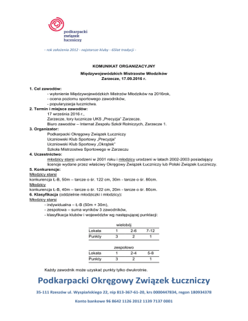 - rok założenia 2012 - najstarsze kluby - 65lat tradycji - KOMUNIKAT ORGANIZACYJNY Międzywojewódzkich Mistrzostw Młodzików Zarzecze, 17.09.2016 r. 1. Cel zawodów: - wyłonienie Międzywojewódzkich Mistrzów Młodzików na 2016rok, - ocena poziomu sportowego zawodników, - popularyzacja łucznictwa. 2. Termin i miejsce zawodów: 17 września 2016 r., Zarzecze, tory łucznicze UKS „Precyzja” Zarzecze. Biuro zawodów – Internat Zespołu Szkół Rolniczych, Zarzecze 1. 3. Organizator: Podkarpacki Okręgowy Związek Łuczniczy Uczniowski Klub Sportowy „Precyzja” Uczniowski Klub Sportowy „Okrążek” Szkoła Mistrzostwa Sportowego w Zarzeczu 4. Uczestnictwo: młodzicy starsi urodzeni w 2001 roku i młodzicy urodzeni w latach 2002-2003 posiadający licencje wydane przez właściwy Okręgowy Związek Łuczniczy lub Polski Związek Łuczniczy. 5. Konkurencje: Młodzicy starsi konkurencja Ł-B, 50m – tarcze o śr. 122 cm, 30m - tarcze o śr. 80cm. Młodzicy konkurencja Ł-B, 40m – tarcze o śr. 122 cm, 20m - tarcze o śr. 80cm. 6. Klasyfikacja (oddzielnie młodziczki i młodzicy): Młodzicy starsi - indywidualna – Ł-B (50m + 30m), - zespołowa – suma wyników 3 zawodników, - klasyfikacja klubów i województw wg następującej punktacji: wielobój Lokata 1 2-6 7-12 Punkty 3 2 1 zespołowo Lokata 1 2-4 5-8 Punkty 3 2 1 Każdy zawodnik może uzyskać punkty tylko dwukrotnie. Podkarpacki Okręgowy Związek Łuczniczy 35-111 Rzeszów ul. Wyspiańskiego 22, nip 813-367-61-20, krs 0000447834, regon 180934378 Konto bankowe 96 8642 1126 2012 1139 7137 0001 - rok założenia 2012 - najstarsze kluby - 65lat tradycji - Młodzicy - indywidualna – Ł-B (40m + 20m), - zespołowa – suma wyników 3 zawodników, - klasyfikacja klubów i województw wg następującej punktacji: wielobój Lokata 1 2-6 7-24 Punkty 3 2 1 zespołowo Lokata 1 2-6 7-12 Punkty 3 2 1 Każdy zawodnik może uzyskać punkty tylko dwukrotnie. 7. Tytuły i wyróżnienia: a) indywidualnie za I miejsce przyznany zostanie tytuł Międzywojewódzkiego Mistrza Młodzików na rok 2016, za II i III miejsce odpowiednio tytuły V-ce Mistrza i II-go V-ce Mistrza. - za miejsca 1-3 medale - za miejsca 1-12 dyplomy b) zespołowo za I miejsce przyznany zostanie tytuł Międzywojewódzkiego Mistrza Młodzików na rok 2016, za II i III miejsce odpowiednio tytuły V-ce Mistrza i II-go V-ce Mistrza. - za miejsca 1-3 medale - za miejsca 1-8 dyplomy c) za miejsca 1-6 w końcowej klasyfikacji klubów i województw puchary i dyplomy. 8. Zgłoszenia: - do dnia 10.09.2016 r. na adres email: [email protected] z podaniem numerów licencji zawodników. Istnieje możliwość zakwaterowania (24 zł) i całodziennego wyżywienia (26 zł od kolacji w piątek do obiadu w sobotę) w schronisku młodzieżowym w Zarzeczu. 9. Inne: - każdy klub lub województwo może zgłosić pisemnie dowolną liczbę zespołów (składających się z 3-4 zawodników) przed rozpoczęciem zawodów bez prawa do późniejszych zmian składów. - zawodnik zostanie dopuszczony do udziału w zawodach po okazaniu aktualnego badania lekarskiego oraz licencji OZŁucz. lub PZŁucz., - w zawodach obowiązuje regulamin łucznictwa tarczowego, - uczestników zawodów obowiązuje ubezpieczenie we własnym zakresie, - organizator nie ponosi odpowiedzialności za rzeczy pozostawione bez nadzoru, Podkarpacki Okręgowy Związek Łuczniczy 35-111 Rzeszów ul. Wyspiańskiego 22, nip 813-367-61-20, krs 0000447834, regon 180934378 Konto bankowe 96 8642 1126 2012 1139 7137 0001 - rok założenia 2012 - najstarsze kluby - 65lat tradycji - PROGRAM ZAWODÓW: 17 września (sobota) 08.30 – zgłaszanie zawodników i odprawa techniczna, 09.00 – rozpoczęcie strzelań na pierwszej odległości dziewczęta (2 serie próbne), 10.30 – rozpoczęcie strzelań na pierwszej odległości chłopcy (2 serie próbne), 12.30 – uroczyste rozpoczęcie zawodów w przerwie pomiędzy odległościami, 13.00 – rozpoczęcie strzelań na drugiej odległości dziewczęta (2 serie próbne), 14.30– rozpoczęcie strzelań na drugiej odległości chłopcy (2 serie próbne), 16.30 - zakończenie zawodów, obiad, 17.30 - wręczenie medali i dyplomów. Program zawodów może ulec zmianie w zależności od ilości zgłoszonych zawodników. Podkarpacki Okręgowy Związek Łuczniczy 35-111 Rzeszów ul. Wyspiańskiego 22, nip 813-367-61-20, krs 0000447834, regon 180934378 Konto bankowe 96 8642 1126 2012 1139 7137 0001