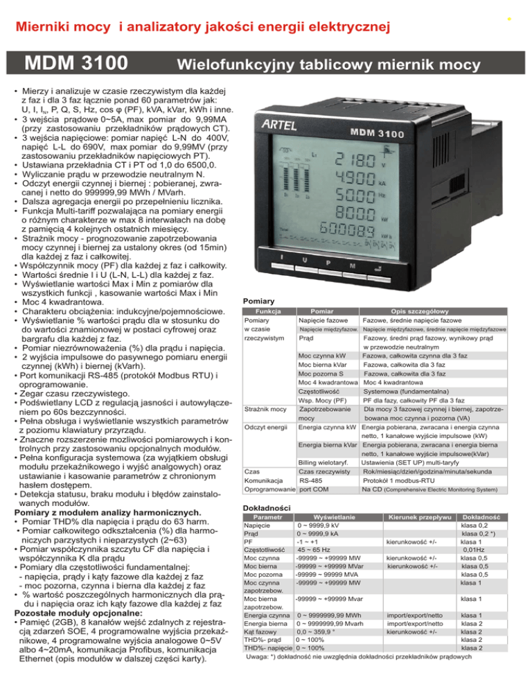 Mierniki mocy i analizatory jakości energii elektrycznej Wielofunkcyjny tablicowy miernik mocy MDM 3100 Wielofunkcyjny tablicowy miernik mocy • Mierzy i analizuje w czasie rzeczywistym dla każdej z faz i dla 3 faz łącznie ponad 60 parametrów jak: U, I, IN, P, Q, S, Hz, cos φ (PF), kVA, kVar, kWh i inne. • 3 wejścia prądowe 0~5A, max pomiar do 9,99MA (przy zastosowaniu przekładników prądowych CT). • 3 wejścia napięciowe: pomiar napięć L-N do 400V, napięć L-L do 690V, max pomiar do 9,99MV (przy zastosowaniu przekładników napięciowych PT). • Ustawiana przekładnia CT i PT od 1,0 do 6500,0. • Wyliczanie prądu w przewodzie neutralnym N. • Odczyt energii czynnej i biernej : pobieranej, zwracanej i netto do 999999,99 MWh / MVarh. • Dalsza agregacja energii po przepełnieniu licznika. • Funkcja Multi-tariff pozwalająca na pomiary energii o różnym charakterze w max 8 interwałach na dobę z pamięcią 4 kolejnych ostatnich miesięcy. • Strażnik mocy - prognozowanie zapotrzebowania mocy czynnej i biernej za ustalony okres (od 15min) dla każdej z faz i całkowitej. • Współczynnik mocy (PF) dla każdej z faz i całkowity. • Wartości średnie I i U (L-N, L-L) dla każdej z faz. • Wyświetlanie wartości Max i Min z pomiarów dla wszystkich funkcji , kasowanie wartości Max i Min • Moc 4 kwadrantowa. • Charakteru obciążenia: indukcyjne/pojemnościowe. • Wyświetlanie % wartości prądu dla w stosunku do do wartości znamionowej w postaci cyfrowej oraz bargrafu dla każdej z faz. • Pomiar niezrównoważenia (%) dla prądu i napięcia. • 2 wyjścia impulsowe do pasywnego pomiaru energii czynnej (kWh) i biernej (kVarh). • Port komunikacji RS-485 (protokół Modbus RTU) i oprogramowanie. • Zegar czasu rzeczywistego. • Podświetlany LCD z regulacją jasności i autowyłączeniem po 60s bezczynności. • Pełna obsługa i wyświetlanie wszystkich parametrów z poziomu klawiatury przyrządu. • Znaczne rozszerzenie mozliwości pomiarowych i kontrolnych przy zastosowaniu opcjonalnych modułów. • Pełna konfiguracja systemowa (za wyjątkiem obsługi modułu przekaźnikowego i wyjść analgowych) oraz ustawianie i kasowanie parametrów z chronionym hasłem dostępem. • Detekcja statusu, braku modułu i błędów zainstalowanych modułów. Pomiary z modułem analizy harmonicznych. • Pomiar THD% dla napięcia i prądu do 63 harm. • Pomiar całkowitego odkształcenia (%) dla harmoniczych parzystych i nieparzystych (2~63) • Pomiar współczynnika szczytu CF dla napięcia i współczynnika K dla prądu • Pomiary dla częstotliwości fundamentalnej: - napięcia, prądy i kąty fazowe dla każdej z faz - moc pozorna, czynna i bierna dla każdej z faz • % wartość poszczególnych harmonicznych dla prądu i napięcia oraz ich kąty fazowe dla każdej z faz Pozostałe moduły opcjonalne: • Pamięć (2GB), 8 kanałów wejść zdalnych z rejestracją zdarzeń SOE, 4 programowalne wyjścia przekaźnikowe, 4 programowalne wyjścia analogowe 0~5V albo 4~20mA, komunikacja Profibus, komunikacja Ethernet (opis modułów w dalszej części karty). Pomiary Funkcja Pomiary w czasie rzeczywistym Pomiar Napięcie fazowe Opis szczegółowy Fazowe, średnie napięcie fazowe Napięcie międzyfazow. Napięcie międzyfazowe, średnie napięcie międzyfazowe Prąd Fazowy, średni prąd fazowy, wynikowy prąd w przewodzie neutralnym Moc czynna kW Fazowa, całkowita czynna dla 3 faz Moc bierna kVar Fazowa, całkowita dla 3 faz Moc pozorna S Fazowa, całkowita dla 3 faz Moc 4 kwadrantowa Moc 4 kwadrantowa Częstotliwość Systemowa (fundamentalna) Wsp. Mocy (PF) PF dla fazy, całkowity PF dla 3 faz Strażnik mocy Zapotrzebowanie Dla mocy 3 fazowej czynnej i biernej, zapotrzemocy bowana moc czynna i pozorna (VA) Odczyt energii Energia czynna kW Energia pobierana, zwracana i energia czynna netto, 1 kanałowe wyjście impulsowe (kW) Energia bierna kVar Energia pobierana, zwracana i energia bierna netto, 1 kanałowe wyjście impulsowe(kVar) Billing wielotaryf. Ustawienia (SET UP) multi-taryfy Czas Czas rzeczywisty Rok/miesiąc/dzień/godzina/minuta/sekunda Komunikacja RS-485 Protokół 1 modbus-RTU Oprogramowanie port COM Na CD (Comprehensive Electric Monitoring System) Dokładności Parametr Wyświetlanie Kierunek przepływu Dokładność Napięcie 0 ~ 9999,9 kV klasa 0,2 Prąd 0 ~ 9999,9 kA klasa 0,2 *) PF -1 ~ +1 kierunkowość +/klasa 1 Częstotliwość 45 ~ 65 Hz 0,01Hz Moc czynna -99999 ~ +99999 MW kierunkowość +/klasa 0,5 Moc bierna -99999 ~ +99999 MVar kierunkowość +/klasa 0,5 Moc pozorna -99999 ~ 99999 MVA klasa 0,5 Moc czynna -99999 ~ +99999 MW klasa 1 zapotrzebow. Moc bierna -99999 ~ +99999 Mvar klasa 1 zapotrzebow. Energia czynna 0 ~ 9999999,99 MWh import/export/netto klasa 1 Energia bierna 0 ~ 9999999,99 Mvarh import/export/netto klasa 2 Kąt fazowy 0,0 ~ 359,9 ° kierunkowość +/klasa 2 THD%- prąd 0 ~ 100% klasa 2 THD%- napięcie 0 ~ 100% klasa 2 Uwaga: *) dokładność nie uwzględnia dokładności przekładników prądowych Wielofunkcyjny tablicowy miernik Wmocy ielofunkcyjny tablicowy miernik mocy MDM 3100 Specyfikacja techniczna Wejścia prądowe (3 kanały wejściowe) (pomiar prądu przez przekładniki CT) Prąd wejściowy: 0~5A AC Prąd nominalny : Inom = 5A Mierzony zakres: 0,5% ~120% Inom Zakres przeciążenia: 2x prąd znamionowy, 100A /1s nie powtarzalne Impedancja wejścia: 20mΩ Pobór mocy: <=0,2VA na fazę Max mierzony prąd (przez CT): 9,99 MA (ustawiana przekładnia CT 1,0 ~ 6500,0) Wyjście impulsowe (2 kanały) Liczba wyjść: 2 kanały do pasywnego pomiaru energii (po jednym dla zliczania energii czynnej i biernej) MDM 3100 (panel podstawowy) MDM 3100-GI (panel z modułami G i I) Wejścia napięciowe (3 kanały wejściowe) Napięcie wejściowe pomiar bezpośredni Unom: 0~400V AC (L-N), 0~690V AC (L-L) Częstotliwość systemu: 45~65Hz Mierzony zakres: 3%~120% Unom Zakres przeciążenia: 2x napięcie znam. 2500V/1s nie 