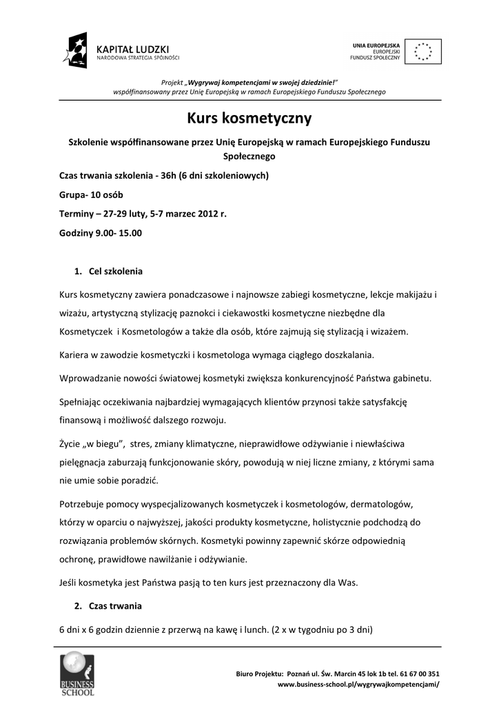 Projekt „Wygrywaj kompetencjami w swojej dziedzinie!” współfinansowany przez Unię Europejską w ramach Europejskiego Funduszu Społecznego Kurs kosmetyczny Szkolenie współfinansowane przez Unię Europejską w ramach Europejskiego Funduszu Społecznego Czas trwania szkolenia - 36h (6 dni szkoleniowych) Grupa- 10 osób Terminy – 27-29 luty, 5-7 marzec 2012 r. Godziny 9.00- 15.00 1. Cel szkolenia Kurs kosmetyczny zawiera ponadczasowe i najnowsze zabiegi kosmetyczne, lekcje makijażu i wizażu, artystyczną stylizację paznokci i ciekawostki kosmetyczne niezbędne dla Kosmetyczek i Kosmetologów a także dla osób, które zajmują się stylizacją i wizażem. Kariera w zawodzie kosmetyczki i kosmetologa wymaga ciągłego doszkalania. Wprowadzanie nowości światowej kosmetyki zwiększa konkurencyjność Państwa gabinetu. Spełniając oczekiwania najbardziej wymagających klientów przynosi także satysfakcję finansową i możliwość dalszego rozwoju. Życie „w biegu”, stres, zmiany klimatyczne, nieprawidłowe odżywianie i niewłaściwa pielęgnacja zaburzają funkcjonowanie skóry, powodują w niej liczne zmiany, z którymi sama nie umie sobie poradzić. Potrzebuje pomocy wyspecjalizowanych kosmetyczek i kosmetologów, dermatologów, którzy w oparciu o najwyższej, jakości produkty kosmetyczne, holistycznie podchodzą do rozwiązania problemów skórnych. Kosmetyki powinny zapewnić skórze odpowiednią ochronę, prawidłowe nawilżanie i odżywianie. Jeśli kosmetyka jest Państwa pasją to ten kurs jest przeznaczony dla Was. 2. Czas trwania 6 dni x 6 godzin dziennie z przerwą na kawę i lunch. (2 x w tygodniu po 3 dni) Biuro Projektu: Poznań ul. Św. Marcin 45 lok 1b tel. 61 67 00 351 www.business-school.pl/wygrywajkompetencjami/ Projekt „Wygrywaj kompetencjami w swojej dziedzinie!” współfinansowany przez Unię Europejską w ramach Europejskiego Funduszu Społecznego 3. Adresaci szkolenia Szkolenie to jest przeznaczone dla kosmetyczek i kosmetologów, którzy chcą poznać sekrety kosmetyki upiększającej, ugruntować swoją wiedzę z zakresu kosmetyki naturalnej, która holistycznie podchodzi do zdrowia i urody. Zapraszamy także osoby, które chcą uniknąć błędów w makijażu permanentnym oraz pragnące poznać tajniki stylizowania paznokci. 4. Warunki uczestnictwa Właściciela gabinetów kosmetycznych i ich pracownicy na terenie województwa Wielkopolskiego Pracownicy – bezpłatnie Właściciele – 286,80 zł 5. Program szkolenia (6dni) 1 dzień – głębokie złuszczania: Zapoznanie i porównanie różnych metod: Neoderma, Alex, Christina, M. Brigitte Kettner złuszczania ziołowe oraz kwasy. 2 dzień – holistyczne podejście do zdrowia i urody w kosmetyce Zabieg aloesowy z zastosowaniem naturalnych kosmetyków nie zawierających wody, parabenów, alkoholu, konserwantów z atestami Bio i Ecocert. Dla każdego rodzaju skóry niezależnie od wieku. Czarny sezam, Papaya, sok aloesowy- jak je wykorzystać w pielęgnacji urody. 3 dzień – makijaż permanentny: Jak nie zaszkodzić klientkom i sobie. Mity i stereotypy w makijażu permanentnym. Co powinna wiedzieć każda linergistka. 4 dzień – magia kolorów Biuro Projektu: Poznań ul. Św. Marcin 45 lok 1b tel. 61 67 00 351 www.business-school.pl/wygrywajkompetencjami/ Projekt „Wygrywaj kompetencjami w swojej dziedzinie!” współfinansowany przez Unię Europejską w ramach Europejskiego Funduszu Społecznego Kolory źródłem dobrego samopoczucia, określenie typu kolorystycznego w oparciu o analizę kolorystyczną. Makijaż gwarancją sukcesu w życiu osobistym i zawodowym. Jak dobrać biżuterię do kształtu twarzy. Apaszkowe SOS i wiele innych tematów związanych z poprawą wizerunku. 5 dzień- prawdy i mity dotyczące stylizacji paznokci co każda kosmetyczka powinna wiedzieć by udzielić klientce wyczerpującej odpowiedzi. Omówienie produktów: charakterystyka żeli, ich zastosowanie i prawidłowa aplikacja, forma czy tips, czyli co dla kogo... French z użyciem kamuflażu, Smile Line - perfekcyjna linia uśmiechu STOP reklamacjom - najczęściej popełniane błędy), „Ogryzki” tez mogą być ładne (rekonstrukcja paznokci obgryzionych, uszkodzonych) Dobór kształtu paznokci, długości i koloru do kształtu dłoni Ćwiczenia i odpowiedzi na pytania 6 dzień- Kilka sztuczek i przydatnych porad zasady prawidłowego piłowania popularne kształty paznokci (kwadrat, migdał, owal i szpic) szybkie salonowe zdobienia do frencza (z wykorzystaniem farb akrylowych) zatapianie ozdób Ćwiczenia i odpowiedzi na pytania Biuro Projektu: Poznań ul. Św. Marcin 45 lok 1b tel. 61 67 00 351 www.business-school.pl/wygrywajkompetencjami/