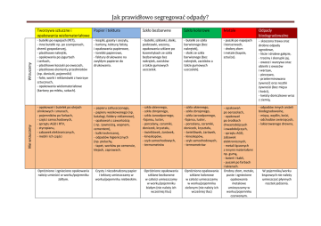 Nie wrzucamy Wrzucamy Jak prawidłowo segregować odpady? Tworzywa sztuczne i Papier i tektura opakowania wielomateriałowe Szkło bezbarwne Szkło kolorowe Metale - butelki po napojach (PET), - inne butelki np. po szamponach, chemii gospodarczej, - plastikowe nakrętki, - opakowania po jogurtach i serkach, - plastikowe koszyki po owocach, - plastikowe elementy przedmiotów (np. doniczki, pojemniki) - folie, worki i reklamówki z tworzyw sztucznych, - opakowania wielomateriałowe (kartony po mleku, sokach). - książki, gazety i zeszyty, - kartony, tekturę falistą i opakowania papierowe, - torebki papierowe, - faktury drukowane na zwykłym papierze do drukowania. - butelki, szklanki, słoiki, podstawki, wazony, opakowania szklane po kosmetykach ze szkła bezbarwnego bez nakrętek, zacisków a także gumowych uszczelek. - butelki ze szkła barwionego (bez nakrętek), - słoiki ze szkła barwionego (bez nakrętek, zacisków a także gumowych uszczelek). - puszki po napojach i konserwach, - drobny złom i metale (kapsle, sztućce). - opakowań i butelek po olejach silnikowych i smarach, - pojemników po farbach, - części samochodowych, - sprzętu AGD i RTV, - styropianu, - zabawek elektronicznych, - mebli i ich części - papieru zatłuszczonego, - szkła okiennego, - szkła zbrojonego, - szkła żaroodpornego, -fajansu, luster, - porcelany, ceramiki, doniczek, kryształu, - świetlówek, żarówek, - kineskopów, - szyb samochodowych, - termometrów - szkła okiennego, - szkła zbrojonego, - szkła żaroodpornego, -fajansu, luster, - porcelany, ceramiki, doniczek, kryształu, - świetlówek, żarówek, - kineskopów, - szyb samochodowych, - termometrów - opakowań Opróżnione i zgniecione opakowania należy umieścić w worku/pojemniku żółtym. - papieru woskowanego (np. katalogi, foldery reklamowe), - opakowań z zawartością ( np. żywnością, wapnem, cementem), - kalki technicznej, - odpadów higienicznych (np. pieluchy, - tapet, worków po cemencie, klejach, zaprawach. Czysty i niezabrudzony papier i tekturę umieszczamy w worku/pojemniku niebieskim. Opróżnione opakowania szklane bezbarwne w całości umieszczamy w worku/pojemniku białym (nie należy ich wcześniej tłuc) Opróżnione opakowania szklane kolorowe w całości umieszczamy w worku/pojemniku zielonym (nie należy ich wcześniej tłuc) po aerozolach, - opakowań po środkach chwastobójczych i owadobójczych, - sprzętu AGD, zabawek elektronicznych, - metali łączonych z innymi materiałami np. gumą, - baterii i kabli, - puszek po farbach i lakierach. Drobny złom, metale, puste i zgniecione opakowania metalowe umieszczamy w worku/pojemniku czerwonym. Odpady biodegradowalne - skoszona trawa oraz drobne odpady ogrodowe, - liście i drobne gałęzie, - trociny i skorupki jaj, - owoce i warzywa oraz obierki z owoców i warzyw, - pieczywo, - przeterminowana żywność oraz resztki żywności (bez mięsa i kości), - kwiaty doniczkowe wraz z ziemią. - odpadów innych aniżeli biodegradowalne, - mięsa, wędlin, kości, - odchodów zwierzęcych, - lakierowanego drewna, W pojemniku/worku brązowych nie należy umieszczać płynnych resztek jedzenia.