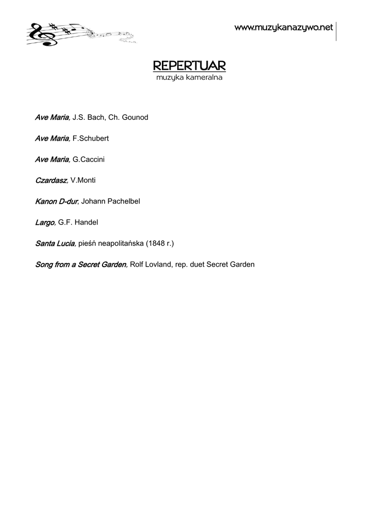 www.muzykanazywo.net REPERTUAR muzyka kameralna Ave Maria, J.S. Bach, Ch. Gounod Ave Maria, F.Schubert Ave Maria, G.Caccini Czardasz, V.Monti Kanon D-dur, Johann Pachelbel Largo, G.F. Handel Santa Lucia, pieśń neapolitańska (1848 r.) Song from a Secret Garden, Rolf Lovland, rep. duet Secret Garden