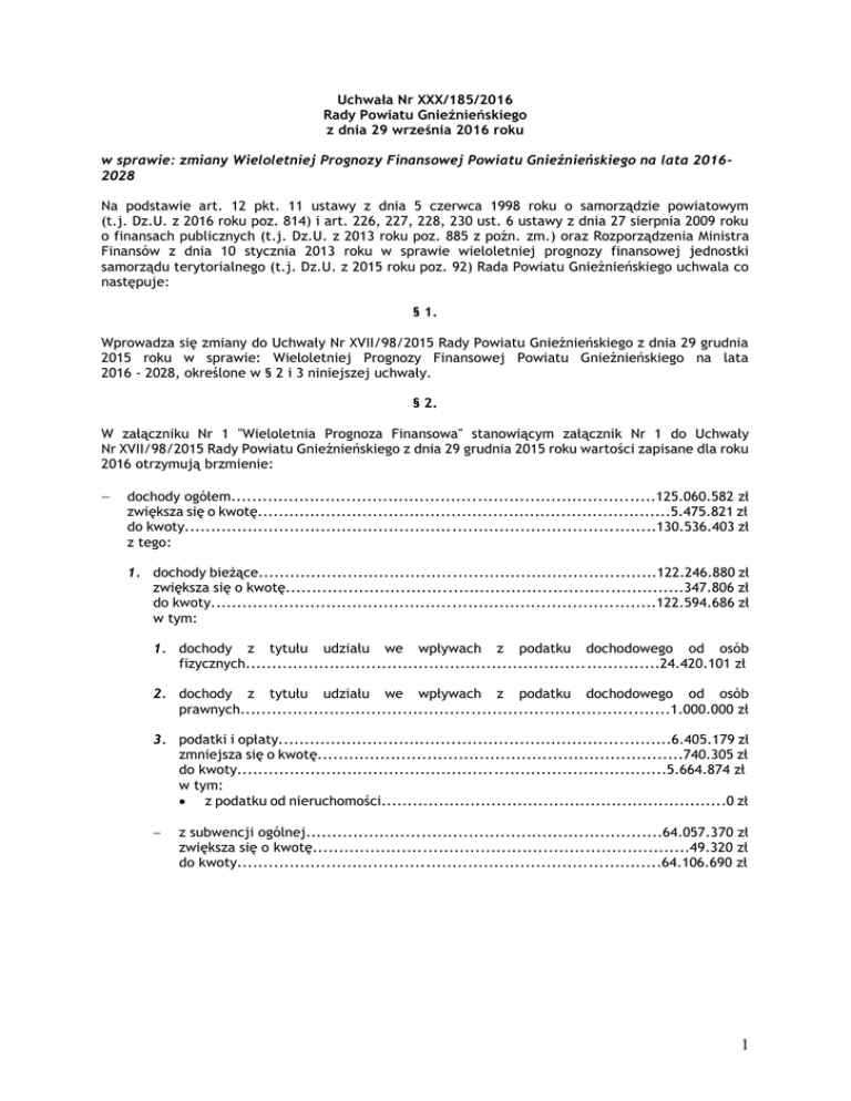 Uchwała Nr XXX/185/2016 Rady Powiatu Gnieźnieńskiego z dnia 29 września 2016 roku w sprawie: zmiany Wieloletniej Prognozy Finansowej Powiatu Gnieźnieńskiego na lata 20162028 Na podstawie art. 12 pkt. 11 ustawy z dnia 5 czerwca 1998 roku o samorządzie powiatowym (t.j. Dz.U. z 2016 roku poz. 814) i art. 226, 227, 228, 230 ust. 6 ustawy z dnia 27 sierpnia 2009 roku o finansach publicznych (t.j. Dz.U. z 2013 roku poz. 885 z poźn. zm.) oraz Rozporządzenia Ministra Finansów z dnia 10 stycznia 2013 roku w sprawie wieloletniej prognozy finansowej jednostki samorządu terytorialnego (t.j. Dz.U. z 2015 roku poz. 92) Rada Powiatu Gnieźnieńskiego uchwala co następuje: § 1. Wprowadza się zmiany do Uchwały Nr XVII/98/2015 Rady Powiatu Gnieźnieńskiego z dnia 29 grudnia 2015 roku w sprawie: Wieloletniej Prognozy Finansowej Powiatu Gnieźnieńskiego na lata 2016 - 2028, określone w § 2 i 3 niniejszej uchwały. § 2. W załączniku Nr 1 "Wieloletnia Prognoza Finansowa" stanowiącym załącznik Nr 1 do Uchwały Nr XVII/98/2015 Rady Powiatu Gnieźnieńskiego z dnia 29 grudnia 2015 roku wartości zapisane dla roku 2016 otrzymują brzmienie: dochody ogółem.................................................................................125.060.582 zł zwiększa się o kwotę...............................................................................5.475.821 zł do kwoty..........................................................................................130.536.403 zł z tego: 1. dochody bieżące............................................................................122.246.880 zł zwiększa się o kwotę............................................................................347.806 zł do kwoty.....................................................................................122.594.686 zł w tym: 1. dochody z tytułu udziału we wpływach z podatku dochodowego od osób fizycznych...............................................................................24.420.101 zł 2. dochody z tytułu udziału we wpływach z podatku dochodowego od osób prawnych..................................................................................1.000.000 zł 3. podatki i opłaty...........................................................................6.405.179 zł zmniejsza się o kwotę......................................................................740.305 zł do kwoty..................................................................................5.664.874 zł w tym: z podatku od nieruchomości..................................................................0 zł z subwencji ogólnej....................................................................64.057.370 zł zwiększa się o kwotę........................................................................49.320 zł do kwoty.................................................................................64.106.690 zł 1 z tytułu dotacji i środków przeznaczonych na cele bieżące.....................17.576.376 zł zwiększa się o kwotę.....................................................................1.077.083 zł do kwoty.................................................................................18.653.459 zł 2. dochody majątkowe..........................................................................2.813.702 zł zwiększa się o kwotę..........................................................................5.128.015 zł do kwoty........................................................................................7.941.717 zł w tym: ze sprzedaży majątku...................................................................1.571.058 zł zwiększa się o kwotę........................................................................30.000 zł do kwoty...................................................................................1.601.058 zł z tytułu dotacji oraz środków przeznaczonych na inwestycje....................1.225.000 zł zwiększa się o kwotę.....................................................................5.098.015 zł do kwoty...................................................................................6.323.015 zł wydatki ogółem..................................................................................130.635.200 zł zwiększa się o kwotę...............................................................................4.150.868 zł do kwoty..........................................................................................134.786.068 zł z tego: 1. wydatki bieżące............................................................................119.462.423 zł zmniejsza się o kwotę...........................................................................545.401 zł do kwoty.....................................................................................118.917.022 zł w tym: z tytułu poręczeń i gwarancji.....................................................................0 zł w tym: gwarancje i poręczenia podlegające wyłączeniu z limitu spłaty zobowiązań, o którym mowa w art. 243 ustawy......................................................................0 zł na spłatę przejętych zobowiązań samodzielnego publicznego zakładu opieki zdrowotnej przekształconego na zasadach określonych w przepisach o działalności leczniczej, w wysokości w jakiej nie podlegają sfinansowaniu dotacją z budżetu państwa.............0 zł wydatki na obsługę długu..................................................................511.592 zł zmniejsza się o kwotę.......................................................................42.278 zł do kwoty.....................................................................................469.314 zł w tym: odsetki i dyskonto określone w art. 243 ust. 1 ustawy...........................511.592 zł zmniejsza się o kwotę..................................................................42.278 zł do kwoty...