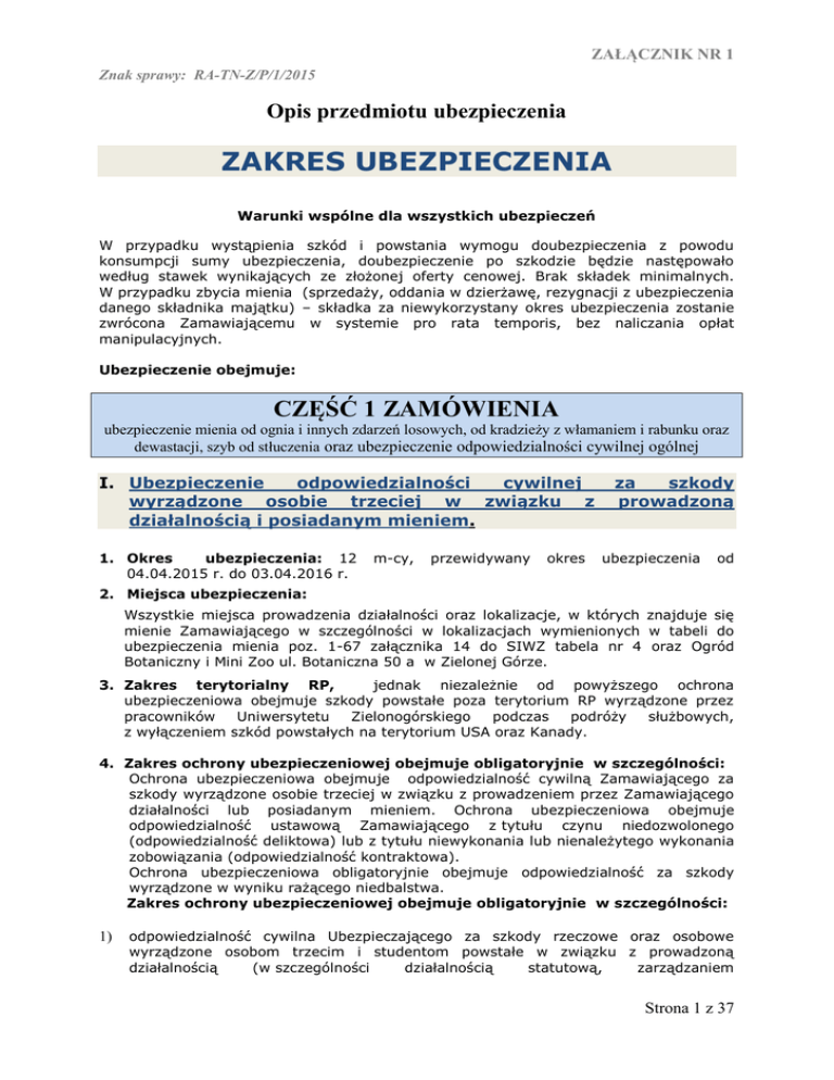 ZAŁĄCZNIK NR 1 Znak sprawy: RA-TN-Z/P/1/2015 Opis przedmiotu ubezpieczenia ZAKRES UBEZPIECZENIA Warunki wspólne dla wszystkich ubezpieczeń W przypadku wystąpienia szkód i powstania wymogu doubezpieczenia z powodu konsumpcji sumy ubezpieczenia, doubezpieczenie po szkodzie będzie następowało według stawek wynikających ze złożonej oferty cenowej. Brak składek minimalnych. W przypadku zbycia mienia (sprzedaży, oddania w dzierżawę, rezygnacji z ubezpieczenia danego składnika majątku) – składka za niewykorzystany okres ubezpieczenia zostanie zwrócona Zamawiającemu w systemie pro rata temporis, bez naliczania opłat manipulacyjnych. Ubezpieczenie obejmuje: CZĘŚĆ 1 ZAMÓWIENIA ubezpieczenie mienia od ognia i innych zdarzeń losowych, od kradzieży z włamaniem i rabunku oraz dewastacji, szyb od stłuczenia oraz ubezpieczenie odpowiedzialności cywilnej ogólnej I. Ubezpieczenie odpowiedzialności cywilnej wyrządzone osobie trzeciej w związku z działalnością i posiadanym mieniem. 1. Okres ubezpieczenia: 12 04.04.2015 r. do 03.04.2016 r. m-cy, przewidywany okres za szkody prowadzoną ubezpieczenia od 2. Miejsca ubezpieczenia: Wszystkie miejsca prowadzenia działalności oraz lokalizacje, w których znajduje się mienie Zamawiającego w szczególności w lokalizacjach wymienionych w tabeli do ubezpieczenia mienia poz. 1-67 załącznika 14 do SIWZ tabela nr 4 oraz Ogród Botaniczny i Mini Zoo ul. Botaniczna 50 a w Zielonej Górze. 3. Zakres terytorialny RP, jednak niezależnie od powyższego ochrona ubezpieczeniowa obejmuje szkody powstałe poza terytorium RP wyrządzone przez pracowników Uniwersytetu Zielonogórskiego podczas podróży służbowych, z wyłączeniem szkód powstałych na terytorium USA oraz Kanady. 4. Zakres ochrony ubezpieczeniowej obejmuje obligatoryjnie w szczególności: Ochrona ubezpieczeniowa obejmuje odpowiedzialność cywilną Zamawiającego za szkody wyrządzone osobie trzeciej w związku z prowadzeniem przez Zamawiającego działalności lub posiadanym mieniem. Ochrona ubezpieczeniowa obejmuje odpowiedzialność ustawową Zamawiającego z tytułu czynu niedozwolonego (odpowiedzialność deliktowa) lub z tytułu niewykonania lub nienależytego wykonania zobowiązania (odpowiedzialność kontraktowa). Ochrona ubezpieczeniowa obligatoryjnie obejmuje odpowiedzialność za szkody wyrządzone w wyniku rażącego niedbalstwa. Zakres ochrony ubezpieczeniowej obejmuje obligatoryjnie w szczególności: 1) odpowiedzialność cywilna Ubezpieczającego za szkody rzeczowe oraz osobowe wyrządzone osobom trzecim i studentom powstałe w związku z prowadzoną działalnością (w szczególności działalnością statutową, zarządzaniem Strona 1 z 37 ZAŁĄCZNIK NR 1 Znak sprawy: RA-TN-Z/P/1/2015 Opis przedmiotu ubezpieczenia i administrowaniem mienia, prowadzenie remontów, modernizacji oraz inwestycji, działalnością gospodarczą) lub posiadanym, użytkowanym i zarządzanym mieniem, które Ubezpieczony w myśl przepisów prawa zobowiązany jest naprawić (odpowiedzialność deliktowa, kontraktowa oraz pozostająca w zbiegu odpowiedzialność deliktowo – kontraktowa); 2) odpowiedzialność cywilna wynikająca z Ustawy z dn. 27.07.2005 r. o Szkolnictwie Wyższym (Dz.U. z 2012 poz. 572); – Prawo 3) odpowiedzialność cywilna za szkody powstałe w następstwie awarii, działania oraz eksploatacji urządzeń wodociągowych i kanalizacyjnych w budynkach i poza nimi (w tym powstałe na skutek cofnięcia się cieczy z urządzeń kanalizacyjnych), centralnego ogrzewania, oraz innych technologicznych w tym wyrządzone w instalacjach i urządzeniach podziemnych; zalań dachowych i okiennych w budynkach, w tym odpowiedzialność za szkody powstałe u osób trzecich wynajmujących pomieszczenia od Uniwersytetu Zielonogórskiego (w ramach podstawowej s.g.); 4) odpowiedzialność cywilna za szkody związane z administrowaniem i zarządzaniem Uczelnią (za szkody wynikające z uchybień natury organizacyjnej, administracyjnej i porządkowej w związku z prowadzoną działalnością statutową Uniwersytetu Zielonogórskiego); 5) odpowiedzialność cywilna za szkody wynikające z dostarczenia wadliwego produktu; 6) odpowiedzialność cywilna za szkody w mieniu, z którego Ubezpieczający korzysta na podstawie najmu, dzierżawy, użyczenia lub innej podobnej formy prawnej (OC najemcy) – dotyczy zarówno nieruchomości jak i ruchomości; 7) odpowiedzialność cywilna za szkody w mieniu przechowywanym, kontrolowanym lub chronionym przez Ubezpieczającego, polegające na jego uszkodzeniu, zniszczeniu lub utracie - w tym w związku z prowadzeniem szatni; 8) odpowiedzialność cywilna za szkody poniesione przez pracowników Ubezpieczającego, będące następstwem wypadków przy pracy, przy czym za pracownika Ubezpieczającego uważa się osobę fizyczną zatrudnioną w oparciu o umowę o pracę lub powołania, wyboru lub mianowania oraz na podstawie umowy cywilnoprawnej (o dzieło, zlecenia lub innej wraz z praktykantami) z wyłączeniem osoby fizycznej, która zawarła z ubezpieczającym umowę cywilno-prawną jako przedsiębiorca. Do zakresu ubezpieczenia włącza się także szkody rzeczowe w mieniu pracowników (w tym w pojazdach pracowników); 9) odpowiedzialność cywilna za szkody wyrządzone przez pojazdy nie podlegające rejestracji (wolnobieżne); 10) szkody powstałe na drogach (publicznych i/lub drogach wewnętrznych) będących własnością oraz w zarządzie Uniwersytetu Zielonogórskiego, jak również na wydzielonych działkach geodezyjnych o funkcji drogowej oraz przeznaczonej do parkowania, chodnikach, alejkach parkowych, wynikłe z winy Ubezpieczonych; Dopuszcza się treść klauzuli: Odpowiedzialnością Ubezpieczyciela objęte są szkody wyrządzone osobom trzecim: a) powstałe wskutek złego stanu nawierzchni dróg wynikającego z uszkodzeń w postaci pojedynczych wyboi lub zapadnięcia części nawierzchni drogi lub ziemi lub jej częściowego br