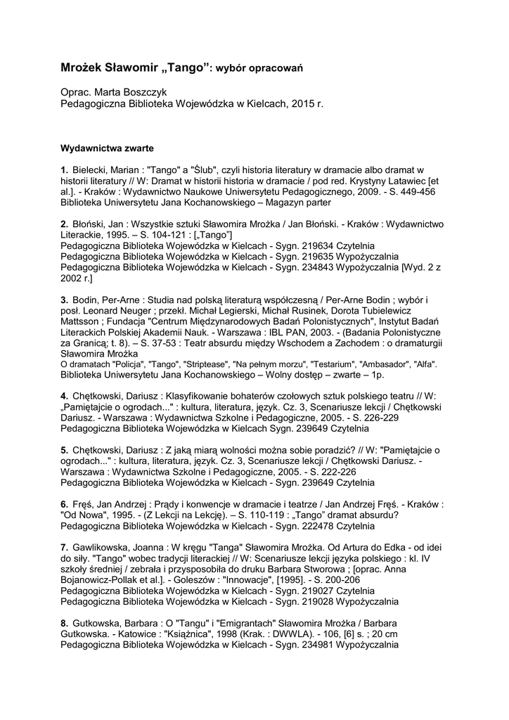 Mrożek Sławomir „Tango”: wybór opracowań Oprac. Marta Boszczyk Pedagogiczna Biblioteka Wojewódzka w Kielcach, 2015 r. Wydawnictwa zwarte 1. Bielecki, Marian : "Tango" a "Ślub", czyli historia literatury w dramacie albo dramat w historii literatury // W: Dramat w historii historia w dramacie / pod red. Krystyny Latawiec [et al.]. - Kraków : Wydawnictwo Naukowe Uniwersytetu Pedagogicznego, 2009. - S. 449-456 Biblioteka Uniwersytetu Jana Kochanowskiego – Magazyn parter 2. Błoński, Jan : Wszystkie sztuki Sławomira Mrożka / Jan Błoński. - Kraków : Wydawnictwo Literackie, 1995. – S. 104-121 : [„Tango”] Pedagogiczna Biblioteka Wojewódzka w Kielcach - Sygn. 219634 Czytelnia Pedagogiczna Biblioteka Wojewódzka w Kielcach - Sygn. 219635 Wypożyczalnia Pedagogiczna Biblioteka Wojewódzka w Kielcach - Sygn. 234843 Wypożyczalnia [Wyd. 2 z 2002 r.] 3. Bodin, Per-Arne : Studia nad polską literaturą współczesną / Per-Arne Bodin ; wybór i posł. Leonard Neuger ; przekł. Michał Legierski, Michał Rusinek, Dorota Tubielewicz Mattsson ; Fundacja "Centrum Międzynarodowych Badań Polonistycznych", Instytut Badań Literackich Polskiej Akademii Nauk. - Warszawa : IBL PAN, 2003. - (Badania Polonistyczne za Granicą; t. 8). – S. 37-53 : Teatr absurdu między Wschodem a Zachodem : o dramaturgii Sławomira Mrożka O dramatach "Policja", "Tango", "Striptease", "Na pełnym morzu", "Testarium", "Ambasador", "Alfa". Biblioteka Uniwersytetu Jana Kochanowskiego – Wolny dostęp – zwarte – 1p. 4. Chętkowski, Dariusz : Klasyfikowanie bohaterów czołowych sztuk polskiego teatru // W: „Pamiętajcie o ogrodach..." : kultura, literatura, język. Cz. 3, Scenariusze lekcji / Chętkowski Dariusz. - Warszawa : Wydawnictwa Szkolne i Pedagogiczne, 2005. - S. 226-229 Pedagogiczna Biblioteka Wojewódzka w Kielcach Sygn. 239649 Czytelnia 5. Chętkowski, Dariusz : Z jaką miarą wolności można sobie poradzić? // W: "Pamiętajcie o ogrodach..." : kultura, literatura, język. Cz. 3, Scenariusze lekcji / Chętkowski Dariusz. Warszawa : Wydawnictwa Szkolne i Pedagogiczne, 2005. - S. 222-226 Pedagogiczna Biblioteka Wojewódzka w Kielcach - Sygn. 239649 Czytelnia 6. Fręś, Jan Andrzej : Prądy i konwencje w dramacie i teatrze / Jan Andrzej Fręś. - Kraków : "Od Nowa", 1995. - (Z Lekcji na Lekcję). – S. 110-119 : „Tango” dramat absurdu? Pedagogiczna Biblioteka Wojewódzka w Kielcach - Sygn. 222478 Czytelnia 7. Gawlikowska, Joanna : W kręgu "Tanga" Sławomira Mrożka. Od Artura do Edka - od idei do siły. "Tango" wobec tradycji literackiej // W: Scenariusze lekcji języka polskiego : kl. IV szkoły średniej / zebrała i przysposobiła do druku Barbara Stworowa ; [oprac. Anna Bojanowicz-Pollak et al.]. - Goleszów : "Innowacje", [1995]. - S. 200-206 Pedagogiczna Biblioteka Wojewódzka w Kielcach - Sygn. 219027 Czytelnia Pedagogiczna Biblioteka Wojewódzka w Kielcach - Sygn. 219028 Wypożyczalnia 8. Gutkowska, Barbara : O "Tangu" i "Emigrantach" Sławomira Mrożka / Barbara Gutkowska. - Katowice : "Książnica", 1998 (Krak. : DWWLA). - 106, [6] s. ; 20 cm Pedagogiczna Biblioteka Wojewódzka w Kielcach - Sygn. 234981 Wypożyczalnia 9. Juszczyk, Andrzej : Taniec na gruzach : "Tango" Sławomira Mrożka // W: Lektury bez tajemnic. 2 : [literatura współczesna : od 1 klasy do matury!] / oprac. Michał Kuziak. - Kraków : Wydawnictwo Znak, 1999. - S. 122-128 Pedagogiczna Biblioteka Wojewódzka w Kielcach - Sygn. 228095 Czytelnia Pedagogiczna Biblioteka Wojewódzka w Kielcach - Sygn. 228263 Wypożyczalnia 10. Kordys-Tomaszewska, Marta : Sławomir Mrożek - Tango / oprac. Marta KordysTomaszewska. - Kraków : Wydawnictwo Zielona Sowa, cop. 2010. - 35, [5] s. ; 15 cm. – (Biblioteka Opracowań Lektur Szkolnych ; nr 10). - Bibliogr. s. [37] 11. Kozak Bogdan, Tadus Andrzej : "Tango" Sławomira Mrożka jako parodia dramatu rodzinnego ; Absurd, groteska i gra z tradycją w "Tangu" // W: Barwy epok : kultura i literatura, nauka o języku : scenariusze lekcji : liceum ogólnokształcące, liceum profilowane, technikum. 3 / Kozak Bogdan, Tadus Andrzej. - Warszawa : WSiP, 2005. - S. 109-112 12. Krajewska, Anna : Dramat i teatr absurdu w Polsce / Anna Krajewska. - Poznań : Wydawnictwo Naukowe UAM, 1996. – (Filologia Polska / Uniwersytet im. Adama Mickiewicza w Poznaniu, 0554-8179 ; nr 58). – S. 87-95 : Obrazoburcze tango czy spontaniczny blues? Pedagogiczna Biblioteka Wojewódzka w Kielcach - Sygn. 222545 Czytelnia 13. Krajewska, Anna : Mrożka pochwała tańca, niekonsekwencji i symetrii // W: Dramat i teatr absurdu w Polsce / Krajewska Anna. - Poznań : Wydawnictwo Naukowe Uniwersytetu im. Adama Mickiewicza, 1996. - (Filologia Polska / Uniwersytet im. Adama Mickiewicza ; Nr 58). - S. 79-114 Pedagogiczna Biblioteka Wojewódzka w Kielcach – Sygn. 222545 Czytelnia 14. Łubieniewska, Ewa : Mrożek // W: W świecie literatury i teatru : sztuka współuczestnictwa / red. Ewa Łubieniewska. - Kraków : Universitas, 2006. - S. 539-578 Biblioteka Uniwersytetu Jana Kochanowskiego – Wolny dostęp – zwarte – 1p. 15. Maciąg, Włodzimierz : Nasz wiek XX : przewodnie idee literatury polskiej 1918-1980 / Włodzimierz Maciąg. - Wrocław [etc.] : Zakład Narodowy im. Ossolińskich, 1992. – S. 280291 : Sławomir Mrożek, czyli świat zamknięty Pedagogiczna Biblioteka Wojewódzka w Kielcach - Sygn. 212539 Wypożyczalnia Pedagogiczna Biblioteka Wojewódzka w Kielcach - Sygn. 212743 Czytelnia 16. Nyczek, Tadeusz : Tańcząc tango // W: Dramat polski : interpretacje. Cz. 2, Po roku 1918 / pod red. Jana Ciechowicza i Zbigniewa Majchrowskiego ; wstęp i posł. Dobrochny Ratajczakowej. - Gdańsk : "Słowo/Obraz Terytoria", cop. 2001. – S. 245-261 Pedagogiczna Biblioteka Wojewódzka w Kielcach - Sygn. 237344 Czytelnia 17. Nowacka , Teresa : Co potrzeba do matury z języka polskiego / Teresa Nowacka. Warszawa : Verbum , 2005. - S. 343-349 : Sławomir Mrożek "Tango" Pedagogiczna Biblioteka Wojewódzka w Kie