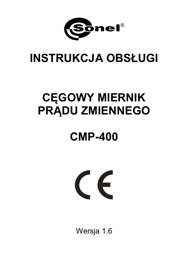 INSTRUKCJA OBSŁUGI CĘGOWY MIERNIK PRĄDU ZMIENNEGO CMP-400 Wersja 1.6 Cyfrowy miernik cęgowy CMP-400 przeznaczony jest do cęgowych pomiarów prądu przemiennego. Ponadto miernik umożliwia pomiar napięć stałych i przemiennych, częstotliwości, rezystancji, temperatury oraz testowanie diod. Do najważniejszych cech przyrządu CMP-400 należą: • • • • • • • • automatyczna lub ręczna zmiana zakresów, funkcja HOLD umożliwiająca odczyt pomiarów przy niedostatecznym oświetleniu lub w trudno dostępnych miejscach, funkcja REL umożliwiająca dokonywanie pomiarów względnych, sygnalizacja dźwiękowa ciągłości obwodu (Beeper), samoczynne wyłączanie nieużywanego przyrządu , wyświetlacz 3 ¾ cyfry, bezpieczne, osłonięte szczęki pomiarowe, wzmocniona obudowa odporna na udary. 1 WSTĘP ..................................................................... 5 2 BEZPIECZEŃSTWO ............................................. 6 2.1 3 MIĘDZYNARODOWE SYMBOLE BEZPIECZEŃSTWA ......................8 PRZYGOTOWANIE MIERNIKA DO PRACY .. 8 4 OPIS FUNKCJONALNY ....................................... 9 4.1 GNIAZDA POMIAROWE I ELEMENTY WYBORU FUNKCJI POMIAROWEJ ........................................................................................9 4.1.1 Gniazda ............................................................................10 4.1.2 Elementy wyboru funkcji pomiarowej ...............................10 4.2 WYŚWIETLACZ CIEKŁOKRYSTALICZNY (LCD).........................11 4.3 PRZEWODY ...............................................................................12 5 POMIARY ............................................................. 12 5.1 5.2 5.3 5.4 5.5 5.6 5.7 5.8 6 POMIAR PRĄDU PRZEMIENNEGO ...............................................12 POMIAR NAPIĘCIA ....................................................................13 POMIAR REZYSTANCJI ..............................................................14 TEST CIĄGŁOŚCI OBWODU ........................................................14 TEST DIOD ................................................................................15 POMIAR CZĘSTOTLIWOŚCI LUB % CYKLU ROBOCZEGO .............16 POMIAR TEMPERATURY ............................................................17 BEZDOTYKOWY TEST NAPIĘCIA ...............................................18 FUNKCJE SPECJALNE ...................................... 19 6.1 6.2 6.3 6.4 RĘCZNA ZMIANA PODZAKRESÓW .............................................19 TRYB POMIARU WZGLĘDNEGO .................................................19 FUNKCJA HOLD I PODŚWIETLENIE WYŚWIETLACZA ...............19 PRZYCISK MODE.....................................................................20 7 ZANIM ODDASZ MIERNIK DO SERWISU .... 20 8 WYMIANA BATERII .......................................... 21 9 CZYSZCZENIE I KONSERWACJA ................. 21 10 MAGAZYNOWANIE ........................................... 22 11 ROZBIÓRKA I UTYLIZACJA ........................... 22 12 ZAŁĄCZNIKI ....................................................... 22 3 12.1 DANE TECHNICZNE ...................................................................22 13 WYPOSAŻENIE STANDARDOWE .................. 25 14 SERWIS ................................................................. 26 15 USŁUGI LABORATORYJNE ............................. 26 4 1 Wstęp Dziękujemy za zakup cyfrowego miernika cęgowego firmy Sonel. Miernik CMP-400 jest nowoczesnym, wysokiej jakości przyrządem pomiarowym, łatwym i bezpiecznym w obsłudze. Jednak przeczytanie niniejszej instrukcji pozwoli uniknąć błędów przy pomiarach i zapobiegnie ewentualnym problemom przy obsłudze miernika. W niniejszej instrukcji posługujemy się trzema rodzajami ostrzeżeń. Są to teksty w ramkach, opisujące możliwe zagrożenia zarówno dla użytkownika, jak i miernika. Teksty rozpoczynające się słowem ‘OSTRZEŻENIE:’ opisują sytuacje, w których może dojść do zagrożenia życia lub zdrowia, jeżeli nie przestrzega się instrukcji. Słowo ‘UWAGA!’ rozpoczyna opis sytuacji, w której niezastosowanie się do instrukcji grozi uszkodzeniem przyrządu. Wskazania ewentualnych problemów są poprzedzane słowem ‘Uwaga:’. OSTRZEŻENIE: Przed użyciem przyrządu należy dokładnie przeczytać niniejszą instrukcję i zastosować się do przepisów bezpieczeństwa i zaleceń producenta. OSTRZEŻENIE: Miernik CMP-400 jest przeznaczony do cęgowych pomiarów prądu a także do pomiarów napięć stałych i przemiennych, częstotliwości, rezystancji i temperatury. Każde inne zastosowanie niż podane w tej instrukcji może spowodować uszkodzenie przyrządu i być źródłem poważnego niebezpieczeństwa dla użytkownika. 5 OSTRZEŻENIE: Miernik CMP-400 może być używany jedynie przez wykwalifikowane osoby posiadające odpowiednie uprawnienia do prac przy instalacjach elektrycznych. Posługiwanie się miernikiem przez osoby nieuprawnione może spowodować uszkodzenie przyrządu i być źródłem poważnego niebezpieczeństwa dla użytkownika. 2 Bezpieczeństwo Aby zapewnić odpowiednią obsługę i poprawność uzyskiwanych wyników należy przestrzegać następujących zaleceń: • przed rozpoczęciem eksploatacji miernika należy dokładnie zapoznać się z niniejszą instrukcją, • przyrząd powinien być obsługiwany wyłącznie przez osoby odpowiednio wykwalifikowane i przeszkolone w zakresie BHP, • należy zachować dużą ostrożność przy pomiarze napięć przekraczających 35VDC lub 25VAC RMS gdyż stanowią one potencjalne zagrożenie porażeniem, • przy sprawdzaniu obecności napięcia należy upewnić się, że funkcja ta działa prawidłowo (za pomocą pomiaru znanej wartości napięcia) zanim przyjmie się, że zerowy odczyt oznacza brak napięcia, • przed przystąpieniem do pomiarów należy ustawić przełącznik funkcji w odpowiednim położeniu, • w trakcie pomiarów napięcia nie należy przełączać urz