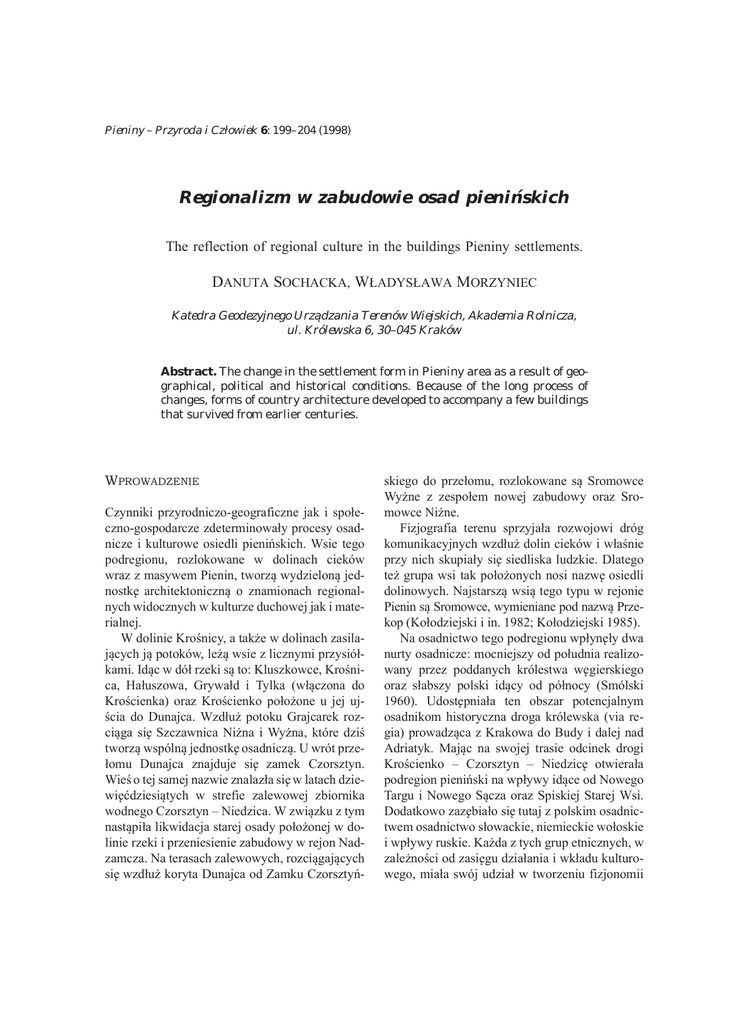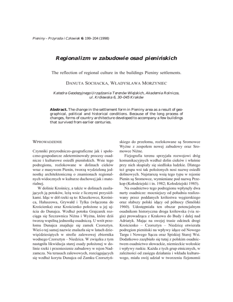 Pieniny – Przyroda i Człowiek 6: 199–204 (1998) Regionalizm w zabudowie osad pienińskich The reflection of regional culture in the buildings Pieniny settlements. DANUTA SOCHACKA, WŁADYSŁAWA MORZYNIEC Katedra Geodezyjnego Urza˛dzania Terenów Wiejskich, Akademia Rolnicza, ul. Królewska 6, 30–045 Kraków Abstract. The change in the settlement form in Pieniny area as a result of geographical, political and historical conditions. Because of the long process of changes, forms of country architecture developed to accompany a few buildings that survived from earlier centuries. WPROWADZENIE Czynniki przyrodniczo-geograficzne jak i społeczno-gospodarcze zdeterminowały procesy osadnicze i kulturowe osiedli pienińskich. Wsie tego podregionu, rozlokowane w dolinach cieków wraz z masywem Pienin, tworza˛ wydzielona˛ jednostke˛ architektoniczna˛ o znamionach regionalnych widocznych w kulturze duchowej jak i materialnej. W dolinie Krośnicy, a także w dolinach zasilaja˛cych ja˛ potoków, leża˛ wsie z licznymi przysiółkami. Ida˛c w dół rzeki sa˛ to: Kluszkowce, Krośnica, Hałuszowa, Grywałd i Tylka (wła˛czona do Krościenka) oraz Krościenko położone u jej ujścia do Dunajca. Wzdłuż potoku Grajcarek rozcia˛ga sie˛ Szczawnica Niżna i Wyżna, które dziś tworza˛ wspólna˛ jednostke˛ osadnicza˛. U wrót przełomu Dunajca znajduje sie˛ zamek Czorsztyn. Wieś o tej samej nazwie znalazła sie˛ w latach dziewie˛ćdziesia˛tych w strefie zalewowej zbiornika wodnego Czorsztyn – Niedzica. W zwia˛zku z tym nasta˛piła likwidacja starej osady położonej w dolinie rzeki i przeniesienie zabudowy w rejon Nadzamcza. Na terasach zalewowych, rozcia˛gaja˛cych sie˛ wzdłuż koryta Dunajca od Zamku Czorsztyń- skiego do przełomu, rozlokowane sa˛ Sromowce Wyżne z zespołem nowej zabudowy oraz Sromowce Niżne. Fizjografia terenu sprzyjała rozwojowi dróg komunikacyjnych wzdłuż dolin cieków i właśnie przy nich skupiały sie˛ siedliska ludzkie. Dlatego też grupa wsi tak położonych nosi nazwe˛ osiedli dolinowych. Najstarsza˛ wsia˛ tego typu w rejonie Pienin sa˛ Sromowce, wymieniane pod nazwa˛ Przekop (Kołodziejski i in. 1982; Kołodziejski 1985). Na osadnictwo tego podregionu wpłyne˛ły dwa nurty osadnicze: mocniejszy od południa realizowany przez poddanych królestwa we˛gierskiego oraz słabszy polski ida˛cy od północy (Smólski 1960). Udoste˛pniała ten obszar potencjalnym osadnikom historyczna droga królewska (via regia) prowadza˛ca z Krakowa do Budy i dalej nad Adriatyk. Maja˛c na swojej trasie odcinek drogi Krościenko – Czorsztyn – Niedzice˛ otwierała podregion pieniński na wpływy ida˛ce od Nowego Targu i Nowego Sa˛cza oraz Spiskiej Starej Wsi. Dodatkowo zaze˛biało sie˛ tutaj z polskim osadnictwem osadnictwo słowackie, niemieckie wołoskie i wpływy ruskie. Każda z tych grup etnicznych, w zależności od zasie˛gu działania i wkładu kulturowego, miała swój udział w tworzeniu fizjonomii 200 D. Sochacka & W. Morzyniec – Regionalizm w zabudowie osad pienińskich osad. Dzie˛ki temu możemy wyodre˛bnić ten obszar jako jednostke˛ architektoniczna˛ maja˛ca˛ swoiste cechy regionalne. Cechy te zawarte sa˛ w kształtach przestrzennych wsi, strukturze rozłogu be˛da˛cego nośnikiem wprowadzonego historycznie ustroju rolnego, oraz w formie i kształcie zabudowy. W 1348 roku zostało lokowane przez króla Kazimierza Wielkiego Krościenko na prawie niemieckim, z równoczesnym nadaniem praw miejskich. Ła˛cza˛ca sie˛ z takim faktem akcja planistyczna w Krościenku ograniczyła sie˛ do wytyczenia rynku i bloków przyrynkowych z równoczesnym zaakceptowaniem i zachowaniem zasad wcześniej rozplanowanej osady. Forme˛ typowej łańcuchówki dla osadnictwa na prawie niemieckim przyje˛ło przedmieście Zawodzie rozcia˛gaja˛ce sie˛ na prawym brzegu Dunajca (Sochacka 1996). Kształt przestrzenny osad określany jako ulicówka znamienny jest dla osadnictwa na prawie niemieckim ida˛cym od Spisza. I tak: Kluszkowce i Grywałd to ulicówki dolinowe, Sromowce Niżne – ulicówka placowa, Sromowce Wyżne – ulicówka z zacza˛tkiem placu obje˛te równocześnie wpływami słowackimi i we˛gierskimi. Tylka i Hałuszowa to wsie pochodzenia wołoskiego. Pierwsza ma kształt przestrzenny wsi przysiółkowej, druga przysiółka ulicowego. Ulicówka˛ z przysiółkami jest Krośnica, be˛da˛ca wsia˛ polaniarska˛. Szczawnica to zespół swobodnie zwia˛zanych ulicówek. Do niej od wschodu docierały wpływy ruskie poprzez sa˛siedztwo ze wsiami zamieszkałymi przez Rusinów Szlachtowskich. Natomiast u stóp Zamku Czorsztyńskiego rozlokowane było podgrodzie, dziś już nieistnieja˛ce, o charakterystycznych przysiółkach ulicowych (Gładysz i in. 1985). Wybudowanie zbiornika wodnego na Dunajcu pocia˛gne˛ło za soba˛ likwidacje˛ istnieja˛cej zabudowy Czorsztyna i cze˛ści Kluszkowiec. Doprowadziło do powstanie w jego bezpośrednim sa˛siedztwie dużego zespołu urbanistycznego o nowej formie zabudowy i układzie, który zlokalizowano powyżej ruin zamku w przysiółku wcześniej słabo zabudowanym – Nadzamcze (w opracowaniu pominie˛to pobliska˛ nowa˛ wieś Maniowy, jako że nie wchodzi w skład osad pienińskich). Nasta˛pił także wzrost aktywności budowlanej we wszystkich miejscowościach około pienińskich, wywołanej oczekiwaniem mieszkańców tutejszych wsi na znaczne zyski z wynajmu kwater turystom. Rozplanowanie rozłogu gruntów stanowi również ceche˛ charakterystyczna˛ dla krajobrazu pienińskiego. Wydaje sie˛, że konfiguracja terenu i korzyści gospodarcze były istotniejsze niż rygor podziału gruntów przypisany danemu ustrojowi rolnemu. O właściwym doborze świadczy ustrój niwowy zachowany praktycznie bez deformacji w Sromowcach Wyżnych. W innych przypadkach możemy mówić o czytelnym podziale na łany w rozłogu przedmieścia Zawodzie w Krościenku, na łany leśne w Krośnicy i polani