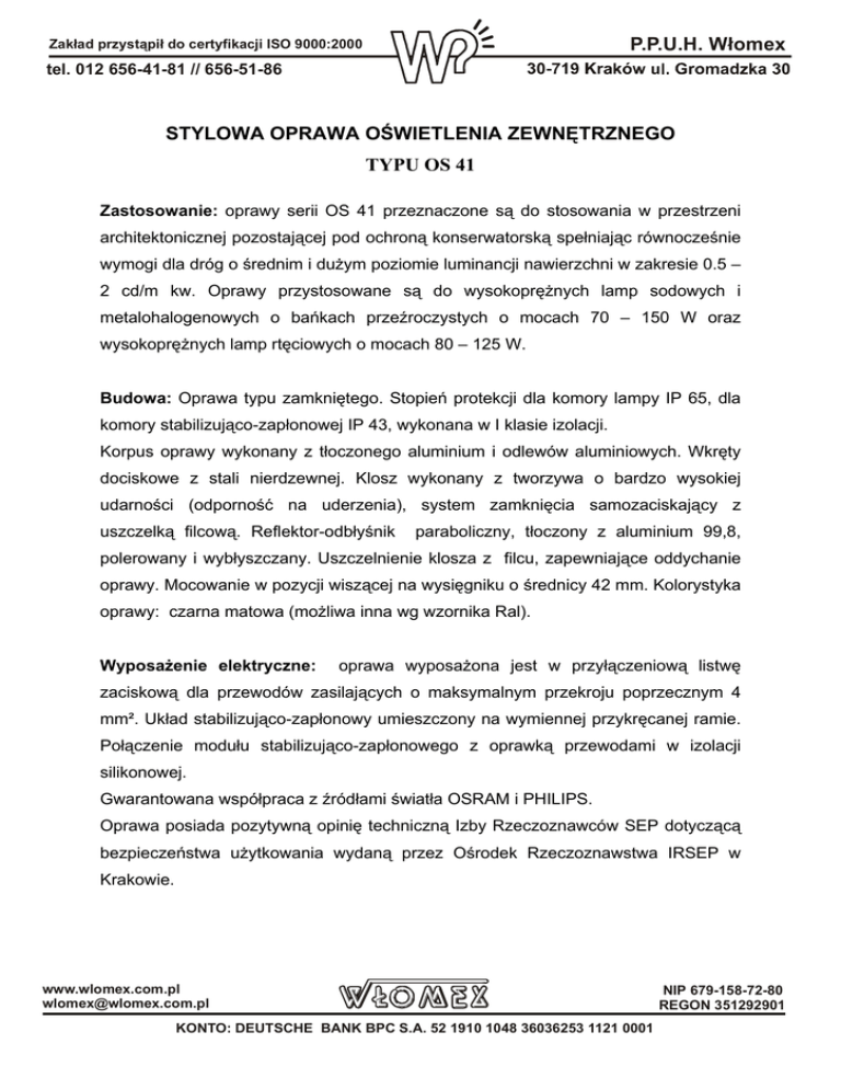 P.P.U.H. Włomex Zakład przystąpił do certyfikacji ISO 9000:2000 tel. 012 656-41-81 // 656-51-86 STYLOWA OPRAWA OŚWIETLENIA ZEWNĘTRZNEGO TYPU OS 41 Zastosowanie: oprawy serii OS 41 przeznaczone są do stosowania w przestrzeni architektonicznej pozostającej pod ochroną konserwatorską spełniając równocześnie wymogi dla dróg o średnim i dużym poziomie luminancji nawierzchni w zakresie 0.5 – 2 cd/m kw. Oprawy przystosowane są do wysokoprężnych lamp sodowych i metalohalogenowych o bańkach przeźroczystych o mocach 70 – 150 W oraz wysokoprężnych lamp rtęciowych o mocach 80 – 125 W. Budowa: Oprawa typu zamkniętego. Stopień protekcji dla komory lampy IP 65, dla komory stabilizująco-zapłonowej IP 43, wykonana w I klasie izolacji. Korpus oprawy wykonany z tłoczonego aluminium i odlewów aluminiowych. Wkręty dociskowe z stali nierdzewnej. Klosz wykonany z tworzywa o bardzo wysokiej udarności (odporność na uderzenia), system zamknięcia samozaciskający z uszczelką filcową. Reflektor-odbłyśnik paraboliczny, tłoczony z aluminium 99,8, polerowany i wybłyszczany. Uszczelnienie klosza z filcu, zapewniające oddychanie oprawy. Mocowanie w pozycji wiszącej na wysięgniku o średnicy 42 mm. Kolorystyka oprawy: czarna matowa (możliwa inna wg wzornika Ral). Wyposażenie elektryczne: oprawa wyposażona jest w przyłączeniową listwę zaciskową dla przewodów zasilających o maksymalnym przekroju poprzecznym 4 mm². Układ stabilizująco-zapłonowy umieszczony na wymiennej przykręcanej ramie. Połączenie modułu stabilizująco-zapłonowego z oprawką przewodami w izolacji silikonowej. Gwarantowana współpraca z źródłami światła OSRAM i PHILIPS. Oprawa posiada pozytywną opinię techniczną Izby Rzeczoznawców SEP dotyczącą bezpieczeństwa użytkowania wydaną przez Ośrodek Rzeczoznawstwa IRSEP w Krakowie. www.wlomex.com.pl [email protected] KONTO: DEUTSCHE BANK BPC S.A. 52 1910 1048 36036253 1121 0001 NIP 679-158-72-80 REGON 351292901 P.P.U.H. Włomex Zakład przystąpił do certyfikacji ISO 9000:2000 tel. 012 656-41-81 // 656-51-86 SCHEMAT POŁĄCZEŃ ELEKTRYCZNYCH St C 220 V 50Hz 230V 50 Hz UZ L PEN DANE TECHNICZNE -230V 50Hz Klasa ochrony -I Szczelność -IP65/43 Masa -9 kg Wys. montażu oprawy -do 8m 1otw O9 40 Napięcie zasilania O42 Warunki montażu: oprawy wiszące montowane na końcówce z rury Φ 42 mm. W rurze powinien zostać wykonany otwór Otwór mocujący O9 w rurze zawieszenia oprawy. Φ9 mm w płaszczyźnie prostopadłej do osi drogi, wg załączonego rysunku. Dane do projektowania NAV-T 100W NAV-E 100W 90 90 100 60 1=C15-195 2=C0-180 1 2 200 60 2 60 cd/klm 0 100 1 200 30 90 90 30 30 cd/klm 0 60 30 1=C10-190 2=C0-180 Krzywe światłości oprawy zgodne z charakterystykami opraw typu SL100, prod. EsSystem-Wilkasy. www.wlomex.com.pl [email protected] KONTO: DEUTSCHE BANK BPC S.A. 52 1910 1048 36036253 1121 0001 NIP 679-158-72-80 REGON 351292901 P.P.U.H. Włomex Zakład przystąpił do certyfikacji ISO 9000:2000 tel. 012 656-41-81 // 656-51-86 Typy światła źródeł NAV – T 70W NAV – T 100W NAV – T 150W SON – T PLUS 70W SON – T PLUS 100W SON – T PLUS 150W HQL – 80W HQL – 125W HPL – N 80W HPL – N 125W CDM –TT 70W CDM – TT 100W CDM – TT 150W OS 41.01.100 OS 41.02.100 Akcesoria dodatkowe: - adapter (zawieszka) do montażu opraw na linkach stal- ocynk Ф7mm; - blenda ograniczająca rozsył światła. - Zastosowanie blendy umożliwia ograniczenie emisji światła w kierunku sąsiadujących budynków („świecenie w okna mieszkań”). Odkształceniu ulega krzywa rozsyłu światłości. Montując blendę wewnątrz oprawy należy zwrócić uwagą aby nie stykała się z kloszem. www.wlomex.com.pl [email protected] KONTO: DEUTSCHE BANK BPC S.A. 52 1910 1048 36036253 1121 0001 NIP 679-158-72-80 REGON 351292901