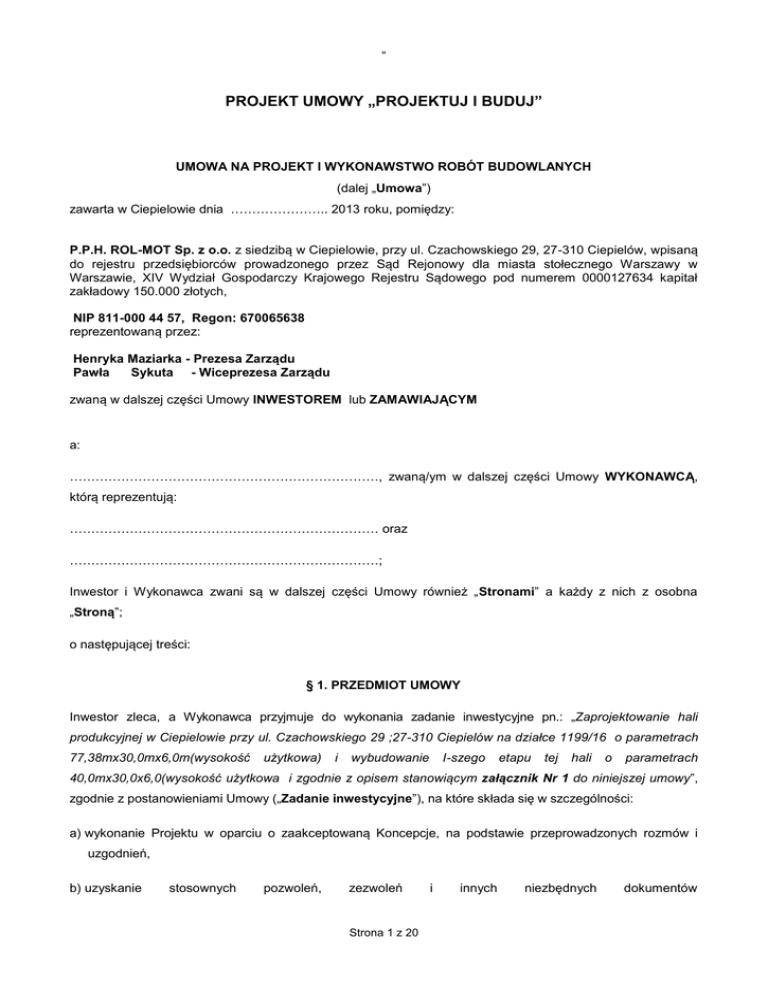 „ PROJEKT UMOWY „PROJEKTUJ I BUDUJ” UMOWA NA PROJEKT I WYKONAWSTWO ROBÓT BUDOWLANYCH (dalej „Umowa”) zawarta w Ciepielowie dnia ………………….. 2013 roku, pomiędzy: P.P.H. ROL-MOT Sp. z o.o. z siedzibą w Ciepielowie, przy ul. Czachowskiego 29, 27-310 Ciepielów, wpisaną do rejestru przedsiębiorców prowadzonego przez Sąd Rejonowy dla miasta stołecznego Warszawy w Warszawie, XIV Wydział Gospodarczy Krajowego Rejestru Sądowego pod numerem 0000127634 kapitał zakładowy 150.000 złotych, NIP 811-000 44 57, Regon: 670065638 reprezentowaną przez: Henryka Maziarka - Prezesa Zarządu Pawła Sykuta - Wiceprezesa Zarządu zwaną w dalszej części Umowy INWESTOREM lub ZAMAWIAJĄCYM a: ………………………………………………………………, zwaną/ym w dalszej części Umowy WYKONAWCĄ, którą reprezentują: ……………………………………………………………… oraz ………………………………………………………………; Inwestor i Wykonawca zwani są w dalszej części Umowy również „Stronami” a każdy z nich z osobna „Stroną”; o następującej treści: § 1. PRZEDMIOT UMOWY Inwestor zleca, a Wykonawca przyjmuje do wykonania zadanie inwestycyjne pn.: „Zaprojektowanie hali produkcyjnej w Ciepielowie przy ul. Czachowskiego 29 ;27-310 Ciepielów na działce 1199/16 o parametrach 77,38mx30,0mx6,0m(wysokość użytkowa) i wybudowanie I-szego etapu tej hali o parametrach 40,0mx30,0x6,0(wysokość użytkowa i zgodnie z opisem stanowiącym załącznik Nr 1 do niniejszej umowy”, zgodnie z postanowieniami Umowy („Zadanie inwestycyjne”), na które składa się w szczególności: a) wykonanie Projektu w oparciu o zaakceptowaną Koncepcje, na podstawie przeprowadzonych rozmów i uzgodnień, b) uzyskanie stosownych pozwoleń, zezwoleń Strona 1 z 20 i innych niezbędnych dokumentów „ i opracowań koniecznych do realizacji zadania inwestycyjnego zgodnie z wymogami ustawy z dnia 7 lipca 1994 r. Prawo budowlane (t.j. Dz. U. z 2010 r. Nr 243, poz. 1623 z późn. zm.) i aktami wykonawczymi do tej ustawy oraz innymi stosownymi przepisami, zwanych dalej łącznie „Prawem budowlanym”, a także zapewnienie nadzoru autorskiego w czasie realizacji zadania inwestycyjnego, c) wykonanie wszelkich prac przygotowawczych i związanych z zagospodarowaniem Terenu budowy, które są niezbędne do rozpoczęcia i przeprowadzenia Robót w sposób prawidłowy i zgodny z przepisami polskiego prawa i sztuką budowlaną, oraz wykonanie niezbędnych zabezpieczeń i wynagrodzeń, d) wykonanie wszystkich niezbędnych inwentaryzacji, badań, ekspertyz i zabezpieczeń, e) wykonanie wszelkich niezbędnych robót przygotowawczych związanych z realizacją Zadania inwestycyjnego, f) wykonanie wszelkich niezbędnych robót zabezpieczających i tymczasowych, g) organizowanie, prowadzenie, nadzorowanie i zabezpieczanie oraz koordynację Robót prowadzonych przez podwykonawców, h) realizacja zaakceptowanego Projektu, w tym dostawa materiałów niezbędnych do realizacji prac oraz pełnienie nadzoru autorskiego, i) wykonanie dokumentacji powykonawczej, j) przeprowadzenie wszelkich niezbędnych prac i czynności mających na celu umożliwienie prawidłowej eksploatacji Obiektu w okresie gwarancyjnym, k) udzielenie 36 m-cy gwarancji i świadczenia usług gwarancyjnych na zasadach określonych w Umowie. l) szczegółowy opis przedmiotu Umowy znajduje się w Załączniku nr 1 do Umowy. § 2. PRZENIESIENIE PRAW I OBOWIĄZKÓW 1. Bez pisemnej zgody Inwestora, Wykonawca nie może dokonać cesji swoich praw i/lub obowiązków wynikających z Umowy. 2. Inwestor może w dowolnym czasie dokonać cesji i/lub przeniesienia w jakikolwiek inny sposób wszystkich lub części swoich praw i obowiązków wynikających z Umowy, na dowolny podmiot. § 3. PODWYKONAWSTWO 1. Wykonawca może zlecić wykonanie części Robót osobom trzecim na warunkach określonych w art. 647 1 Kodeksu cywilnego i Umowie, pod warunkiem, że posiadają one kwalifikacje i dysponują środkami odpowiednimi do wykonania tych robót. 2. Do zawarcia przez Wykonawcę z podwykonawcą umowy, jest wymagana pisemna zgoda Inwestora. Jeżeli Inwestor w terminie 14 dni od przedstawienia mu przez Wykonawcę umowy z podwykonawcą nie Strona 2 z 20 „ zgłosi na piśmie sprzeciwu lub zastrzeżeń uważa się, że wyraził zgodę na zawarcie takiej umowy. 3. Do zawarcia przez podwykonawcę umowy z dalszym podwykonawcą jest wymagana pisemna zgoda Inwestora i Wykonawcy. 4. Zgłoszenie przez Inwestora pisemnego sprzeciwu lub zastrzeżenia oznacza bezskuteczność wobec Inwestora umowy zawartej pomiędzy Wykonawcą a podwykonawcą i umowy zawartej pomiędzy podwykonawcą i dalszym podwykonawcą. Wszelkie konsekwencje zawarcia takiej umowy obciążają Wykonawcę lub podwykonawcę. Nadanie pisma zawierającego sprzeciw lub zastrzeżenie w ostatnim dniu obowiązywania terminu, o którym mowa w ust. 3 powyżej, uważa się za zgłoszenie sprzeciwu w terminie. 5. Zgłaszanie przez Inwestora pisemnych sprzeciwów lub zastrzeżeń nie stanowi podstawy do żądania przez Wykonawcę zmiany Okresu realizacji robót. 6. Inwestor może wezwać Wykonawcę do przedstawienia w terminie 7 dni dokumentów potwierdzających kwalifikacje przedstawionych podwykonawców. 7. W przypadku przyjęcia przez podwykonawcę w stosunku do Wykonawcy zobowiązań o charakterze ciągłym, związanych ze świadczonymi przez podwykonawcę usługami lub dostarczanymi wyrobami, wyposażeniem lub urządzeniami, wykraczających poza określony w Umowie okres gwarancyjny, Wykonawca jest zobowiązany po upływie tego okresu przenieść na Inwestora, za jego zgodą, uprawnienia wynikające z takich zobowiązań. 8. Realizacja robót w podwykonawstwie nie zwalnia Wykonawcy z odpowiedzialności za wykonanie obowiązków wynikających z Umowy lub przepisów obowiązującego prawa. Wykonawca odpowiada za działania i zaniechania podwykonawców 