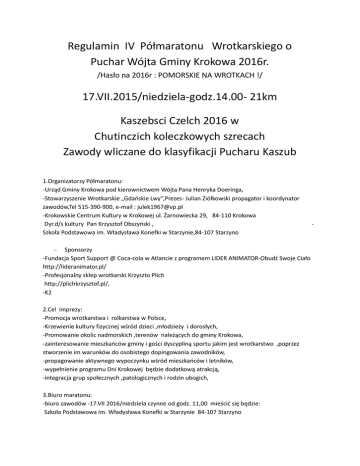 Regulamin IV Półmaratonu Wrotkarskiego o Puchar Wójta Gminy Krokowa 2016r. /Hasło na 2016r : POMORSKIE NA WROTKACH !/ 17.VII.2015/niedziela-godz.14.00- 21km Kaszebsci Czelch 2016 w Chutinczich koleczkowych szrecach Zawody wliczane do klasyfikacji Pucharu Kaszub 1.Organizatorzy Półmaratonu: -Urząd Gminy Krokowa pod kierownictwem Wójta Pana Henryka Doeringa, -Stowarzyszenie Wrotkarskie „Gdańskie Lwy”,Prezes- Julian Ziółkowski propagator i koordynator zawodów,Tel 515-390-900, e-mail : [email protected] -Krokowskie Centrum Kultury w Krokowej ul. Żarnowiecka 29, 84-110 Krokowa Dyr.d/s kultury Pan Krzysztof Obszyński , Szkoła Podstawowa im. Władysława Konefki w Starzynie,84-107 Starzyno – Sponsorzy -Fundacja Sport Support @ Coca-cola w Atlancie z programem LIDER ANIMATOR-Obudź Swoje Ciało http://lideranimator.pl/ -Profesjonalny sklep wrotkarski Krzyszto Plich http://plichkrzysztof.pl/, -K2 2.Cel imprezy: -Promocja wrotkarstwa i rolkarstwa w Polsce, -Krzewienie kultury fizycznej wśród dzieci ,młodzieży i dorosłych, -Promowanie okolic nadmorskich ,terenów należących do gminy Krokowa, -zainteresowanie mieszkańców gminy i gości dyscypliną sportu jakim jest wrotkarstwo ,poprzez stworzenie im warunków do osobistego dopingowania zawodników, -propagowanie aktywnego wypoczynku wśród mieszkańców i letników, -wypełnienie programu Dni Krokowej będzie dodatkową atrakcją, -integracja grup społecznych ,patologicznych i rodzin ubogich, 3.Biuro maratonu: -biuro zawodów -17.VII 2016/niedziela czynne od godz. 11,00 mieścić się będzie: Szkoła Podstawowa im. Władysława Konefki w Starzynie 84-107 Starzyno - 4.Zapisy: - https://elektronicznezapisy.pl/event/500.html przy pomocy Firmy odpowiadającej za pomiar elektroniczny „Good Time”. Zapisy przez Internet będą przyjmowane do dnia 15.07.2016 włącznie, -w dniu zawodów –biuro zawodów 5.Opłaty startowe: -do 17.06.2016 opłata wynosi 50zł, -od 18.06 do 16.07.2015 opłata wynosi 65zł, -w dniu zawodów opłata wynosi 100zł, -dzieci do lat 16 bezpłatnie-dotyczy biegów dzieci. 6.Opłaty należy wpłacać na adres: Stowarzyszenie Wrotkarskie „Gdańskie Lwy ”,80-008 Gdańsk, ul Batalionów Chłopskich 39 NUMER KONTA : 26 1090 1098 0000 0001 2972 1184 W tytule przelewu prosimy wpisać: PK Krokowa -Opłata startowa,imię i nazwisko /zawodnika/ 7.Opłata startowa nie podlega zwrotowi. 8.Dystanse i terminy: A/17 lipca/niedziela 2016- IV Półmaraton Wrotkarski o Puchar Wójta Gminy Krokowa, dystans 21km start główny godz. 14,00 /limit czasowy to 2godz/ biegi dzieci-do lat 12-dystans 600metrów-start godz. 13.30 -13-15lat-dystans 1000metrów-start godz.13.40 B/TRASA Zawody zostaną rozegrane w Kłaninie tj ok.6 km na wschód od Krokowej. Dojazd z Pucka drogą 213. Trasa wyścigu: Pętla usytuowana na trasie Kłanino -Połchówko. Jeden nawrót w Kłaninie przy skrzyżowaniu z drogą 213,drugi w Połchówku na wysokości zmiany jakości nawierzchni asfaltu. Jedna pętla liczy ok 5,5km-zawodnicy będą mieli do przejechania 4 pętle. Trasa o dobrym jakościowo asfalcie przebiega w terenie zabudowań i obszarze leśnym . Na trasie mamy zjazdy, podjazdy i odcinki płaskie przeplatane zakrętami. 9.Udział w zawodach: -W zawodach może wziąć udział każdy bez ograniczenia wieku, a w biegu na 21km ten kto ukończył 16 lat , posiada aktualne badania lekarskie bądź podpisze oświadczenie o zdolności i braku przeciwwskazań do biegu, a także zapoznał się z Regulaminem i zaakceptował go. Dzieci do 18 roku życia muszą posiadać pisemną zgodę rodziców lub opiekunów na start w zawodach. 10.Pomiar elektroniczny: -Zapewnia „Good Time”, 11.Zasady uczestnictwa: -Wszyscy zawodnicy są zobowiązani do startu w kasku ochronnym, -wskazane są także ochraniacze na ręce i nogi, -Każdy zawodnik otrzyma CZIP /2 warianty/ 1. przypięty w numer startowy, który należy przyczepić na piersi lub 2. czip do zamocowania na łydce nogi -limit czasu-czas zamknięcia trasy 2godz.dla biegu głównego 21km, - z uwagi ,iż zawodnicy jeżdżą po pętli tam i z powrotem ,dlatego wyprzedzani uczestnicy w inni trzymać się prawej strony drogi i umożliwić wyprzedzenie się przez nadjeżdżających z tyłu. Dla ostrzeżenia wyprzedzanych , zawodnik, który chce wyprzedzić może stosować ostrzegawcze okrzyki typu: ” UWAGA”, ”LEWA WOLNA”, ”LEWA IDZIE” ,lub inne –eliminujemy w ten sposób możliwość kolizji. Zawodnicy muszą zachować szczególną ostrożność przy wyprzedzaniu i wymijaniu jadących z przeciwka!, -podczas zawodów uczestnik powinien stosować się do poleceń sędziów, osób odpowiedzialnych za bezpieczeństwo, służb porządkowych ,Policji, Straży Gminnej ,Straży Granicznej, Pożarnej i Leśnej, -za skracanie trasy zawodnik zostanie zdyskwalifikowany, -po przekroczeniu limitu czasu zawodnik musi zejść z jezdni i zdjąć numer startowy, -obowiązuje szeroko pojęte sportowe zachowanie zawodników ! -Trasa przebiega przez miejscowości, przy ruchu zamkniętym ,ale mogą się zdarzyć nagłe przypadki zagrożenia życia co wiąże się z wjazdem samochodu karetki pogotowia ratunkowego, straży pożarnej, gminnej ,granicznej ,leśnej ,Policji -zawodnicy obowiązani są udostępnić przejazd tym służbą, -ostateczna decyzja w rozwiązywaniu sporów i interpretacja niniejszego regulaminu należy do organizatorów biegu, 12.Klasyfikacje: a/biegi dziecięce: -dzieci do lat 12 włącznie-chłopcy i dziewczęta-start wspólny, -dzieci 13do 16lat włącznie-chłopcy i dziewczęta-start wspólny, b/bieg główny -klasyfikacja generalna kobiet i mężczyzn-start wspólny. -klasyfikacje wiekowe kobiet i mężczyzn: -16-19lat, -20-29lat, -30-39lat, -40-49lat, -50-59lat, -60-69lat, -powyżej 70lat. 13. Nagrody: -biegi dziecięce: każdy uczestnik otrzymuje pamiątkowy upominek, niespodzianka !, -bieg główny: -każdy uczestnik ,który ukończy bieg otrzymuje pamiątkowy medal, -w klasyfik