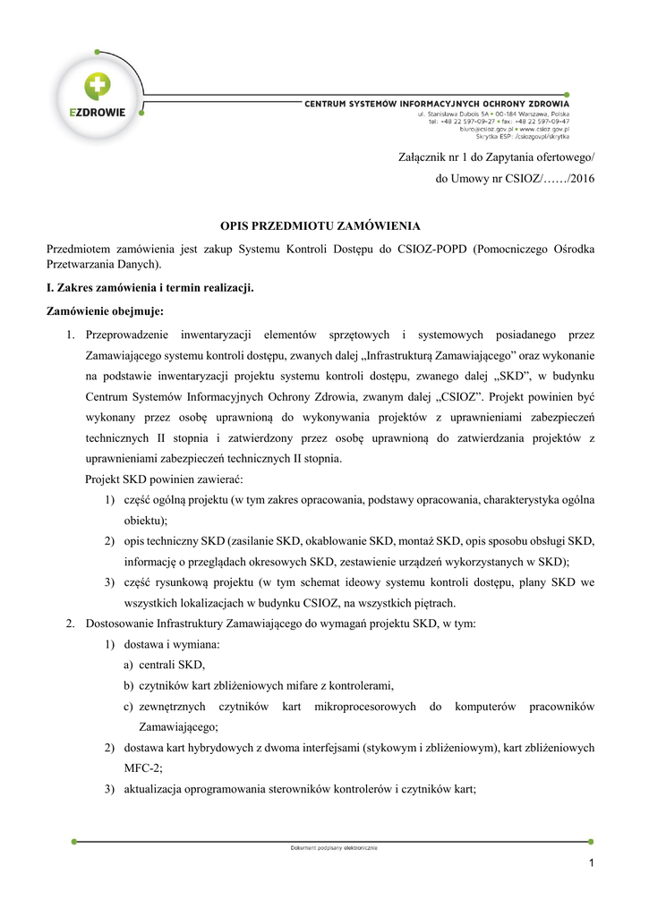 Załącznik nr 1 do Zapytania ofertowego/ do Umowy nr CSIOZ/……/2016 OPIS PRZEDMIOTU ZAMÓWIENIA Przedmiotem zamówienia jest zakup Systemu Kontroli Dostępu do CSIOZ-POPD (Pomocniczego Ośrodka Przetwarzania Danych). I. Zakres zamówienia i termin realizacji. Zamówienie obejmuje: 1. Przeprowadzenie inwentaryzacji elementów sprzętowych i systemowych posiadanego przez Zamawiającego systemu kontroli dostępu, zwanych dalej „Infrastrukturą Zamawiającego” oraz wykonanie na podstawie inwentaryzacji projektu systemu kontroli dostępu, zwanego dalej „SKD”, w budynku Centrum Systemów Informacyjnych Ochrony Zdrowia, zwanym dalej „CSIOZ”. Projekt powinien być wykonany przez osobę uprawnioną do wykonywania projektów z uprawnieniami zabezpieczeń technicznych II stopnia i zatwierdzony przez osobę uprawnioną do zatwierdzania projektów z uprawnieniami zabezpieczeń technicznych II stopnia. Projekt SKD powinien zawierać: 1) część ogólną projektu (w tym zakres opracowania, podstawy opracowania, charakterystyka ogólna obiektu); 2) opis techniczny SKD (zasilanie SKD, okablowanie SKD, montaż SKD, opis sposobu obsługi SKD, informację o przeglądach okresowych SKD, zestawienie urządzeń wykorzystanych w SKD); 3) część rysunkową projektu (w tym schemat ideowy systemu kontroli dostępu, plany SKD we wszystkich lokalizacjach w budynku CSIOZ, na wszystkich piętrach. 2. Dostosowanie Infrastruktury Zamawiającego do wymagań projektu SKD, w tym: 1) dostawa i wymiana: a) centrali SKD, b) czytników kart zbliżeniowych mifare z kontrolerami, c) zewnętrznych czytników kart mikroprocesorowych do komputerów pracowników Zamawiającego; 2) dostawa kart hybrydowych z dwoma interfejsami (stykowym i zbliżeniowym), kart zbliżeniowych MFC-2; 3) aktualizacja oprogramowania sterowników kontrolerów i czytników kart; 1 4) dostawa elementów sprzętowych i aplikacyjnych (oprogramowania) SKD innych niż określone w pkt 1 i 2 niezbędnych do dostosowania Infrastruktury zamawiającego do projektu SKD. 5) instalacja elementów określonych w pkt 1-4, podłączenie do istniejącej Infrastruktury Zamawiającego wraz z rozprowadzeniem okablowania , wymiana zużytych elementów elektromechanicznych oraz konfiguracja i uruchomienie dostarczonych elementów we wskazanych przez Zamawiającego pomieszczeniach. 3. Przekazanie Zamawiającemu szczegółowych instrukcji obsługi, użytkowania i konserwacji SKD. 4. Wykonanie prac niezbędnych do przywrócenia wyglądu pomieszczeń do stanu sprzed rozpoczęcia prac wskazanych w pkt 2. 5. Wykonanie oraz przekazanie Zamawiającemu dokumentacji powykonawczej zatwierdzonej przez osobę z uprawnieniami zabezpieczeń technicznych II stopnia. Dokumentacja powykonawcza powinna zawierać część ogólną, , opis techniczny SKD oraz część rysunkową zgodnie ze schematem i zakresem projektu SKD określonym w pkt 1. 6. Przekazanie Zamawiającemu atestów i certyfikatów związanych z SKD. 7. Przeprowadzenie instruktażu pracowników w zakresie obsługi i użytkowania SKD. Instruktażem objętych zostanie 5 pracowników CSIOZ, w tym 2 pracowników Wydziału Administracyjnego, 2 pracowników Wydziału Eksploatacji Systemów Teleinformatycznych oraz Administrator Bezpieczeństwa Informacji. Instruktaż obejmuje co najmniej: 1) teoretyczne omówienie systemu RCP, w tym: koncepcja funkcjonalna, aktualizacja SKD, integracje i funkcjonalności SKD; 2) konfiguracja przejścia jednostronnie kontrolowanego; 3) konfiguracja przejścia dwustronnie kontrolowanego; 4) konfiguracja w zakresie użytkowników, identyfikatorów i nadawania uprawnień; 5) monitorowanie stref obecności; 6) monitorowanie i logi zdarzeń; 7) administrowanie SKD (operatorzy, role i partycje); 8) integracja z systemem SKD – RCP, w tym: a) parametry użytkowników, b) tryby RCP, c) konfiguracja rejestratorów, d) dodawanie użytkowników, e) tworzenie trybów RCP, 2 f) sterowanie trybem RCP, g) eksport konfiguracji i zdarzeń, h) historia pracy pracownika w RCP, i) kreator raportów pracowników, j) centrum raportów. Wykonawca zobowiązany jest zrealizować przedmiot zamówienia w terminie 20 dni od dnia podpisania umowy, jednak nie później niż do dnia 2016-12-14, z uwzględnieniem terminów wynikających z przedstawionego przez Wykonawcę i zaakceptowanego przez Zamawiającego Harmonogramu Prac. Zamawiający zastrzega sobie prawo do korekt terminu wykonania prac określonych w zaakceptowanym Harmonogramie Prac, w uzgodnieniu z Wykonawcą. Przedmiot zamówienia realizowany będzie w siedzibie Zamawiającego w poziomie garażu, parteru, I-ego i II-ego piętra. Obejmuje wymianę centrali kontroli dostępu, akumulatorów, terminali dostępu standardu EM 125 kHz UNIQUE (EM4100/4102) na standard 13.56 MHz (ISO/IEC 14443A/ MIFARE), przy użyciu kart hybrydowych z dwoma interfejsami (ISO/IEC 7816 ; ISO/IEC 14443 typ A/ MIFARE). Zamawiający, poprzez modernizację systemów kontroli dostępu SKD do stref chronionych, zakłada podniesienie poziomu bezpieczeństwa, zabezpieczenia mienia na terenie obiektu, pozyskania danych o osobach przebywających w obiekcie. II. Wymagania ogólne. SKD musi zapewniać co najmniej możliwość: 1. 2. 3. 4. 5. 6. 7. 8. 9. 10. rejestrowania autoryzowanego dostępu do stref administracyjnych i chronionych; rejestrowania próby nieautoryzowanego dostępu przez karty nieuprawnione; rejestrowanie braku przejścia po autoryzacji kartą uprawnioną; obsługę bramek obrotowych, uchylnych (z potwierdzeniem przejścia) i depozytora kluczy; rejestrowanie czasu pracy; pracę bez zasilania podstawowego w czasie min. 5 godz.; wykrywanie i rejestrowanie naruszenia przejścia kontrolowanego bez autoryzacji; otwarcia przejścia przez system PPOŻ oraz rejestrowania tego faktu; wykorzystania mechanizmu anti-passback na dowolnym przejściu kontrolowanym; odblokowania przejścia na stałe przez kartę specjalnych uprawnień. SKD musi być odseparowany galwanicznie od pozostałej si