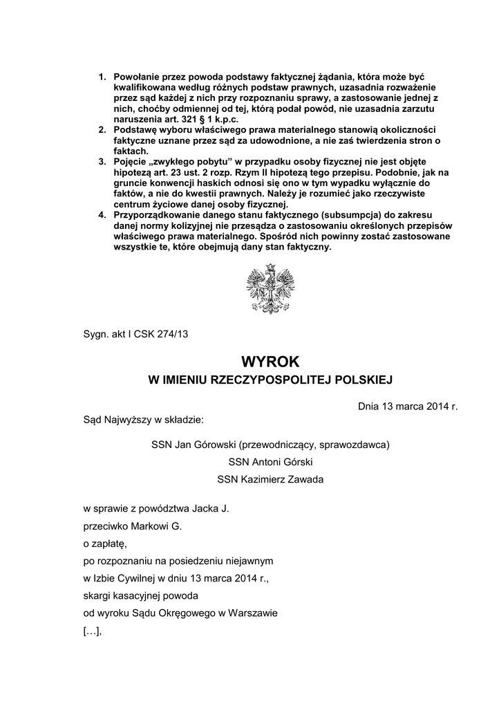 1. Powołanie przez powoda podstawy faktycznej żądania, która może być kwalifikowana według różnych podstaw prawnych, uzasadnia rozważenie przez sąd każdej z nich przy rozpoznaniu sprawy, a zastosowanie jednej z nich, choćby odmiennej od tej, którą podał powód, nie uzasadnia zarzutu naruszenia art. 321 § 1 k.p.c. 2. Podstawę wyboru właściwego prawa materialnego stanowią okoliczności faktyczne uznane przez sąd za udowodnione, a nie zaś twierdzenia stron o faktach. 3. Pojęcie „zwykłego pobytu” w przypadku osoby fizycznej nie jest objęte hipotezą art. 23 ust. 2 rozp. Rzym II hipotezą tego przepisu. Podobnie, jak na gruncie konwencji haskich odnosi się ono w tym wypadku wyłącznie do faktów, a nie do kwestii prawnych. Należy je rozumieć jako rzeczywiste centrum życiowe danej osoby fizycznej. 4. Przyporządkowanie danego stanu faktycznego (subsumpcja) do zakresu danej normy kolizyjnej nie przesądza o zastosowaniu określonych przepisów właściwego prawa materialnego. Spośród nich powinny zostać zastosowane wszystkie te, które obejmują dany stan faktyczny. Sygn. akt I CSK 274/13 WYROK W IMIENIU RZECZYPOSPOLITEJ POLSKIEJ Dnia 13 marca 2014 r. Sąd Najwyższy w składzie: SSN Jan Górowski (przewodniczący, sprawozdawca) SSN Antoni Górski SSN Kazimierz Zawada w sprawie z powództwa Jacka J. przeciwko Markowi G. o zapłatę, po rozpoznaniu na posiedzeniu niejawnym w Izbie Cywilnej w dniu 13 marca 2014 r., skargi kasacyjnej powoda od wyroku Sądu Okręgowego w Warszawie […], 2 uchyla zaskarżony wyrok i wyrok Sądu Rejonowego dla Warszawy - Woli w Warszawie […] oraz przekazuje sprawę temu Sądowi do ponownego rozpoznania i orzeczenia o kosztach postępowania apelacyjnego i kasacyjnego. UZASADNIENIE W pozwie z dnia 12 maja 2010 r., który wpłynął do sądu w dniu 18 maja 2010 r. sporządzonym osobiście - Jacek J. wniósł o zasądzenie od Marka G. kwoty 66 748,50 zł. W uzasadnieniu podniósł, że w dniu 31 lipca 2009 r. w Dubaju pozwany przedstawiając się jako dyrektor wykonawczy i partner spółki L. złożył mu ofertę pracy na stanowisku dyrektora koordynującego działanie tej spółki w Emiratach Arabskich. Powód przyjął tę ofertę pracy i na podstawie podpisanej przez strony umowy podjął wykonywanie powierzonych obowiązków. Pozwany zwlekał z zapłatą wynagrodzenia przesuwając kolejne terminy zapłaty i w końcu nie zapłacił powodowi ani złotówki. Wkrótce powód dowiedział się, że pozwany nie jest partnerem Spółki L., lecz teściem Roberta R. - właściciela spółki R. w T. Nigdy nie miał upoważnienia od tych spółek do zawierania umów i dopuścił się oszustwa wobec powoda. Za jakieś nadużycia Marek G. został aresztowany w Dubaju. Podniósł, że nie otrzymał wynagrodzenia za okres od dnia 27 lipca 2009 r. do dnia 12 października 2009 r., co po przeliczeniu waluty obcej na złotówki stanowi kwotę 20 317,50 zł. Wskazał także, że pozostałość dochodzonej kwoty stanowi zwrot wydatków przewidzianych umową oraz kosztów jego pobytu w Dubaju do końca lutego 2010 r. W pozwie odwołał się do szczegółowego ich pisemnego wyliczenia wskazując, że są one związane przyczynowo z umową stron, a także z nagannym postępowaniem pozwanego. Wyrokiem zaocznym z dnia 13 stycznia 2011 r. Sąd Rejonowy […] uwzględnił powództwo. W sprzeciwie pozwany, zaskarżając go w całości, podniósł, 3 że nie był prawidłowo powiadomiony o terminie rozprawy i nie został doręczony mu odpis pozwu. Wskazał, że zasądzona kwota wyrokiem zaocznym jest kwotą nienależną powodowi i domagał się, aby Sąd dał mu możliwość przedstawienia na tę okoliczność wniosków dowodowych. Ustanowiony przez pozwanego jego pełnomocnik na rozprawie w dniu 3 sierpnia 2011 r. zażądał oddalenia powództwa ze względu na brak podstawy prawnej dochodzonego roszczenia. Z kolei, na rozprawie w dniu 5 października 2011 r., pełnomocnik pozwanego podniósł zarzut „niewłaściwego oznaczenia strony pozwanej, zarzut właściwości Sądu Pracy, a także zarzucił, że w sytuacji, gdyby za podstawę powództwa został przyjęty art. 415 k.c., to kwestionuje wysokość odszkodowania. W odpowiedzi pełnomocnik powoda wskazał, że zarzuty te są bezpodstawne. Stwierdził, że Jacek J. wykonywał obowiązki na rzecz pozwanego Marka G., a nie na rzecz spółki L.. Wyrokiem z dnia 15 lutego 2012 r. Sąd Rejonowy […] uchylił wyrok zaoczny i oddalił powództwo. Ustalił, że powód od wielu lat pracował w Dubaju i w połowie sierpnia 2009 r. kończył mu się kontrakt. Jego znajomi wskazali mu pozwanego, który stał się właścicielem spółki L. zarejestrowanej w Dubaju. Powód spotkał się z pozwanym, z którym rozpoczął rozmowy na temat współpracy. Ostatecznie, Jacek J. przedstawił na piśmie ofertę pracy i strony procesu złożyły na niej podpisy w dniu 31 lipca 2009 r. Na podstawie tej umowy powód miał zajmować stanowisko dyrektora z zakresem obowiązków polegających na zarządzaniu i raportowaniu o działalności spółki. Ponadto, miał być odpowiedzialny za nadzór i kierowanie pracami związanymi z remontem willi U. O. W punkcie B umowy zawarto zapis warunkujący podpisanie ostatecznej umowy „kontraktu” w chwili, gdy zostanie sfinalizowane przejęcie 100% udziałów w spółce L. przez Marka G. Na podstawie tej umowy powodowi miało być przekazane 3% udziałów w spółce oraz ustalone wynagrodzenie. Strony uzgodniły w postanowieniu końcowym, że po akceptacji przez powoda zakresu obowiązków określonego w umowie oraz warunków finansowych i przejęciu przez pozwanego 100% udziałów w spółce L. podpisany zostanie między nimi jeden kontrakt. 4 Następnie powód opuścił w dniu 15 sierpnia 2009 r. Dubaj, udając się na wcześniej zaplanowany urlop. Po powrocie, pomimo niepodpisania przez strony kontraktu, Jacek J. w dniu 23 września 2009 r. przystąpił do wykonywania prac w zakresie 