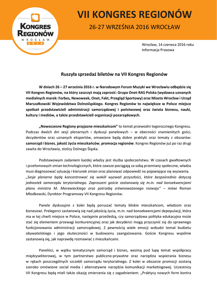 VII KONGRES REGIONÓW 26-27 WRZEŚNIA 2016 WROCŁAW Wrocław, 14 czerwca 2016 roku Informacja Prasowa Ruszyła sprzedaż biletów na VII Kongres Regionów W dniach 26 – 27 września 2016 r. w Narodowym Forum Muzyki we Wrocławiu odbędzie się VII Kongres Regionów, na który zaszczyt mają zaprosić: Grupa Onet-RAS Polska (wydawca uznanych medialnych marek: Forbes, Newsweek, Onet, Fakt, Przegląd Sportowy) oraz Miasto Wrocław i Urząd Marszałkowski Województwa Dolnośląskiego. Kongres Regionów to największe w Polsce miejsce spotkań przedstawicieli administracji samorządowej i państwowej oraz świata biznesu, nauki, kultury i mediów, a także przedstawicieli organizacji pozarządowych. „Nowoczesne Regiony przyjazne mieszkańcom” to temat przewodni tegorocznego Kongresu. Podczas dwóch dni sesji plenarnych i dyskusji panelowych – w obecności znamienitych gości, decydentów oraz uznanych ekspertów, omawiane będą dobre praktyki oraz tematy z obszarów: samorząd i biznes, jakość życia mieszkańców, promocja regionów. Kongres Regionów już po raz drugi zawita do Wrocławia, stolicy Dolnego Śląska. Podstawowym zadaniem każdej władzy jest służba społeczeństwu. W czasach gwałtownych i przełomowych zmian technologicznych, które zawsze pociągają za sobą przemiany społeczne, władza musi diagnozować sytuację i kierunek zmian oraz planować odpowiedź na pojawiające się wyzwania. „Sesje plenarne będą koncentrować się wokół wyzwań przyszłości, które bezpośrednio dotyczą jednostek samorządu terytorialnego. Zaproszeni goście zastanowią się m.in. nad konsekwencjami planu ministra M. Morawieckiego oraz potrzebą zrównoważonego rozwoju” – mówi Roman Młodkowski, Dyrektor Programowy VII Kongresu Regionów. Panele dyskusyjne z kolei będą poruszać tematy bliskie mieszkańcom, władzom oraz biznesowi. Prelegenci zastanowią się nad jakością życia, m.in. nad konsekwencjami depopulacji, która ma w tej chwili miejsce w Polsce, następnie prześledzą, czy samorządowa polityka edukacyjna może stać się elementem przewagi konkurencyjnej oraz jak decydenci mogą przyczynić się do sprawnego funkcjonowania administracji samorządowej. Z pewnością wiele emocji wzbudzi temat budżetu obywatelskiego i jego skuteczności w budowaniu zaangażowania. Goście Kongresu wspólnie zastanowią się, jak naprawdę rozmawiać z mieszkańcami. Paneliści, w wątku tematycznym samorząd i biznes, wezmą pod lupę temat współpracy międzysektorowej, w tym partnerstwo publiczno-prywatne oraz narzędzia wspierania biznesu w rękach poszczególnych szczebli samorządu terytorialnego. Z kolei w obszarze promocji zostaną szeroko omówione social media i alternatywne narzędzia komunikacji marketingowej. Uczestnicy VII Kongresu będą mieli także okazję zmierzenia się z zagadnieniem: „Praktycy nowych form kontra sceptycy. Tanio, ale głośno. Wizerunek pomysłem stoi, czyli o najskuteczniejszych kampaniach promocyjnych miast i regionów”. Wątek promocji regionów dostarczy rzetelnej wiedzy o nowych trendach w komunikacji skierowanej zarówno do mieszkańców, jak i do inwestorów. Podczas uroczystej Gali, wieńczącej pierwszy dzień VII Kongresu Regionów, zostaną ogłoszeni laureaci Rankingu Prezydentów Miast N15, organizowanego przez tygodnik Newsweek. Stałym punktem na mapie Kongresu będzie również prezentacja rankingu „Miasta atrakcyjne dla biznesu”, realizowanego przez magazyn Forbes oraz rozstrzygnięcie konkursu „Metamorfoza w moim Regionie. Przed i po”. Celem konkursu jest nagrodzenie najbardziej wartościowych programów rewitalizacji wybranych obiektów i/lub obszarów – pod kątem korzyści, jakie przyniosły mieszkańcom. Zgłoszenia przyjmowane będą od 4 lipca do 11 września, pod adresem mailowym [email protected]. Grupa Onet-RAS Polska ufundowała dla zwycięzcy pakiet promocyjno-reklamowy o wartości: 500.000 złotych brutto. Tegoroczny Kongres będzie wzbogacony o liczne nowości m.in. zostanie uruchomiona nowa strona internetowa www.kongresregionow.pl, a także pojawią się wydarzenia towarzyszące, jak Kongres Miast Sportowych „Polska na Medal”. 26 września 2016 r. eksperci ze świata biznesu sportowego poruszą w pięciu panelach tematycznych najważniejsze problemy związane z rozwojem sportu w Polsce, w szczególności na poziomie samorządowym. Przyjrzymy się takim kwestiom, jak: infrastruktura sportowa, wychowanie przyszłych mistrzów, skuteczna organizacja wydarzeń sportowych, czy budowanie marki miasta poprzez sport. Istotnym punktem tego wyjątkowego, sportowego dnia będzie prezentacja projektu "Polska na Medal", nowej inicjatywy Przeglądu Sportowego i Grupy Onet-RAS Polska. „Polska na Medal” to kompleksowy program wspierający sport dzieci i młodzieży, integrację środowisk lokalnych, prowadzenie sportowego trybu życia oraz inicjatyw związanych z infrastrukturą sportową. Patronat honorowy nad projektem objął Witold Bańka, Minister Sportu i Turystki. O Kongresie Regionów Kongres Regionów to największe w Polsce miejsce spotkań przedstawicieli administracji samorządowej i państwowej oraz świata biznesu, nauki i organizacji pozarządowych, a także reprezentantów sportu, kultury i mediów. W czasie dwóch dni sesji plenarnych i dyskusji panelowych – w obecności znamienitych gości, decydentów oraz uznanych ekspertów, omawiane są dobre praktyki oraz tematy związane z rozwojem miast i regionów. Podczas uroczystej Gali wręczane zostają prestiżowe nagrody w rankingu Prezydentów Miast N15 (Newsweek) oraz w rankingu „Miasta atrakcyjne dla biznesu” (Forbes). VII Kongres Regionów odbędzie się w dniach 26-27 września w Narodowym Forum Muzyki we Wrocławiu.