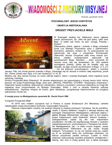 Poznań, grudzień 2016 POCHWALONY JEZUS CHRYSTUS I MARYJA NIEPOKALANA DRODZY PRZYJACIELE MISJI W Ewangelii według św. Mateusza Jezus ogłasza swoim słuchaczom, że: „Nikt nie jest dobry, tylko sam Bóg”. O sobie zaś mówi, że jest: „Drogą, Prawdą i Życiem”. Odkrywaniu dobra, piękna i prawdy o Bogu poświęcił życie Lud Starego Przymierza wraz z patriarchami, prorokami, sędziami, królami itp. To poszukiwanie nie zakończyło się wraz z przyjściem Emmanuela. Obecność Jezusa Chrystusa dała nowy impuls tym, którzy niejako profesjonalnie zajmowali się poznawaniem Boga. Nikodem – który przyszedł do Jezusa nocą, aby się dowiedzieć, że: „Kto spełnia wymagania prawdy, zbliża się do światła, aby się okazało, że jego uczynki są dokonane w Bogu” (J 3, 21) – nie był jedynym poszukującym. Jeden z uczniów Jezusa, Filip, też chciał poznać prawdę o Bogu. Zwracając się do Jezusa w imieniu całej wspólnoty, prosił Go: „Panie, pokaż nam Ojca, a to nam wystarczy” (J 14, 8). Módlmy się, aby narody Europy na nowo odkryły piękno, dobro i prawdę Ewangelii, która napełnia życie radością i nadzieją. Drodzy Przyjaciele Misji Oblackich!. W okresie adwentowym nie zapominajmy o licznej rzeszy ludzi, którzy jeszcze nie znają Prawdziwego Boga, który jest „DROGĄ, PRAWDĄ I ŻYCIEM”. Wspierajmy misjonarzy i misjonarki naszą modlitwą, ofiarowanym cierpieniem, dobrymi uczynkami i pomocą materialną, by mogli jak najwięcej dusz przyprowadzić do Bożego Dzieciątka. Wielu z nich w okresie Adwentu odbywa niebezpieczne wyprawy misyjne do buszu, głosi rekolekcje, przygotowuje katechumenów do przyjęcia sakramentu Chrztu św. O swojej pracy na Madagaskarze opowiada Br. Daniel Kloch OMI Czcigodni Przyjaciele Misji! W 2016 roku miałem szczęście być w Polsce w czasie Światowych Dni Młodzieży; solidnie naładowałem swoje akumulatory duchowe i wypocząłem fizycznie. Obecnie rozpocząłem czwarty rok posługi misyjnej w mieście portowym Tamatave. Na ile potrafimy, razem z Ojcami oblatami i księżmi z diecezji staramy się pomagać mieszkańcom Madagaskaru odkrywać piękno i głębię Bożego Miłosierdzia; pomaga nam w tym prężna grupa miejscowych osób świeckich, których postawa i zaangażowanie często są dla nas wspaniałym przykładem. Od kilku lat współpracują również z osobami niepełnosprawnymi, pochodzącymi z Tamatave lub okolic. Na Madagaskarze, jak i w wielu innych krajach, osoby niepełnosprawne traktowane są jak ludzie drugiej kategorii. Tymczasem, to nie oni wybrali swój los; często są to na przykład ofiary źle zrobionego zastrzyku, po którym przychodzi paraliż kończyn. Ludzie ci mimo Br. Daniel z niewidomą dziewczynką, która kalectwa wykorzystują wszelkie posiadane umiejętności i uczy się pisać i czytać językiem brajla talenty, aby móc w miarę godnie żyć, a także pomagać innym. Część z nich należy do stowarzyszeń, które wykonują różne prace: szycie, haftowanie, kuśnierstwo, naprawy telefonów, zegarków, hodowlę kur. Niektórzy są nauczycielami w szkołach lub prowadzą audycje w radio. W ostatnim czasie odwiedziłem kilkanaście rodzin, które mają osoby niepełnosprawne. Poznałem bliżej warunki życia codziennego, pomogłem w opłaceniu nauki i zakupie przyborów szkolnych dla ich dzieci. W miarę osobistego poznawania faktycznej sytuacji liczba otrzymujących pomoc stopniowo wzrasta; także dlatego, że część uczniów otrzymujących do niedawna pomoc zakończyła już pobieranie nauki lub dzięki lepszej sytuacji materialnej może sobie pozwolić np. na zakup przyborów szkolnych za własne pieniądze. Br. Daniel Wtedy pomoc, którą wcześniej otrzymywali, przekazuję przy zbieraniu śmieci innym, bardziej potrzebującym. Wspólnie też do recyklingu pracujemy przy recyklingu, tzn. przy przetwórstwie odpadków z warzyw i owoców, dajemy je dżdżownicom w specjalnie założonej hodowli, a one przerabiają to wszystko na bio-humus (doskonałej jakości kompost), który używamy do uprawy warzyw, a także sprzedajemy rolnikom do użyźniania ziemi przed sadzeniem ryżu. W listopadzie wybieram się do naszej oblackiej misji Masomeloka. Właśnie na tej misji powstała malgaska grupa opiekunów bliźniąt i działa tam do dziś. Wiem, że z całej 50-osobowej grupy bliźniąt zmarło śmiercią naturalną dwoje dzieci. Reszta rośnie i uczy się w wiejskich szkołach, najstarsza - Obeda wyszła już za mąż. Wspólne zdjęcie po modlitwie z szefami wioski W zeszłym roku byłem na wielkim spotkaniu grup Odnowy w Duchu Świętym w mieście Manganiany. Przyjechało tam ponad 5000 osób z całej wyspy. To właśnie tam, przed stu laty, powstał ten haniebny zwyczaj zabijania bliźniaków. Teraz, po tylu latach, wspólnie dziękowaliśmy Bogu za jego zaniechanie. Muszę przyznać, że nie było to łatwe zadanie, ale z Bogiem można wszystkiego dokonać. Przybyło tam na wspólną modlitwę około 30 szefów wiosek, wszyscy w swoich uroczystych strojach. Dzięki modlitwom wielu ludzi z różnych krajów i różnorodnym staraniom (także polskich opiekunów!) zwyczaj uśmiercania bliźniąt już w 90% został zaniechany. Moi kochani! Zapewniam Was, że każda pomoc przychodząca na adopcję bliźniąt jest w stu procentach wykorzystana na ich rozwój w rodzinie i środowisku, gdzie przebywają. Naszym założeniem jest pomoc w potrzebie tak, aby dana osoba stała się samodzielna, a ponadto wyczulona na pomoc innym. Dziękuję każdemu z Was za otwarte serce, modlitwę zanoszoną do Boga, za każdy dar płynący z serca. Razem z naszymi wspólnymi podopiecznymi niesiemy przed Boży Tron wszystkie codzienne sprawy Wasze i Waszych rodzin. Niech Pan Wam błogosławi na każdy dzień, a Maryja otacza swą matczyną opieką. Pamiętający w modlitwie Br. Daniel Kloch OMI Z Prokury Misyjnej kierujemy do Was, Drodzy Przyjaciele Misji Oblackich, gorące podziękowania za wszy