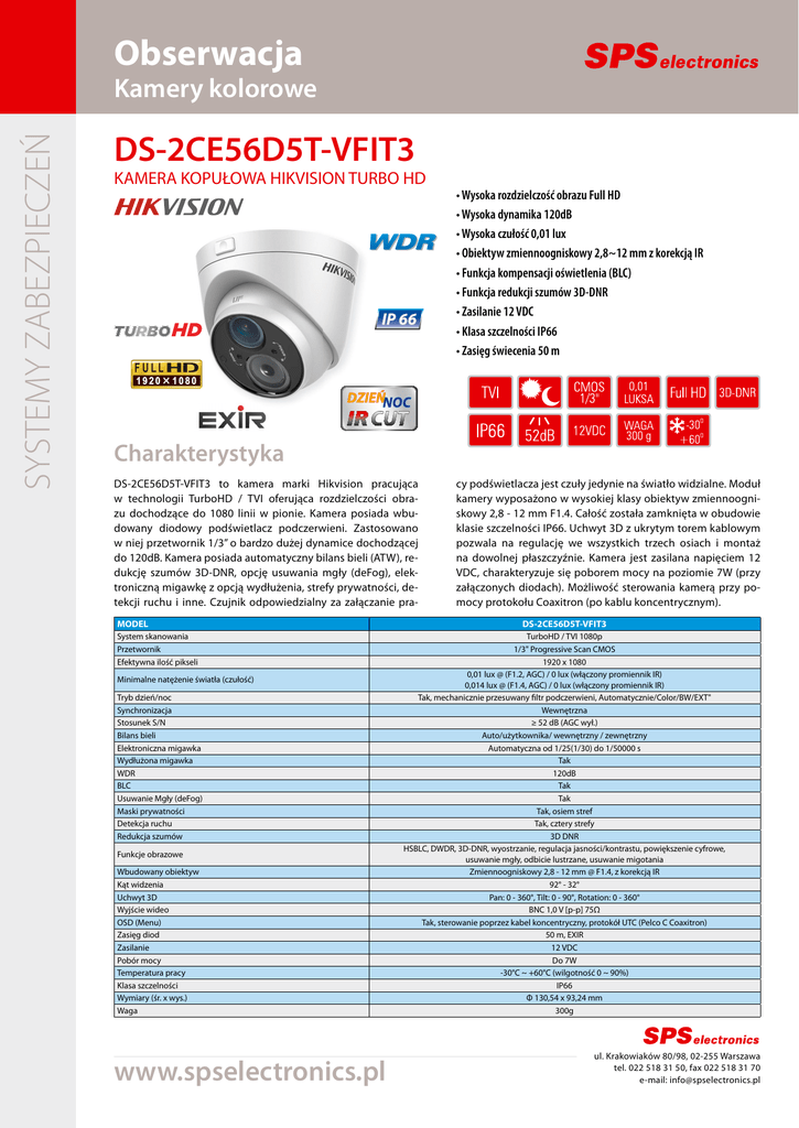 Obserwacja SYSTEMY ZABEZPIECZEŃ Kamery kolorowe DS-2CE56D5T-VFIT3 KAMERA KOPUŁOWA HIKVISION TURBO HD • Wysoka rozdzielczość obrazu Full HD • Wysoka dynamika 120dB • Wysoka czułość 0,01 lux • Obiektyw zmiennoogniskowy 2,8~12 mm z korekcją IR • Funkcja kompensacji oświetlenia (BLC) • Funkcja redukcji szumów 3D-DNR • Zasilanie 12 VDC • Klasa szczelności IP66 • Zasięg świecenia 50 m Charakterystyka DS-2CE56D5T-VFIT3 to kamera marki Hikvision pracująca w technologii TurboHD / TVI oferująca rozdzielczości obrazu dochodzące do 1080 linii w pionie. Kamera posiada wbudowany diodowy podświetlacz podczerwieni. Zastosowano w niej przetwornik 1/3” o bardzo dużej dynamice dochodzącej do 120dB. Kamera posiada automatyczny bilans bieli (ATW), redukcję szumów 3D-DNR, opcję usuwania mgły (deFog), elektroniczną migawkę z opcją wydłużenia, strefy prywatności, detekcji ruchu i inne. Czujnik odpowiedzialny za załączanie praMODEL System skanowania Przetwornik Efektywna ilość pikseli Minimalne natężenie światła (czułość) Tryb dzień/noc Synchronizacja Stosunek S/N Bilans bieli Elektroniczna migawka Wydłużona migawka WDR BLC Usuwanie Mgły (deFog) Maski prywatności Detekcja ruchu Redukcja szumów Funkcje obrazowe Wbudowany obiektyw Kąt widzenia Uchwyt 3D Wyjście wideo OSD (Menu) Zasięg diod Zasilanie Pobór mocy Temperatura pracy Klasa szczelności Wymiary (śr. x wys.) Waga www.spselectronics.pl cy podświetlacza jest czuły jedynie na światło widzialne. Moduł kamery wyposażono w wysokiej klasy obiektyw zmiennoogniskowy 2,8 - 12 mm F1.4. Całość została zamknięta w obudowie klasie szczelności IP66. Uchwyt 3D z ukrytym torem kablowym pozwala na regulację we wszystkich trzech osiach i montaż na dowolnej płaszczyźnie. Kamera jest zasilana napięciem 12 VDC, charakteryzuje się poborem mocy na poziomie 7W (przy załączonych diodach). Możliwość sterowania kamerą przy pomocy protokołu Coaxitron (po kablu koncentrycznym). DS-2CE56D5T-VFIT3 TurboHD / TVI 1080p 1/3" Progressive Scan CMOS 1920 x 1080 0,01 lux @ (F1.2, AGC) / 0 lux (włączony promiennik IR) 0,014 lux @ (F1.4, AGC) / 0 lux (włączony promiennik IR) Tak, mechanicznie przesuwany filtr podczerwieni, Automatycznie/Color/BW/EXT" Wewnętrzna ≥ 52 dB (AGC wył.) Auto/użytkownika/ wewnętrzny / zewnętrzny Automatyczna od 1/25(1/30) do 1/50000 s Tak 120dB Tak Tak Tak, osiem stref Tak, cztery strefy 3D DNR HSBLC, DWDR, 3D-DNR, wyostrzanie, regulacja jasności/kontrastu, powiększenie cyfrowe, usuwanie mgły, odbicie lustrzane, usuwanie migotania Zmiennoogniskowy 2,8 - 12 mm @ F1.4, z korekcją IR 92° - 32° Pan: 0 - 360°, Tilt: 0 - 90°, Rotation: 0 - 360° BNC 1,0 V [p-p] 75Ω Tak, sterowanie poprzez kabel koncentryczny, protokół UTC (Pelco C Coaxitron) 50 m, EXIR 12 VDC Do 7W -30°C ~ +60°C (wilgotność 0 ~ 90%) IP66 Φ 130,54 x 93,24 mm 300g ul. Krakowiaków 80/98, 02-255 Warszawa tel. 022 518 31 50, fax 022 518 31 70 e-mail: [email protected]