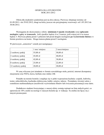 OFERTA DLA STUDENTÓW ROK 2011/2012 Oferta dla studentów podzielona jest na dwa okresy. Pierwszy obejmuje terminy od 01.09.2011 r do 29.02.2012, drugi na który jeszcze nie przyjmujemy rezerwacji: od 1.03.2012 do 30.06.2012. Wymagania do skorzystania z oferty: minimum 4 zjazdy (weekendy) oraz opłacanie noclegów z góry w transzach. Jeśli zjazdów będzie 4 to 2 transze, jeśli więcej niż 4 to transz będzie 3 .Pierwsza płatna przed 1 pobytem lub przed drugim noclegiem po wystawieniu faktury w formie przelewu na konto. Druga transza płatna przed 3 noclegiem. W pierwszym „semestrze” cennik jest następujący: 1 noc/ miejsce 2 noce/miejsce 2 osobowy pokój 55,00 zł 50,00 zł 3 osobowy pokój 45,00 zł 40,00 zł 4 osobowy pokój 42,00 zł 38,00 zł 8 osobowy pokój 25,00 zł 22,00 zł 12 osobowy pokój 20,00 zł 20,00 zł W cenę wliczone jest śniadanie w formie szwedzkiego stołu, pościel, internet (komputery stacjonarne oraz WiFi), kawa, herbata oraz mleko 24h Ponadto na terenie hostelu ( znajduje się w pełni wyposażona kuchnia: czajnik, lodówka, toster, mikrofalówka, kuchenka elektryczna, kubki, sztućce, talerze. Posiadamy również salon z rzutnikiem multimedialnym (możliwość wyświetlania filmów lub ćwiczenia prezentacji) oraz darts. Dodatkowo studenci korzystający z naszej oferty zostają wpisani na listę stałych gości, co uprawnia do 10% zniżki na noclegi w naszym hostelu np. w wakacje. Ta zniżka nie łączy się z innymi promocjami.
