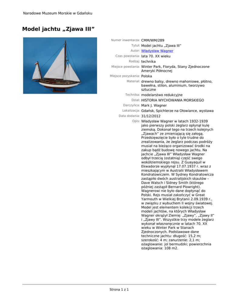 Narodowe Muzeum Morskie w Gdańsku Model jachtu „Zjawa III” Numer inwentarza: CMM/WM/289 Tytuł: Model jachtu „Zjawa III” Autor: Władysław Wagner Czas powstania: lata 70. XX wieku Rodzaj: technika Miejsce powstania: Winter Park, Floryda, Stany Zjednoczone Ameryki Północnej Miejsce pozyskania: Polska Materiał: drewno balsy, drewno mahoniowe, płótno, bawełna, stilon, aluminium, tworzywo sztuczne Technika: modelarstwo redukcyjne Dział: HISTORIA WYCHOWANIA MORSKIEGO Darczyńca: Mark J. Wagner Lokalizacja: Gdańsk, Spichlerze na Ołowiance, wystawa Data dodania: 31/12/2012 Opis: Władysław Wagner w latach 1932-1939 jako pierwszy polski żeglarz opłynął kulę ziemską. Dokonał tego na trzech kolejnych „Zjawach” ze zmieniającą się załogą. Przedsięwzięcie było o tyle trudne do zrealizowania, że żeglarz podczas podróży musiał na bieżąco organizować środki na zakup bądź budowę nowego jachtu. Na jachcie „Zjawa III” Władysław Wagner odbył trzecią (ostatnią) część swego wokółziemskiego rejsu. Z Guayaquil w Ekwadorze wypłynął 17.07.1937 r. wraz z mieszkającym w Australii Władysławem Kondratowiczem. W Sydney Kondratowicza zastąpiło dwóch australijskich skautów – Dave Walsch i Sidney Smith (którego później zastąpił Bernard Plowright). Wagnerowi nie było dane dopłynąć do Polski. Rejs musiał zakończyć w Great Yarmouth w Wielkiej Brytanii 2.09.1939 r., w związku z wybuchem II wojny światowej. Model jest elementem kolekcji trzech modeli jachtów, na których Władysław Wagner okrążył Ziemię: „Zjawy”, „Zjawy II” i „Zjawy III”. Wszystkie trzy modele żeglarz wykonał własnoręcznie w latach 70. XX wieku w Winter Park w Stanach Zjednoczonych. Podstawowe dane techniczne jachtu: długość: 15,2 m; szerokość: 4 m; zanurzenie: 2,1 m; ożaglowanie: jol bermudzki; powierzchnia ożaglowania: 108 m2. Strona 1 z 1