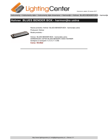 Utworzono: piątek, 03 marzec 2017 Instrumenty > Instrumenty dęte > Instrumenty dęte drewniane > Harmonijki > Hohner BLUES BENDER BOX - harmonijka Hohner BLUES BENDER BOX - harmonijka ustna Nazwa produktu: Hohner BLUES BENDER BOX - harmonijka ustna Producent: Hohner Model produktu: Hohner BLUES BENDER BOX - harmonijka ustna HARMONIJKA USTNA BLUES BENDER A BOX HOHNER Dostępna w tonacjach: A, D, E, F, G Bb Cena: 59.00zł http://www.lightingcenter.pl | [email protected] | | Strona 1/1