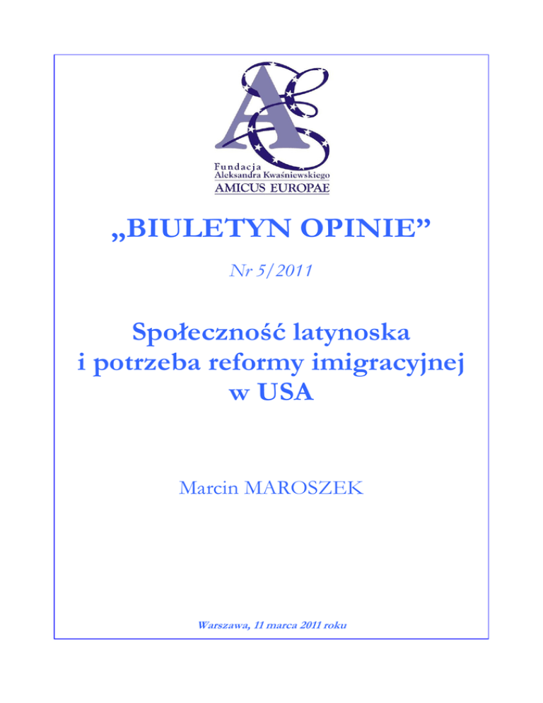 „BIULETYN OPINIE” Nr 5/2011 Społeczność latynoska i potrzeba reformy imigracyjnej w USA Marcin MAROSZEK Warszawa, 11 marca 2011 roku Latynosi stanowią obecnie 16% społeczeństwa amerykańskiego, co czyni z nich najliczniejszą mniejszość etniczną w Stanach Zjednoczonych, przy czym znaczną jej część stanowią nielegalni imigranci. Szacuje się, Ŝe do roku 2050 populacja latynoska w Stanach Zjednoczonych potroi swą liczebność1. Specjaliści od lat wskazują, Ŝe reforma imigracyjna jest nieunikniona. Mimo to kolejne rządy amerykańskie pozostają bierne, nie decydując się na wprowadzenie tej politycznie wraŜliwej decyzji. Zezwalają tym samym na narastanie problemu i wrogich imigrantom nastrojów wśród części społeczeństwa amerykańskiego. Narastający problem Z niemal 50 milionami przedstawicieli Latynosi przewyŜszają liczebnie nawet AfroAmerykanów (40 milionów, 13% populacji USA)2. Znaczny napływ latynoskich imigrantów do Stanów Zjednoczonych na przestrzeni ostatnich dekad i dynamiczny wzrost ich populacji sprawiły, Ŝe niezbędne są zmiany przepisów regulujących napływ obcokrajowców i ich status. Zwłaszcza, Ŝe znaczna ich część to nielegalni imigranci z krajów latynoamerykańskich, którzy uciekają ze swych ojczystych krajów do oferujących im znacznie więcej moŜliwości USA. Na przestrzeni XX w. kolejne fale imigrantów napływały z róŜnych państw latynoamerykańskich do Stanów Zjednoczonych, utoŜsamianych z dobrobytem. To właśnie bardzo słaba kondycja ekonomiczna ich rodzimych krajów z jednej strony, a z drugiej destabilizacja polityczna (często długotrwałe wojny) były i nadal są zasadniczym powodem corocznej emigracji tysięcy osób. Mieszkańcy Meksyku z róŜną intensywnością czynią to od dekad, co umoŜliwia im długa, słabo strzeŜona, wspólna granica. Portorykańczycy juŜ w 1917 r. uzyskali obywatelstwo amerykańskie, a na początku lat 50. sprecyzowano ich polityczne powiązanie z Waszyngtonem, które trwa do dziś w postaci państwa stowarzyszonego. Od końca drugiej wojny światowej, korzystając z moŜliwości prawnych, dogodnych warunków geograficznych i moŜliwości gospodarczych fale Portorykańczyków zalewały Stany Zjednoczone, zwłaszcza stany Nowy Jork, New Jersey, Massachusetts i Florydę. Najpierw po przewrocie z 1952 r., a w większej mierze po rewolucji kubańskiej z 1959 r. kolejne fale Kubańczyków zalewały Florydę, doprowadzając do sytuacji, w której od dekad stanowią tam znaczącą siłę polityczno-ekonomiczną. Długoletnie konflikty w krajach Ameryki Środkowej spowodowały napływ imigrantów z Salwadoru, Hondurasu, Gwatemali czy Nikaragui. Od lat 80. i 90. kraje te wraz z Meksykiem na trwałe zastąpiły Karaiby jako główne źródło uchodźców próbujących dotrzeć do Stanów Zjednoczonych i tam rozpocząć nowe Ŝycie. Amerykańska opinia publiczna umiarkowanie akceptowała imigrantów z południa, gdyŜ ci dostarczali taniej siły roboczej. Takie zawody jak pokojówka, opiekunka do dzieci czy pracownik 1 2 Latino in America, przez: http://www.cnn.com/SPECIALS/2009/latino.in.america/. U.S. Census Bureau, przez: http://quickfacts.census.gov/qfd/states/00000.html. 2 budowlany do dziś kojarzone są z Latynosami. Przez długi czas dostęp do bardziej prestiŜowych stanowisk był ograniczony. Władze na nielegalnych imigrantów przymykały oko, kontynuując dotychczasową politykę przyznawania zielonych kart i obywatelstwa amerykańskiego stosunkowo nielicznej grupie w drodze konkursów. Brak poprawy warunków społeczno-gospodarczych w krajach Ameryki Środkowej, powstanie NAFTAy oraz poraŜka przygody z neoliberalizmem w wielu państwach Ameryce Łacińskiej i spowodowane tym kryzysy ekonomiczne doprowadziły na przełomie wieków do intensyfikacji napływu imigrantów z regionu. Ich liczba wkrótce wzrosła tak bardzo, Ŝe temat ten stał się jednym z głównych przedmiotów debaty politycznej w kraju. Kolejni gospodarze Białego Domu, zarówno Bill Clinton, jak i George W. Bush nie zdecydowali się na rozwiązanie systemowe i reformę imigracyjną. W zamian skupili się na doraźnych środkach zmierzających do uszczelnienia granic i prób ograniczenia napływu imigrantów z południa. Bezskutecznie. Społeczność latynoamerykańska w USA Jak wspomniano wyŜej Latynosi stanowią najliczniejszą mniejszość etniczną w USA (16% całej populacji). Szacunki PEW Hispanic Center z 2009 r.3 mówią o całkowitej liczbie 48 348 000 przedstawicieli mniejszości latynoskiej w USA, czyli o ponad 13 milionów więcej niŜ w 2000 r. (wzrost o 37%). Znaczna większość z tej liczby, bo aŜ 30 279 000 osób, urodziło się juŜ na terytorium Stanów Zjednoczonych, a jedynie nieco ponad 18 000 000 przybyło tam ze swych rodzinnych krajów. Z tej grupy obywatelstwo amerykańskie posiada jedynie 5 262 000, co pozostawia 12 800 000 osób bez obywatelstwa4. Część z nich posiada czasowe prawo pobytu, azyl lub status uchodźcy, większość jednak, bo aŜ ok. 9 100 0005, przebywa na terenie USA nielegalnie. Według badań American Community Survey z 2008 r. niemal 2/3 wszystkich Latynosów rezydujących w USA określa się jako Meksykan6. Pozostałe z 10 największych mniejszości wywodzą się z Portoryko, Kuby, Salwadoru, Dominikany, Gwatemali, Kolumbii, Hondurasu, Ekwadoru i Peru. Przedstawiciele kaŜdej z narodowości róŜnią się między sobą pod wieloma względami, m.in. wykształcenia, wieku, znajomości języka angielskiego czy dochodami. PoniŜsza tabela prezentuje uśrednione wartości wybranych opisujących je atrybutów dla przedstawicieli kaŜdej z 10 narodowości7. 3 PEW Hispanic Center, Statistical Portrait of Hispanics in the United States, 2009, przez: http://pewhispanic.org/files/factsheets/hispanics2009/2009%20Hispanic%20Profile%20Final.pdf. 4 Ibidem. 5 PEW Hispanic Center, Unauthorized Immigrant Population: National and State Trends, 2010, przez: http://pewh