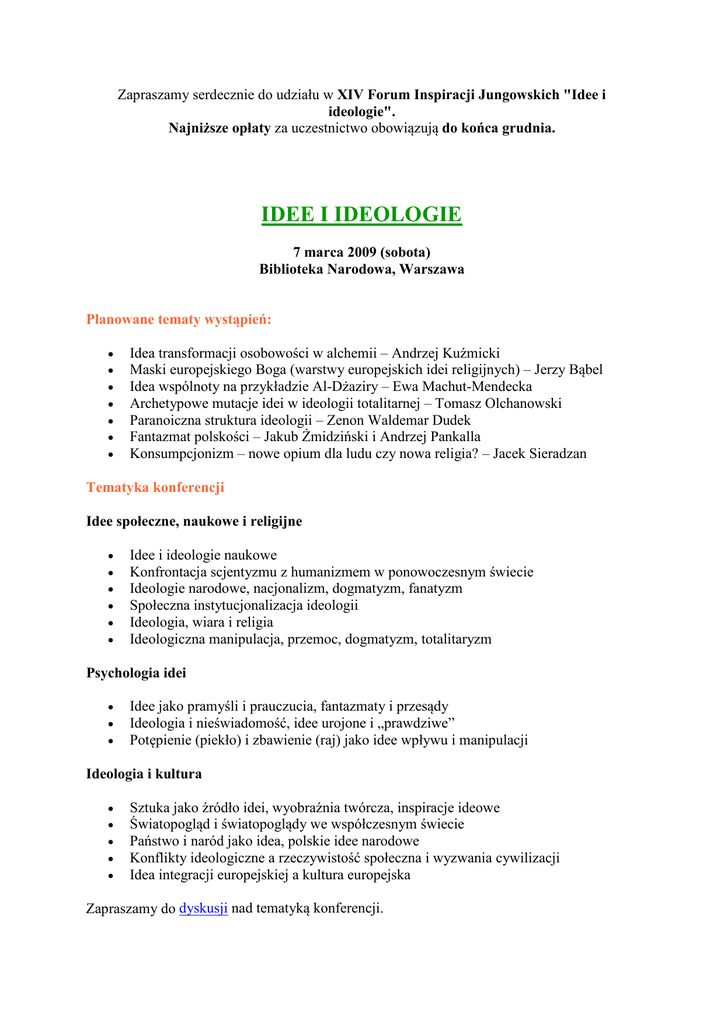Zapraszamy serdecznie do udziału w XIV Forum Inspiracji Jungowskich "Idee i ideologie". ajniższe opłaty za uczestnictwo obowiązują do końca grudnia. IDEE I IDEOLOGIE 7 marca 2009 (sobota) Biblioteka arodowa, Warszawa Planowane tematy wystąpień: • • • • • • • Idea transformacji osobowości w alchemii – Andrzej Kuźmicki Maski europejskiego Boga (warstwy europejskich idei religijnych) – Jerzy Bąbel Idea wspólnoty na przykładzie Al-Dżaziry – Ewa Machut-Mendecka Archetypowe mutacje idei w ideologii totalitarnej – Tomasz Olchanowski Paranoiczna struktura ideologii – Zenon Waldemar Dudek Fantazmat polskości – Jakub Żmidziński i Andrzej Pankalla Konsumpcjonizm – nowe opium dla ludu czy nowa religia? – Jacek Sieradzan Tematyka konferencji Idee społeczne, naukowe i religijne • • • • • • Idee i ideologie naukowe Konfrontacja scjentyzmu z humanizmem w ponowoczesnym świecie Ideologie narodowe, nacjonalizm, dogmatyzm, fanatyzm Społeczna instytucjonalizacja ideologii Ideologia, wiara i religia Ideologiczna manipulacja, przemoc, dogmatyzm, totalitaryzm Psychologia idei • • • Idee jako pramyśli i prauczucia, fantazmaty i przesądy Ideologia i nieświadomość, idee urojone i „prawdziwe” Potępienie (piekło) i zbawienie (raj) jako idee wpływu i manipulacji Ideologia i kultura • • • • • Sztuka jako źródło idei, wyobraźnia twórcza, inspiracje ideowe Światopogląd i światopoglądy we współczesnym świecie Państwo i naród jako idea, polskie idee narodowe Konflikty ideologiczne a rzeczywistość społeczna i wyzwania cywilizacji Idea integracji europejskiej a kultura europejska Zapraszamy do dyskusji nad tematyką konferencji. Warunki uczestnictwa • • Prenumeratorzy ALBO albo 2008, uczestnicy XIII Forum, młodzież, studenci, emeryci, renciści: 80 zł (wpłaty do 31.12.2008), 100 zł (01.01–30.01.2009), 120 zł (po 30.01.2009) Pozostałe osoby: 100 zł (wpłaty do 31.12.2008), 120 zł (01.01–30.01.2009), 140 zł (po 30.01.2009) W ramach opłaty uczestnicy otrzymują materiały konferencyjne. Zgłoszenie uczestnictwa W celu rejestracji na konferencję należy: • wypełnić zgłoszenie (online bądź tradycyjnie) • dokonać wpłaty odpowiedniej kwoty na numer konta: ENETEIA ul. 33 1240 Baborowska 1109 1111 0000 7/15, 0515 7868 01-464 (z dopiskiem Warszawa XIV Forum) Wypełniony formularz prosimy przesłać mailem, pocztą lub faxem na adres Redakcji. Istnieje możliwość zgłoszenia i wniesienia opłaty 7 marca, w dniu odbywania się konferencji. W wypadku rezygnacji z uczestnictwa organizatorzy zwracają: • • • do 30 stycznia – 100% wpłaty od 1 do 28 lutego – 50% wpłaty od 1 marca – 20% wpłaty Przydatne informacje • Miejsce spotkania – Biblioteka Narodowa, Al. Niepodległości 213 (wejście B, od Al. Niepodległości), sala nr 218, parter. • Rejestracja uczestników, wydawanie Kart uczestnictwa, talonów na obiad oraz materiałów konferencyjnych w sekretariacie. Prosimy o wcześniejsze przybycie. Sekretariat czynny jest od godziny 9.00. • Dojazd (z okolic Dworca Centralnego): www.ztm.waw.pl Rozkład jazdy: – przystanek tramwajowy: „Dworzec Centralny” w Al. Jana Pawła II (kierunek – Mokotów); linie: 10, 16, 17, 33, należy wysiąść na czwartym przystanku: „Biblioteka Narodowa”; – przystanek autobusowy: „Dworzec Centralny” w Al. Jana Pawła II (kierunek – Mokotów); linie autobusowe: 118 (z ul. Chałubińskiego), 130, 174; należy wysiąść na trzecim przystanku: „Biblioteka Narodowa”; – stacja metra: „Centrum” przy ul. Marszałkowskiej (kierunek – Kabaty); należy wysiąść na stacji „Pole Mokotowskie”; dojście 5 minut w stronę centrum Al. Niepodległości, budynek Biblioteki znajduje się po lewej stronie. • Podczas całego spotkania czynny jest bufet – możliwość zakupu kanapek, ciepłych i zimnych napojów, ciastek. Kontakt Redakcja ALBO. Problemy psychologii ul. Zwierzyniecka 8A/43, 00-719 tel. (22) 840-53-30, 840-84-60, fax e-mail: [email protected] i kultury Warszawa 840-84-61 Zapraszamy serdecznie do udziału w XIV Forum Inspiracji Jungowskich "Idee i ideologie". ajniższe opłaty za uczestnictwo obowiązują do końca grudnia. IDEE I IDEOLOGIE 7 marca 2009 (sobota) Biblioteka arodowa, Warszawa Planowane tematy wystąpień: • • • • • • • Idea transformacji osobowości w alchemii – Andrzej Kuźmicki Maski europejskiego Boga (warstwy europejskich idei religijnych) – Jerzy Bąbel Idea wspólnoty na przykładzie Al-Dżaziry – Ewa Machut-Mendecka Archetypowe mutacje idei w ideologii totalitarnej – Tomasz Olchanowski Paranoiczna struktura ideologii – Zenon Waldemar Dudek Fantazmat polskości – Jakub Żmidziński i Andrzej Pankalla Konsumpcjonizm – nowe opium dla ludu czy nowa religia? – Jacek Sieradzan Tematyka konferencji Idee społeczne, naukowe i religijne • • • • • • Idee i ideologie naukowe Konfrontacja scjentyzmu z humanizmem w ponowoczesnym świecie Ideologie narodowe, nacjonalizm, dogmatyzm, fanatyzm Społeczna instytucjonalizacja ideologii Ideologia, wiara i religia Ideologiczna manipulacja, przemoc, dogmatyzm, totalitaryzm Psychologia idei • • • Idee jako pramyśli i prauczucia, fantazmaty i przesądy Ideologia i nieświadomość, idee urojone i „prawdziwe” Potępienie (piekło) i zbawienie (raj) jako idee wpływu i manipulacji Ideologia i kultura • • • • • Sztuka jako źródło idei, wyobraźnia twórcza, inspiracje ideowe Światopogląd i światopoglądy we współczesnym świecie Państwo i naród jako idea, polskie idee narodowe Konflikty ideologiczne a rzeczywistość społeczna i wyzwania cywilizacji Idea integracji europejskiej a kultura europejska Zapraszamy do dyskusji nad tematyką konferencji. Warunki uczestnictwa • • Prenumeratorzy ALBO albo 2008, uczestnicy XIII Forum, młodzież, studenci, emeryci, renciści: 80 zł (wpłaty do 31.12.2008), 10