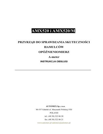 AMX520 i AMX520/M PRZYRZĄD DO SPRAWDZANIA SKUTECZNOŚCI HAMULCÓW OPÓŹNIENIOMIERZ A-meter INSTRUKCJA OBSŁUGI AUTOMEX Sp. z o.o. 80-557 Gdańsk ul. Marynarki Polskiej 55D POLAND tel.: (48 58) 522 06 20 fax: (48 58) 522 06 21 www.automex.pl [email protected] Zastrzega się prawo wprowadzania zmian technicznych. Treść instrukcji obsługi nie stanowi podstawy do jakichkolwiek roszczeń wobec firmy Automex Sp. z o.o. Niniejsze opracowanie ani jej fragmenty nie mogą być powielane w żadnej formie ani przekazywane za pomocą jakichkolwiek nośników elektronicznych lub mechanicznych, z kopiowaniem i zapisem magnetycznym włącznie, bez pisemnej zgody firmy Automex Sp. z o.o. © Copyright by Automex Sp. z o.o. Instrukcja obsługi, edycja 1.10 Maj 2013 AUTOMEX Sp. z o.o. ul. Marynarki Polskiej 55D 80-557 Gdańsk tel.: +48 58 5220620 fax: +48 58 5220621 www.automex.pl [email protected] Instrukcja obsługi przyrządu sprawdzania skuteczności hamulców Opóźnieniomierz typ AMX520 3 1. Wstęp Przed pierwszym uruchomieniem przyrządu należy dokładnie zapoznać się z treścią niniejszej instrukcji obsługi, ponieważ zawiera ona ważne wskazówki i uwagi, dotyczące prawidłowej eksploatacji przyrządu, oraz określa niebezpieczne sytuacje i podaje, w jaki sposób należy unikać wypadków i zapobiegać ewentualnym uszkodzeniom przyrządu! Rozwój sieci dróg (zwłaszcza szybkiego ruchu i autostrad), jak i zwiększająca się liczba samochodów wymusza profesjonalną kontrolę stanu technicznego pojazdów. Ma to zapewnić z jednej strony bezpieczeństwo, a z drugiej komfort jazdy i oszczędną eksploatację pojazdów. Wyroby firmy AUTOMEX wykorzystują systemy pomiarowe oparte o najnowszy stan techniki w tej dziedzinie. Współcześnie prawidłową kontrolę i pomiary mogą dokonywać jedynie przyrządy łączące w jedną całość najnowsze systemy komputerowe, z wyrafinowaną technologią pomiaru mierzonych wielkości. Cieszymy się, że zdecydowaliście się Państwo na zakup przyrządu do pomiaru skuteczności hamowania pojazdów samochodowych i ciągników rolniczych firmy AUTOMEX. Opóźnieniomierze AMX520 i AMX520/M A-meter firmy AUTOMEX zapewniają sprawdzenie skuteczności działania hamulców samochodów osobowych, ciężarowych, przyczep, autobusów i ciągników rolniczych o dopuszczalnej masie całkowitej do i powyżej 3,5 t., a w przypadku urządzenia w wersji AMX520/M także motocykli. Przyrządy do pomiaru skuteczności hamowania pojazdów samochodowych firmy AUTOMEX mogą być stosowane do sprawdzania stanu technicznego hamulców podczas okresowych przeglądów technicznych jak i po naprawie. AUTOMEX Sp. z o.o. Gdańsk tel. (+48) 58 522 06 20 fax (+48) 58 522 06 21 4 Instrukcja obsługi przyrządu sprawdzania skuteczności hamulców Opóźnieniomierz typ AMX520 2. Spis treści: 1.WSTĘP..................................................................................................................................................................3 2.SPIS TREŚCI:......................................................................................................................................................4 3.BEZPIECZEŃSTWO PRACY / NIEDOZWOLONE SPOSOBY EKSPLOATACJI...................................6 4.OGÓLNE ZASADY EKSPLOATACJI I BEZPIECZNEJ OBSŁUGI PRZYRZĄDU.................................7 4.1.INFORMACJE O AKUMULATORACH.....................................................................................................................7 4.2.ŁADOWANIE PRZYRZĄDU..................................................................................................................................7 4.3.EKSPLOATACJA I KONSERWACJA PRZYRZĄDU......................................................................................................7 4.4.NAPRAWY PRZYRZĄDU.....................................................................................................................................8 5.PRZEZNACZENIE I ZAKRES STOSOWANIA. ...........................................................................................8 6.DANE TECHNICZNE.........................................................................................................................................9 7.WYPOSAŻENIE PRZYRZĄDU......................................................................................................................10 8.OPIS PRZYRZĄDU..........................................................................................................................................10 9.OBSŁUGA PRZYRZĄDU................................................................................................................................14 10.KONTROLA SKUTECZNOŚCI HAMOWNIA PRZY POMOCY TESTERA.........................................15 10.1.PRZYGOTOWANIE TESTERA DO PRACY............................................................................................................15 10.2.POSŁUGIWANIE SIĘ PRZYRZĄDEM. ................................................................................................................17 10.3.ZEGAR.........................................................................................................................................................18 10.4.PRZEPROWADZENIE BADANIA HAMULCÓW.....................................................................................................18 10.4.1.Tryby rejestracji...................................................................................................................................19 10.4.1.1.Tryb rejestracji automatycznej....................................................................................................................19 10.4.1.2. Tryb rejestracji ręcznej...............................................................................................................................24 10.4.1.3.Tryb rejestracji ciągłej...................................................