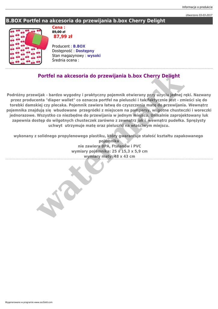 Informacje o produkcie Utworzono 03-03-2017 B.BOX Portfel na akcesoria do przewijania b.box Cherry Delight Cena : 89,00 zł 87,99 zł Producent : B.BOX Dostępność : Dostępny Stan magazynowy : wysoki Średnia ocena : er m ar k Portfel na akcesoria do przewijania b.box Cherry Delight Podróżny przewijak - bardzo wygodny i praktyczny pojemnik otwierany przy użyciu jednej ręki. Nazwany przez producenta "diaper wallet" co oznacza portfel na pieluszki i tak faktycznie jest - zmieści się do torebki damskiej czy plecaka. Pojemnik zawiera łatwą do czyszczenia matę do przewijania. Wewnątrz pojemnika znajdują się wbudowane przegródki z miejscem na pampersy, wilgotne chusteczki i woreczki jednorazowe. Wszystko co niezbędne do przewijania w jednym miejscu. Unikalnie zaprojektowany luk zapewnia dostęp do wilgotnych chusteczek zarówno z zewnątrz jak i wewnątrz pudełka. Sprężysty uchwyt utrzymuje matę oraz pieluszki na właściwym miejscu. w at wykonany z solidnego propylenowego plastiku, który gwarantuje stałość kształtu zapakowanego pojemnika nie zawiera BPA, Ftalanów i PVC wymiary pojemnika: 25 x 15,3 x 5,9 cm wymiary maty: 48 x 43 cm Wygenerowano w programie www.oscGold.com
