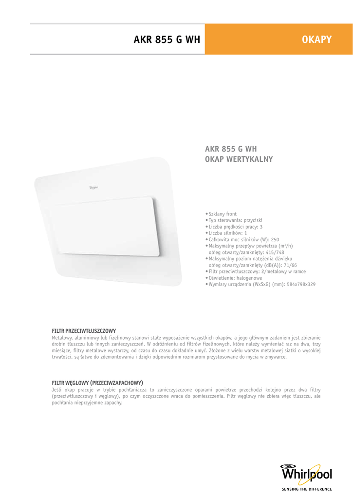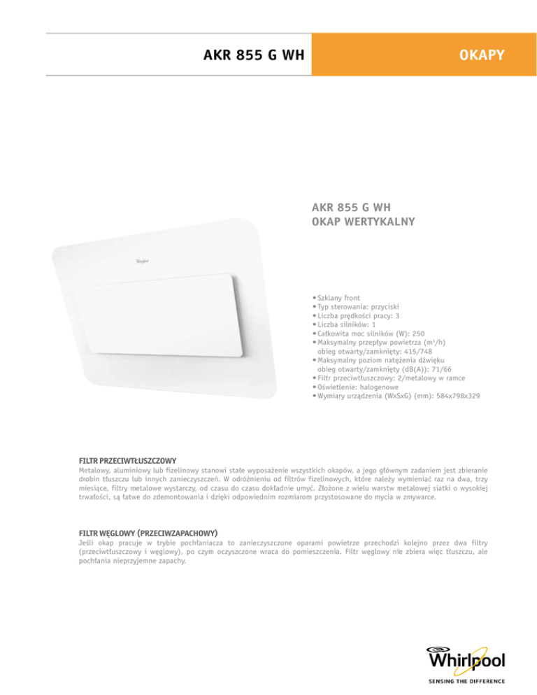 AKR 855 G WH OKAPY AKR 855 G WH OKAP WERTYKALNY •Szklany front •Typ sterowania: przyciski •Liczba prędkości pracy: 3 •Liczba silników: 1 •Całkowita moc silników (W): 250 •Maksymalny przepływ powietrza (m3/h) obieg otwarty/zamknięty: 415/748 •Maksymalny poziom natężenia dźwięku obieg otwarty/zamknięty (dB(A)): 71/66 •Filtr przeciwtłuszczowy: 2/metalowy w ramce •Oświetlenie: halogenowe •Wymiary urządzenia (WxSxG) (mm): 584x798x329 Filtr przeciwtłuszczowy Metalowy, aluminiowy lub fizelinowy stanowi stałe wyposażenie wszystkich okapów, a jego głównym zadaniem jest zbieranie drobin tłuszczu lub innych zanieczyszczeń. W odróżnieniu od filtrów fizelinowych, które należy wymieniać raz na dwa, trzy miesiące, filtry metalowe wystarczy, od czasu do czasu dokładnie umyć. Złożone z wielu warstw metalowej siatki o wysokiej trwałości, są łatwe do zdemontowania i dzięki odpowiednim rozmiarom przystosowane do mycia w zmywarce. Filtr WĘGLOWY (przeciwzapachowy) Jeśli okap pracuje w trybie pochłaniacza to zanieczyszczone oparami powietrze przechodzi kolejno przez dwa filtry (przeciwtłuszczowy i węglowy), po czym oczyszczone wraca do pomieszczenia. Filtr węglowy nie zbiera więc tłuszczu, ale pochłania nieprzyjemne zapachy. OKAPY AKR 855 G WH OZNACZENIE MODELU 12nc EAN Typ okapu Technologia 6-ty Zmysł Kolor Materiał obudowy Powłoka zewnętrzna AKR 855 G WH 857846001010 8003437213694 wertykalny biały szkło - DANE TECHNICZNE Liczba prędkości pracy Liczba silników Moc silników (W) Całkowita moc silników (W) Przepływ powietrza (m3/h) – obieg otwarty Maksymalny przepływ powietrza (m3/h) – obieg otwarty Poziom natężenia dźwięku dla kolejnych prędkości pracy (dB(A)) – obieg otwarty Przepływ powietrza (m3/h) – obieg zamknięty Maksymalny przepływ powietrza (m3/h) – obieg zamknięty Poziom natężenia dźwięku dla kolejnych prędkości pracy (dB(A)) – obieg zamknięty Ø150 3 1 250 250 221-309-415 415 56-64-71 286-433-748 748 45-54-66 STEROWANIE Typ sterowania przyciski 270 548 FILTRY 670 798 133 Liczba filtrów przeciwtłuszczowych Rodzaj filtra przeciwtłuszczowego Liczba filtrów węglowych (przeciwzapachowych) 2 w ramce 1 CECHY Oświetlenie Liczba użytych żarówek/halogenów (W) Moc żarówki/halogenu (W) Całkowita moc żarówek/halogenów (W) Średnica wylotu (mm) halogenowe 2 20 40 150 WYMIARY Wymiary urządzenia (WxSxG) (mm) Minimalna wysokość zawieszenia nad płytą elektryczną (mm) Minimalna wysokość zawieszenia nad płytą gazową (mm) Masa netto (kg) 548x798x329 500 650 19