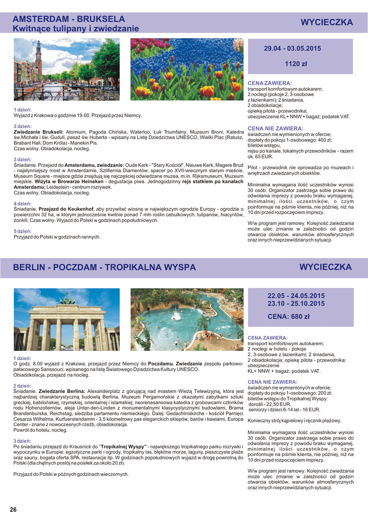 AMSTERDAM - BRUKSELA Kwitn¹ce tulipany i zwiedzanie WYCIECZKA 29.04 - 03.05.2015 1120 z³ CENA ZAWIERA: 1 dzieñ: Wyjazd z Krakowa o godzinie 19.00. Przejazd przez Niemcy. 2 dzieñ: Zwiedzanie Brukseli: Atomium, Pagoda Chiñska, Waterloo, £uk Triumfalny, Muzeum Broni, Katedra œw.Micha³a i œw. Guduli, pasa¿ œw. Huberta - wpisany na Listê Dziedzictwa UNESCO, Wielki Plac (Ratusz, Brabant Hall, Dom Króla) - Manekin Pis. Czas wolny. Obiadokolacja, nocleg. 3 dzieñ: Œniadanie. Przejazd do Amsterdamu, zwiedzanie: Oude Kerk - "Stary Koœció³", Nieuwe Kerk, Magere Brud - najs³ynniejszy most w Amsterdamie, Szlifiernia Diamentów; spacer po XVII-wiecznym starym mieœcie, Museum Square - miejsce gdzie znajduj¹ siê najczêœciej odwiedzane muzea, m.in. Rijksmuseum, Muzeum miejskie. Wizyta w Browarze Heineken - degustacja piwa. Jednogodzinny rejs statkiem po kana³ach Amsterdamu; Leideplein - centrum rozrywek. Czas wolny. Obiadokolacja, nocleg. transport komfortowym autokarem; 2 noclegi (pokoje 2, 3-osobowe z ³azienkami); 2 œniadania, 2 obiadokolacje; opiekê pilota - przewodnika; ubezpieczenie KL+ NNW + baga¿; podatek VAT. CENA NIE ZAWIERA: œwiadczeñ nie wymienionych w ofercie; dop³aty do pokoju 1-osobowego: 400 z³; biletów wstêpu, rejsu po kanale, lokalnych przewodników - razem ok. 65 EUR. Pilot - przewodnik nie oprowadza po muzeach i wnêtrzach zwiedzanych obiektów. Minimalna wymagana iloœæ uczestników wynosi 30 osób. Organizator zastrzega sobie prawo do odwo³ania imprezy z powodu braku wymaganej, minimalnej iloœci uczestników, o czym 4 dzieñ: Œniadanie. Przejazd do Keukenhof, aby przywitaæ wiosnê w najwiêkszym ogrodzie Europy - ogrodzie o poinformuje na piœmie klienta, nie póŸniej, ni¿ na powierzchni 32 ha, w którym jednoczeœnie kwitnie ponad 7 mln roœlin cebulkowych: tulipanów, hiacyntów, 10 dni przed rozpoczêciem imprezy. ¿onkili. Czas wolny. Wyjazd do Polski w godzinach popo³udniowych. W/w program jest ramowy. Kolejnoœæ zwiedzania mo¿e ulec zmianie w zale¿noœci od godzin 5 dzieñ: otwarcia obiektów, warunków atmosferycznych Przyjazd do Polski w godzinach rannych. oraz innych nieprzewidzianych sytuacji. BERLIN - POCZDAM - TROPIKALNA WYSPA WYCIECZKA 22.05 - 24.05.2015 23.10 - 25.10.2015 CENA: 680 z³ CENA ZAWIERA: transport komfortowym autokarem; 2 noclegi w hotelu - pokoje 2, 3-osobowe z ³azienkami; 2 œniadania, 1 dzieñ: 2 obiadokolacje; opiekê pilota - przewodnika; O godz. 8.00 wyjazd z Krakowa, przejazd przez Niemcy do Poczdamu. Zwiedzanie zespo³u parkowo- ubezpieczenie pa³acowego Sanssouci, wpisanego na listê Œwiatowego Dziedzictwa Kultury UNESCO. KL+ NNW + baga¿; podatek VAT. Obiadokolacja, przejazd na nocleg. CENA NIE ZAWIERA: 2 dzieñ: œwiadczeñ nie wymienionych w ofercie; Œniadanie. Zwiedzanie Berlina: Alexanderplatz z góruj¹c¹ nad miastem Wie¿¹ Telewizyjn¹, która jest dop³aty do pokoju 1-osobowego: 200 z³; najbardziej charakterystyczn¹ budowl¹ Berlina, Muzeum Pergamoñskie z okaza³ymi zabytkami sztuki biletów wstêpu do Tropikalnej Wyspy: greckiej, babiloñskiej, rzymskiej, orientalnej i islamskiej; neorenesansowa katedra z grobowcami cz³onków doroœli - 22,50 EUR, rodu Hohenzollernów, aleja Unter-den-Linden z monumentalnymi klasycystycznymi budowlami, Brama seniorzy i dzieci 6-14 lat - 16 EUR. Brandenburska, Reichstag, siedziba parlamentu niemieckiego. Dalej: Gedachtniskirche - koœció³ Pamiêci Cesarza Wilhelma, Kurfuerstendamm - 3,5 kilometrowy pas eleganckich sklepów, barów i kawiarni, Europa Konieczny strój k¹pielowy i rêcznik pla¿owy. Center - znane z nowoczesnych rzeŸb, obiadokolacja. Powrót do hotelu, nocleg. Minimalna wymagana iloœæ uczestników wynosi 3 dzieñ: Po œniadaniu przejazd do Krausnick do “Tropikalnej Wyspy” - najwiêkszego tropikalnego parku rozrywki i wypoczynku w Europie: egzotyczne parki i ogrody, tropikalny las, b³êkitne morze, laguny, piaszczyste pla¿e oraz sauny, bogata oferta SPA, restauracje itp. W godzinach popo³udniowych wyjazd w drogê powrotn¹ do Polski (dla chêtnych postój na posi³ek za oko³o 20 z³). Przyjazd do Polski w póŸnych godzinach wieczornych. 26 30 osób. Organizator zastrzega sobie prawo do odwo³ania imprezy z powodu braku wymaganej, minimalnej iloœci uczestników, o czym poinformuje na piœmie klienta, nie póŸniej, ni¿ na 10 dni przed rozpoczêciem imprezy. W/w program jest ramowy. Kolejnoœæ zwiedzania mo¿e ulec zmianie w zale¿noœci od godzin otwarcia obiektów, warunków atmosferycznych oraz innych nieprzewidzianych sytuacji.