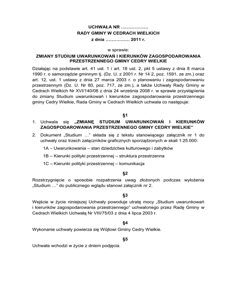 UCHWAŁA NR ……………… RADY GMINY W CEDRACH WIELKICH z dnia ……………. 2011 r. w sprawie: ZMIANY STUDIUM UWARUNKOWAŃ I KIERUNKÓW ZAGOSPODAROWANIA PRZESTRZENNEGO GMINY CEDRY WIELKIE Działając na podstawie art. 41 ust. 1 i art. 18 ust. 2, pkt 5 ustawy z dnia 8 marca 1990 r. o samorządzie gminnym tj. (Dz. U. z 2001 r. Nr 14 2, poz. 1591, ze zm.) oraz art. 12, ust. 1 ustawy z dnia 27 marca 2003 r. o planowaniu i zagospodarowaniu przestrzennym (Dz. U. Nr 80, poz. 717, ze zm.), a także Uchwały Rady Gminy w Cedrach Wielkich Nr XVI/140/08 z dnia 24 września 2008 r. w sprawie przystąpienia do zmiany Studium uwarunkowań i kierunków zagospodarowania przestrzennego gminy Cedry Wielkie, Rada Gminy w Cedrach Wielkich uchwala co następuje: §1 1. Uchwala się „ZMIANĘ STUDIUM UWARUNKOWAŃ I KIERUNKÓW ZAGOSPODAROWANIA PRZESTRZENNEGO GMINY CEDRY WIELKIE” 2. Dokument „Studium …” składa się z tekstu stanowiącego załącznik nr 1 do uchwały oraz trzech załączników graficznych sporządzonych w skali 1:25.000: 1A – Uwarunkowania – stan dziedzictwa kulturowego i zabytków 1B – Kierunki polityki przestrzennej – struktura przestrzenna 1C – Kierunki polityki przestrzennej – komunikacja §2 Rozstrzygnięcie o sposobie rozpatrzenia uwag złożonych podczas wyłożenia „Studium …” do publicznego wglądu stanowi załącznik nr 2. §3 Wejście w życie niniejszej Uchwały powoduje utratę mocy „Studium uwarunkowań i kierunków zagospodarowania przestrzennego” uchwalonego przez Radę Gminy w Cedrach Wielkich Uchwałą Nr VIII/75/03 z dnia 4 lipca 2003 r. §4 Wykonanie uchwały powierza się Wójtowi Gminy Cedry Wielkie. §5 Uchwała wchodzi w życie z dniem podjęcia. Załącznik nr 1 do Uchwały nr ……………………. Rady Gminy w Cedrach Wielkich z dnia ………………….. 2011 r. PROJEKT ZMIANY STUDIUM UWARUNKOWAŃ I KIERUNKÓW ZAGOSPODAROWANIA PRZESTRZENNEGO GMINY CEDRY WIELKIE Tekst Integralną częścią niniejszego tekstu są załączniki graficzne sporządzone w skali 1:25.000: 1A – Uwarunkowania – stan dziedzictwa kulturowego i zabytków 1B – Kierunki polityki przestrzennej – struktura przestrzenna 1C – Kierunki polityki przestrzennej – komunikacja Gdańsk ………………. 2011 Projekt zmiany Studium uwarunkowań i kierunków zagospodarowania przestrzennego gminy Cedry Wielkie został sporządzony zgodnie z ustawą z dnia 27 marca 2003 r. o planowaniu i zagospodarowaniu przestrzennym (Dz. U. z 2003 r. Nr 80, poz. 717 z późniejszymi zmianami) oraz rozporządzeniem Ministra Infrastruktury z dnia 28 kwietnia 2004 r. w sprawie zakresu projektu Studium uwarunkowań, kierunków zagospodarowania przestrzennego gminy (Dz. U. z 2004 r. Nr 118, poz. 1233. Sporządzający: – Urząd Gminy Cedry Wielkie – Wójt Gminy Cedry Wielkie mgr Janusz Goliński – Zespół autorski: Instytut Projektowania Urbanistycznego Barbara Bańkowska ul. Pawła Gdańca 4b/56, 80-305 Gdańsk tel./fax. (058) 552 06 84, kom. 0 601 64 01 94 Imię i nazwisko Zakres merytoryczny dr inż. arch. Barbara Bańkowska Generalny Projektant upr. Ministra GPiB nr 356/88, Członek Północnej Okręgowej Izby Urbanistów G-003/2002 mgr inż. arch. Radosław Kraszewski Projektant Współpraca w zakresie mgr inż. arch. Jan Kołodziej Syntezy przestrzenne mgr Bartosz Pępek Środowisko przyrodnicze mgr inż. Ryszard Musiał Infrastruktura techniczna II Spis treści WSTĘP ................................................................................................................ VI WPROWADZENIE ................................................................................................ VII 1. Podstawy formalne ........................................................................................ VII 2. Podstawy merytoryczne ................................................................................ VIII 3. Sytuacja planistyczna .................................................................................... X 4. Wnioski do Studium ....................................................................................... XII 5. Cele zmiany Studium .................................................................................... XIV ROZDZIAŁ I – UWARUNKOWANIA .................................................................... 1. Uwarunkowania wynikające z dotychczasowego przeznaczenia i zagospodarowania terenu ................................................... 1.1. Uwarunkowania zewnętrzne ................................................................. 1.2. Uwarunkowania wewnętrzne ................................................................ 1 2. Stan ładu przestrzennego i wymogów jego ochrony ..................................... 2.1. Uwarunkowania zewnętrzne ................................................................. 2.2. Uwarunkowania wewnętrzne ................................................................. 6 6 7 3. Uwarunkowania wynikające z wymogów ochrony środowiska, przyrody i krajobrazu kulturowego ................................................................ 3.1. Uwarunkowania zewnętrzne ................................................................ 8 8 3.2. Uwarunkowania wewnętrzne ............................................................... 3.2.1. Struktura środowiska przyrodniczego obszaru gminy ............. 3.2.2. Podstawowe zagrożenia środowiskowe .................................. 3.2.3. Obszary objęte ochroną przyrody ............................................ 11 11 13 15 4. Uwarunkowania wynikające ze stanu dziedzictwa kulturowego i zabytków oraz kultury współczesnej .......................................................... 4.1. Uwarunkowania zewnętrzne ................................................................ 4.2. Uwarunkowania wewnętrzne ............................................................... 17 17 18 5. Uwarunkowania wynikające z jakości życia mieszkańców
