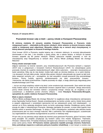 INFORMACJA PRASOWA Poznań, 27 sierpnia 2013 r. Poznański browar cały w bieli – panny młode w Kompanii Piwowarskiej W minioną niedzielę 25 sierpnia siedziba Kompanii Piwowarskiej w Poznaniu miała nietypowych gości – odwiedziło ją 80 panien młodych, które właśnie na terenie browaru wzięły udział w nietypowej sesji zdjęciowej. Wszystko odbyło się w ramach akcji charytatywnej, w której zbierano pieniądze na leczenie 6-letniego Huberta. Choć browar LECH w Poznaniu zwykle kojarzy się z kolorem zielonym, to wczoraj zdecydowanie dominowała w nim biel. I nie chodziło o piwną pianę, ale o suknie ślubne, w których na terenie browaru pojawiło się 80 panien młodych. Świeżo upieczone mężatki pozowały w nich do charytatywnej sesji fotograficznej w ramach akcji „Panny Młode podbijają Miasto dla chorego Malucha". Panny młode wewnątrz kadzi Zdjęcia wykonano na terenie warzelni, przy charakterystycznych dla Poznania tankach z napisem LECH oraz w połączonym z browarem Centrum Wycieczkowym LECH. Co odważniejsze panie pozowały również do zupełnie niestandardowych zdjęć, które wykonano… wewnątrz nieużywanej już kadzi warzelnej. Żeby się do niej dostać, trzeba było zejść po stromej drabince, co w sukni ślubnej i na obcasach nie było takie proste. Jednak kilka panien młodych zdecydowało się nawet na taki krok, żeby wesprzeć szczytny cel – szczególnie, że nad wszystkim czuwał pracownik bhp poznańskiego browaru. Panny budziły ogromne zainteresowanie nie tylko pracowników browaru i kierowców, ale także przechodniów. Chętnie pozowały do zdjęć, a sesję zakończyły degustacją piwa bezalkoholowego Lech Free. – Już po raz drugi wzięliśmy udział w tej akcji i znów wrażenia były niesamowite. Sam widok tak dużej liczby kobiet całych w bieli na tle zabudowań browaru zapierał dech w piersiach. Swoją obecnością panny młode wniosły też mnóstwo radości i pozytywnej energii. Cieszę się, że mogliśmy w tym uczestniczyć, a dodatkowo pomóc choremu chłopcu – mówi Klaudyna Polanowska-Skrzypek, specjalista ds. public relations Kompanii Piwowarskiej. Biało w pięciu miastach „Panny Młode podbijają Miasto dla chorego Malucha" to wyjątkowa akcja charytatywna zainicjowana przez Agnieszkę Kuźmę-Zywert. Zasady przedsięwzięcia są bardzo proste: panny młode biorą udział w sesjach zdjęciowych z produktami sponsorów lub we wskazanych przez nich lokalizacjach – w zamian za to firmy wpłacają określone kwoty na konto wybranego dziecka. Dodatkowo panny młode pozują do zdjęć z mieszkańcami Poznania, zbierając pieniądze do puszek, a przez kilka tygodni trwa zbiórka online w serwisie SiePomaga. To akcja w 100% charytatywna, ponieważ cała zebrana kwota przeznaczana jest na rzecz chorego malucha. Nikt z partnerów, firm współpracujących, uczestniczek czy organizatorów nie pobiera wynagrodzenia za pomoc w realizacji sesji. W tym roku po raz pierwszy akcja odbyła się również poza granicami Poznania, gdzie 5 lat temu miała swój początek. Do projektu przyłączyły się bowiem cztery inne miasta: Bydgoszcz, Trójmiasto, Wrocław i Zielona Góra. W każdej lokalizacji pieniądze były zbierane na innego malucha, wybieranego przez same panny młode. W Poznaniu świeżo upieczone mężatki pomogły choremu Hubertowi, który potrzebuje wsparcia w zakresie pokrycia kosztów rehabilitacji, w tym terapii w wodzie oraz swojego pierwszego w życiu turnusu rehabilitacyjnego dla dzieci autystycznych, niemówiących, ze schorzeniem kardiologicznym. Pieniądze pokryją również przygotowanie terapii indywidualnej Huberta. Kompania Piwowarska została sponsorem akcji „Panny Młode podbijają Miasto dla chorego Malucha" po raz drugi. Już w zeszłym roku poznański browar przez jeden dzień został całkowicie opanowany przez kolor biały. Wtedy w sesji fotograficznej uczestniczyło ponad 100 panien młodych. Więcej informacji o akcji na stronie www.panny-mlode.pl https://www.facebook.com/PannyMlodeAkcjaCharytatywna oraz na Facebooku: Do redaktora: Kompania Piwowarska – Lider branży piwowarskiej w Polsce Kompania Piwowarska jest największym przedsiębiorstwem piwowarskim w Polsce. Kilkusetletnie doświadczenia w warzeniu piwa, nowoczesne technologie i rygorystyczne przestrzeganie zasad produkcji na światowym poziomie gwarantują najwyższą jakość naszych produktów. Do portfela marek KP należą najpopularniejsze polskie piwa – m.in. Tyskie, Żubr, Lech, Dębowe Mocne, Redd's, a także międzynarodowe marki premium: Pilsner Urquell, Grolsch oraz Peroni Nastro Azzurro. Kompania Piwowarska (utworzona w 1999 roku) posiada trzy browary (w Tychach, Poznaniu i Białymstoku) oraz oddziały handlowe na terenie całego kraju. Kompania Piwowarska prowadzi także działalność społeczną oraz programy edukacyjne popularyzujące odpowiedzialność i umiar w konsumowaniu alkoholu. Wielkość sprzedaży osiągniętej przez KP w roku finansowym zakończonym 31 marca 2013 r. wyniosła 14,5 mln hektolitrów piwa. SABMiller – jeden z największych na świecie producentów piwa Kompania Piwowarska jest częścią jednego z największych na świecie producentów piwa – SABMiller plc. Grupa produkuje lub dystrybuuje piwo na sześciu kontynentach, a jej ogólnoświatowy portfel obejmuje międzynarodowe piwa premium, takie jak Grolsch, Miller Genuine Draft, Peroni Nastro Azzurro czy Pilsner Urquell oraz czołowe marki lokalne, takie jak Aquila, Castle, Miller Lite, Snow czy Tyskie. SABMiller jest jedną z największych na świecie (poza USA) firm rozlewających produkty CocaColi. W roku finansowym zakończonym 31 marca 2013 SABMiller osiągnął przychody w wysokości 34,5 mld USD oraz wypracował zysk brutto (EBITA) w wysokości 6,4 mld USD. SABMiller plc jest notowany na giełdach papierów wartościowych w Londynie i Johannesburgu. Dodatkowych informacji udzielają: Wojciech Mrugalski kierownik ds. komunika
