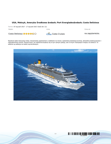 USA, Meksyk, Ameryka Środkowa – Port Everglades– Costa Deliziosa Termin: 07 styczeń 2017 - 17 styczeń 2017 (ilość dni: 11) Statek: Costa Deliziosa Linia: Cena od: Costa Cruises na zapytanie/os. Wyobraź sobie luksusowy hotel, niesamowity apartament z widokiem na morze, wykwintną światową kuchnię, atmosferę ekskluzywności i najznakomitszy serwis. Pomyśl teraz, że codziennie budzisz się w tym samym pokoju, ale w innym niezwykłym miejscu na świecie. To właśnie są wakacje na statku wycieczkowym. 1/3 EV:42045 TRASA REJSU dzień 1 dzień 2 Data Port Wpłynięcie Wypłynięcie sobota 07.01.2017 Port Everglades --:-- 23:00 Stany Zjednoczone niedziela 08.01.2017 12:00 18:00 Bahamy Dzień na morzu --:-- --:-- Amber Cove 08:00 15:00 12:00 18:00 09:00 20:00 dzień 3 poniedziałek 09.01.2017 dzień 4 wtorek 10.01.2017 Nassau Republika Dominikańska środa 11.01.2017 Ocho Rios czwartek 12.01.2017 Wielki Kajman dzień 7 piątek 13.01.2017 Dzień na morzu --:-- --:-- dzień 8 sobota 14.01.2017 Roatan 08:00 17:00 08:00 19:00 dzień 5 dzień 6 Jamajka Kajmany Honduras niedziela 15.01.2017 Cozumel dzień 10 poniedziałek 16.01.2017 Dzień na morzu --:-- --:-- dzień 11 wtorek 17.01.2017 Port Everglades 06:00 --:-- dzień 9 Legenda Meksyk Stany Zjednoczone CENNIK Cena katalogowa Suite with Ocean View Balcony Cena promocyjna €1 659.00 2/3 EV:42045 Premium Panorama Suite with Ocean View Balcony Classic €979.00 €1 909.00 €679.00 Samsara with Ocean View Balcony €1 559.00 Mini Suite with Ocean View Balcony €1 409.00 Classic €1 079.00 Premium €759.00 Samsara Suite with Ocean View Balcony €1 959.00 Samsara inside €1 059.00 Grand Suite with Ocean View Balcony €2 159.00 Balcony Premium €1 259.00 Opłaty portowe €150.00 Uwaga! Ceny za osobę w kabinie dwuosobowej. Cena zawiera: zakwaterowanie w kabinie wybranej kategorii; wyżywienie - 3 główne posiłki, przekąski między posiłkami; napoje serwowane do śniadania i w bufetach samoobsługowych; serwis bagażowy podczas wejścia i zejścia ze statku; serwis kabinowy; korzystanie ze wszystkich urządzeń sportowo - rekreacyjnych znajdujących się na pokładzie statku (basen, jacuzzi, sala fitness, itp.); udział we wszystkich imprezach organizowanych na statku (przedstawienia w teatrze, koncerty, programy animacyjne itp.). Cena nie zawiera: kosztów dojazdu do portu; opłat portowych; ewentualnych noclegów w hotelu przed/po rejsie i transferów; wycieczek fakultatywnych w trakcie rejsu; korzystania z barów, mini baru w kabinie oraz napojów zamawianych w restauracji; korzystania z punktów usługowych (fryzjer, pralnia, fotograf, salon piękności i odnowy biologicznej, internet) i wydatków osobistych; napiwków dla obsługi na statku (kwota uzależniona od długości rejsu); ubezpieczenia KL, NNW i bagaż, kosztów wiz (tam gdzie wymagane). Uwagi: Od 01.12.2015 na wszystkich rejsach Costa Cruises (z min. 5 noclegów) można zarezerwować następujące pakiety all inclusive: dla dzieci 4-17 lat Giovani od 15.99€/os./dzień, dla dorosłych: Brindiamo od 24.99€/os./dzień, Piu Gusto od 27.99€/os./dzień, Intenditore od 45.99€/os./dzień (pakiet musi być wykupiony przez każdą osobę zakwaterowaną w kabinie - można zakupić w biurze przed rejsem). Na Państwa życzenie zarezerwujemy przelot, transfery do/z portu, parking, dodatkowe noclegi oraz zadbamy o odpowiednie ubezpieczenie podróżne. 3/3 EV:42045