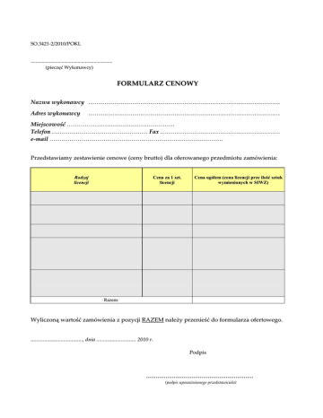SO.3421-2/2010/POKL .................................................................. (pieczęć Wykonawcy) FORMULARZ CENOWY Nazwa wykonawcy …………………………………………………………………………………… Adres wykonawcy …………………………………………………………………………………… Miejscowość ……………………………………………… Telefon ………………………………………… Fax …………………………………………………… e-mail …………………………………………………………………………… Przedstawiamy zestawienie cenowe (ceny brutto) dla oferowanego przedmiotu zamówienia: Rodzaj licencji Cena za 1 szt. licencji Cena ogółem (cena licencji prze ilość sztuk wymienionych w SIWZ) Razem: Wyliczoną wartość zamówienia z pozycji RAZEM należy przenieść do formularza ofertowego. ......................................, dnia ............................. 2010 r. Podpis .................................................................. (podpis upoważnionego przedstawiciela) SO.3421-2/2010/POKL .................................................................. (pieczęć Wykonawcy) OFERTA Nazwa wykonawcy …………………………………………………………………………………… Adres wykonawcy …………………………………………………………………………………… Miejscowość ……………………………………………… Telefon ………………………………………… Fax …………………………………………………… e-mail …………………………………………………………………………… Na podstawie ogłoszenia o przetargu nieograniczonym „Zakup licencji do nauki języka angielskiego metodą Accelerated Learning (przyspieszone uczenie się) w ramach projektu „Profesjonalny urzędnik – wysoka jakość usług publicznych w powiecie kętrzyńskim”, projekt współfinansowany przez Unię Europejską ze środków Europejskiego Funduszu Społecznego w ramach Działania 5.2. Wzmocnienie potencjału administracji samorządowej, Programu Operacyjnego Kapitał Ludzki” 1. Oferujemy dostawę za cenę netto : .................................................................................. PLN, słownie złotych: ................................................................................................................................................. , Do ceny netto zostanie doliczony podatek VAT ........................................................................................ PLN, słownie złotych: ................................................................................................................................................. , Cena dostawy brutto wyniesie: ..................................................................................................................... PLN, słownie złotych: ............................................................................................................................................... . zgodnie z warunkami przedstawionymi w SIWZ. 2. Oświadczamy, że zapoznaliśmy się ze „Specyfikacją Istotnych Warunków Zamówienia” i nie wnosimy do niej zastrzeżeń. 3. Oświadczamy, że uważamy się za związanych niniejszą ofertą przez okres 30 dni od daty upływu terminu składania ofert. 4. Usługę objętą zamówieniem zamierzamy wykonać sami*. 5. Części zlecone podwykonawcom – Informacje o podwykonawcach*. 2 ……………………………………………………………………………………………………………………… ……………………………………………………………………………………………………………………… ……………………………………………………………………………………………………………………… ……………………………………………………………………………………………………………………… …………………………………………………………………………………………………………………… 6. Zobowiązujemy się, w przypadku przyznania nam zamówienia, do zawarcia umowy w terminie nie krótszym niż 5 dni od daty otrzymania zawiadomienia o wyborze naszej oferty, nie później jednak niż przed upływem terminu związania ofertą. 7. Przedmiotowe zamówienie wykonamy w terminie od maja 2010 r. do grudnia 2010 r. 8. Przedstawione w projekcie umowy warunki płatności akceptujemy. 9. Załącznikami do niniejszej oferty są: 1) .............................................................................................. 2) .............................................................................................. 3) .............................................................................................. 4) .............................................................................................. 5) .............................................................................................. 6) .............................................................................................. 7) .............................................................................................. 8) .............................................................................................. 9) .............................................................................................. 10) .............................................................................................. 11) .............................................................................................. 12) .............................................................................................. 13) ..............................................................................................
