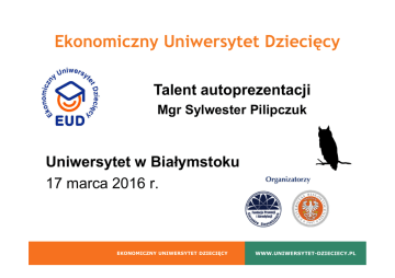 Ekonomiczny Uniwersytet Dziecięcy Talent autoprezentacji Mgr Sylwester Pilipczuk Uniwersytet w Białymstoku 17 marca 2016 r. EKONOMICZNY UNIWERSYTET DZIECIĘCY WWW.UNIWERSYTET-DZIECIECY.PL ZAGADKA Wracający do swojej rodowej posiadłości z długiego spaceru Chociemir - potomek hrabiego, szukając kluczy w spodniach, zauważył że zamek uległ zniszczeniu. - Jaki zamek autor miał na myśli? EKONOMICZNY UNIWERSYTET DZIECIĘCY WWW.UNIWERSYTET-DZIECIECY.PL AUTOPREZENTACJA Autoprezentacja jest to umiejętność zarządzania wrażeniami, kontrolowanie sposobu, w jaki widzą nas inni. Troska o dobre wrażenie, jakie chcemy wywrzeć np. na kliencie może spowodować, iż postrzegani będziemy jako profesjonalni, dynamiczni i kreatywni – o ile taki stworzymy swój wizerunek w ciągu kilku pierwszych minut. EKONOMICZNY UNIWERSYTET DZIECIĘCY WWW.UNIWERSYTET-DZIECIECY.PL Oto co podlega ocenie w pierwszych sekundach spotkania?! • • • • • • • • • postawa ciała kontakt wzrokowy uśmiech mimika ubranie i dodatki gesty odległość ton głosu i sposób mówienia zapach EKONOMICZNY UNIWERSYTET DZIECIĘCY WWW.UNIWERSYTET-DZIECIECY.PL Komunikacja jednostronna • Komunikacja jednostronna – to nadanie komunikatu (wiadomości) do odbiorcy bez pozyskania informacji zwrotnej, primo odbiór informacji zwrotnej, secundo – właściwą jego interpretację. • Pozostajemy z INTERPRETACJĄ, a nasza bujna wyobraźnia, wywodząca się z naszej wiedzy i doświadczeń, podpowiada nam przeróżne wersje interpretacyjne. • Uwaga! Zazwyczaj odbiorca bardziej wyobraża sobie, co nadawca chce powiedzieć, niż odbiera i analizuje wysłane przez niego sygnały. EKONOMICZNY UNIWERSYTET DZIECIĘCY WWW.UNIWERSYTET-DZIECIECY.PL Słuchanie dwustronne/aktywne • Parafraza – to swobodna przeróbka tekstu, która modyfikuje treść oryginału, zachowując jego zasadniczy sens. Parafraza to dobry sposób na upewnienie się czy właściwie rozumiemy naszego rozmówcę, oraz na ukazanie mu naszego zainteresowania. Dzięki parafrazowaniu wielowątkowym, możemy upewnić się, który wątek jest najważniejszy. • Prowadzenie rozmowy – polega na uściślaniu tematu (skupianiu się na ważnych sprawach, kierowaniu rozmową tak aby się jak najwięcej dowiedzieć). • Umiejętne stawianie pytań – kierowanie rozmowę na właściwy temat, możemy odpowiadać pytaniem na pytanie. • Stawiając pytania musimy wiedzieć jakie informacje chcemy uzyskać: stosując pytania otwarte – otrzymujemy większą ilość informacji niż przy pytaniach zamkniętych. EKONOMICZNY UNIWERSYTET DZIECIĘCY WWW.UNIWERSYTET-DZIECIECY.PL BARIERY UTRUDNIAJĄCE SŁUCHANIE 1) 2) 3) 4) 5) 6) Porównywanie Domyślanie się Przygotowywanie odpowiedzi Filtrowanie Osądzanie Skojarzenia EKONOMICZNY UNIWERSYTET DZIECIĘCY WWW.UNIWERSYTET-DZIECIECY.PL Mowa ciała • Postawa ciała jest odzwierciedleniem stanu naszej duszy; • Kontakt wzrokowy to zasadniczy element budowy zaufania (zawsze twarzą do audytorium); • Mimika odzwierciedla stan naszych podstawowych emocji; • Silne i zdecydowane gesty zdradzają pewność siebie. EKONOMICZNY UNIWERSYTET DZIECIĘCY WWW.UNIWERSYTET-DZIECIECY.PL Język ciała • 7 % sygnały werbalne (słowa) • 38 % głos (siła, wysokość, rytm) • 55 % ruchy ciała (głównie mimika twarzy) EKONOMICZNY UNIWERSYTET DZIECIĘCY WWW.UNIWERSYTET-DZIECIECY.PL Mowa ciała – zapamiętaj! • Uśmiech na twarzy prelegenta pomaga w zdobyciu sympatii nawet najbardziej sceptycznie nastawionego audytorium; • Naturalna i wyprostowana postawa mówcy sugeruje jego pewność siebie.Wpływa także pozytywnie na emisje głosu; • Gesty wzmacniaj siłą przekazu werbalnego; • Dobry mówca porusza się po dostępnej mu powierzchni w sposób swobodny; • Dostosowany do sytuacji wygodny ubiór; EKONOMICZNY UNIWERSYTET DZIECIĘCY WWW.UNIWERSYTET-DZIECIECY.PL Networking Proces polegający na pielęgnowaniu i podtrzymywaniu relacji, w których wzajemna wymiana informacji, udzielanie rad i wsparcia umożliwia rozwój i sukces wszystkich zaangażowanych w nie osób. EKONOMICZNY UNIWERSYTET DZIECIĘCY WWW.UNIWERSYTET-DZIECIECY.PL Jak przygotować swoje wystąpienie? • Profesjonalne przygotowanie (sfera emocjonalna i merytoryczna); • Diagnoza audytorium; • Efekt 55 (początek i koniec wyuczony na pamięć); • Stosuj inwokacje; • Na początku mów o czym chcesz powiedzieć, następnie powiedz to i na koniec powiedz o czym mówiłeś; • Wabik; • Porównania, metafory, parafrazy. EKONOMICZNY UNIWERSYTET DZIECIĘCY WWW.UNIWERSYTET-DZIECIECY.PL „Niezależnie od tego, co robisz, synu, zawsze serwuj to z odrobiną sosu” George M.Cohan - producent sztuk teatralnych EKONOMICZNY UNIWERSYTET DZIECIĘCY WWW.UNIWERSYTET-DZIECIECY.PL Dziesięć praw sztuki wystąpień, czyli jak mówić, by osiągnąć cel... • Wzmacniaj siłę pierwszego wrażenia; • Zachowuj się w sposób charyzmatyczny; • Przed każdym wystąpieniem przygotuj się starannie w sferze merytorycznej i emocjonalnej; • Pamiętaj o mowie Twojego ciała; • Operuj głosem zaznaczając ważniejsze wypowiedzi; EKONOMICZNY UNIWERSYTET DZIECIĘCY WWW.UNIWERSYTET-DZIECIECY.PL Dziesięć praw sztuki wystąpień czyli jak mówić, by osiągnąć cel • Zanim przystąpisz do wystąpienia dokonaj szczegółowej analizy swojego audytorium; • Opracuj scenariusz wystąpienia; • Pamiętaj o stylu języka; • Naucz się argumentować w odpowiedni sposób; • Współgraj z audytorium cz. 2 EKONOMICZNY UNIWERSYTET DZIECIĘCY WWW.UNIWERSYTET-DZIECIECY.PL Estetyka żywego słowa • • • • • • Nie używać tzw. zapełniaczy typu generalnie,ogólnie; Unikać y-kania (stosuj zamiennie pauzy); Odpowiednie odczytywanie „ę” i „ą”; Akcentować logicznie; Odpowiednia interpretacja tekstu (podział na frazy); Unikamy zbyt dużej ilości liczebników w tekście mówionym; • Sformułowania z żargonu urzędowo-kancelaryjnego EKONOMICZNY UN