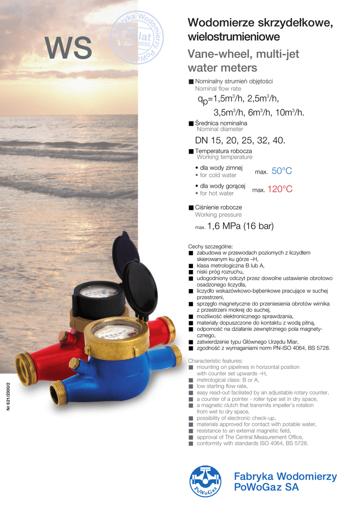 WS Wodomierze skrzyde∏kowe, wielostrumieniowe Vane-wheel, multi-jet water meters ■ Nominalny strumieƒ obj´toÊci Nominal flow rate qp=1,5m3/h, 2,5m3/h, 3,5m3/h, 6m3/h, 10m3/h. ■ Ârednica nominalna Nominal diameter DN 15, 20, 25, 32, 40. ■ Temperatura robocza Working temperature • dla wody zimnej • for cold water • dla wody goràcej • for hot water max. max. 50°C 120°C ■ CiÊnienie robocze Working pressure max. 1,6 MPa (16 bar) Nr 621/2000/2 Cechy szczególne: ■ zabudowa w przewodach poziomych z liczyd∏em skierowanym ku górze –H, ■ klasa metrologiczna B lub A, ■ niski próg rozruchu, ■ udogodniony odczyt przez dowolne ustawienie obrotowo osadzonego liczyd∏a, ■ liczyd∏o wskazówkowo-b´benkowe pracujàce w suchej przestrzeni, ■ sprz´g∏o magnetyczne do przeniesienia obrotów wirnika z przestrzeni mokrej do suchej, ■ mo˝liwoÊç elektronicznego sprawdzania, ■ materia∏y dopuszczone do kontaktu z wodà pitnà, ■ odpornoÊç na dzia∏anie zewn´trznego pola magnetycznego, ■ zatwierdzenie typu G∏ównego Urz´du Miar, ■ zgodnoÊç z wymaganiami norm PN-ISO 4064, BS 5728. Characteristic features: ■ mounting on pipelines in horizontal position with counter set upwards –H, ■ metrological class: B or A, ■ low starting flow rate, ■ easy read-out faciliated by an adjustable rotary counter, ■ a counter of a pointer - roller type set in dry space, ■ a magnetic clutch that transmits impeller’s rotation from wet to dry space, ■ possibility of electronic check-up, ■ materials approved for contact with potable water, ■ resistance to an external magnetic field, ■ approval of The Central Measurement Office, ■ conformity with standards ISO 4064, BS 5728. Oznaczenie – Typ Designation – Type Wykonanie: Version: WS1,5 1,5-G1 2,5 3,5 6-G11/4 6 15 20 20 25 25 32 10 WS 120Ârednica nominalna Nominal diameter DN mm Nominalny strumieƒ obj´toÊci Nominal flow rate qp m3/h 1,5 2,5 3,5 6 10 Maksymalny strumieƒ obj´toÊci Maximum flow rate qs m3/h 3 5 7 12 20 PoÊredni strumieƒ obj´toÊci Klasa A Class A Transitional flow rate Klasa B Class B qt dm3/h 150 120 250 200 350 280 600 480 1000 800 Minimalny strumieƒ obj´toÊci Klasa A Class A Minimum flow rate Klasa B Class B qmin dm3/h 60 30 100 50 140 70 240 120 400 200 - dm3/h 8 15 25 40 70 Próg rozruchu Starting flow rate B∏àd wzgl´dny w zakresie obcià˝eƒ qs do qt Relative error within a load range below qs to qt woda zimna cold water woda goràca hot water B∏àd wzgl´dny w zakresie obcià˝eƒ qt do qmin Relative error within a load range below qt to qmin ε 40 ±2 % ±3 ε % ±5 Zakres wskazaƒ liczyd∏a Counter range - m3 100 000 Dzia∏ka elementarna Scale interval Ve dm3 0,1 (0,05) G - G3/4 G1 G1 G11/4 G11/4 G11/2 G2 L mm 165 190 190 260 260 260 300 H mm 130 130 130 147 147 147 162 h mm 34 34 34 44 44 44 44 D mm 96 96 96 100 100 100 128 - kg 1,5 1,7 1,7 2,5 2,5 3,1 4,7 Masa Weight (bez elementów przy∏àczeniowych) (without cennectors) Strata ciÊnienia Head loss ∏àcznik coupling podk∏adka washer DN 15 20 25 32 40 Przyk∏ad zamówienia: - wodomierz do wody zimnej WODOMIERZ WS 1,5 Przyk∏ad zamówienia: - wodomierz do wody goràcej WODOMIERZ WS 120-1,5 Przyk∏ad zamówienia: - ∏àczniki do wodomierza WS 1,5 Example of an order: - water meter for cold water WATER METER WS 1,5 Example of an order: - water meter for hot water WATER METER WS 120-1,5 Example of an order: - couplings for WS 1,5 water meter G G3/4 G1 G11/4 G11/2 G2 nakr´tka nut g d l G1/2 G3/4 G1 G11/4 G11/2 17 23 29 36 43 40 50 60 60 70 Fabryka Wodomierzy PoWoGaz SA ul. Klemensa Janickiego 23/25 60-542 Poznaƒ, tel. 061 8474401 061 8470194, fax 061 8472548 http://www.powogaz.com.pl e-mail:[email protected] Wodomierze skrzyde∏kowe, WS-NK wielostrumieniowe z nadajnikiem impulsów Vane-wheel, multi-jet water meters with reed contact ■ Nominalny strumieƒ obj´toÊci Nominal flow rate qp=1,5m3/h, 2,5m3/h, 3,5m3/h, 6m3/h, 10m3/h. ■ Ârednica nominalna Nominal diameter DN 15, 20, 25, 32, 40. ■ Temperatura robocza Working temperature • dla wody zimnej • for cold water max. • dla wody goràcej max. • for hot water 50°C 120°C ■ CiÊnienie robocze Working pressure max. 1,6 MPa (16 bar) Nr 622/2000/2 Cechy szczególne: ■ zabudowa w przewodach poziomych z liczyd∏em skierowanym ku górze – H, ■ klasa metrologiczna B lub A, ■ niski próg rozruchu, ■ udogodniony odczyt przez dowolne ustawienie obrotowo osadzonego liczyd∏a, ■ nadajnik impulsów NK –zdalne przekazywanie wskazaƒ, ■ liczyd∏o wskazówkowo-b´benkowe pracujàce w suchej przestrzeni, ■ sprz´g∏o magnetyczne do przeniesienia obrotów wirnika z przestrzeni mokrej do suchej, ■ mo˝liwoÊç elektronicznego sprawdzania, ■ materia∏y dopuszczone do kontaktu z wodà pitnà, ■ odpornoÊç na dzia∏anie zewn´trznego pola magnetycznego, ■ zatwierdzenie typu G∏ównego Urz´du Miar, ■ zgodnoÊç z wymaganiami norm PN-ISO 4064, BS 5728. Characteristic features: ■ mounting on pipelines in horizontal position with counter set upwards –H, ■ metrological class: B or A, ■ low starting flow rate, ■ easy read-out faciliated by an adjustable rotary counter, ■ pulse transmitter NK –remote reading transmission, ■ a counter of a pointer - roller type set in dry space, ■ a magnetic clutch that transmits impeller’s rotation from wet to dry space, ■ possibility of electronic check-up, ■ materials approved for contact with potable water, ■ resistance to an external magnetic field, ■ approval of The Central Measurement Office, ■ conformity with standards ISO 4064, BS 5728. Oznaczenie – Typ Designation – Type Wykonanie: Version: WS1,5-NK 1,5-G1-NK 2,5-NK 3,5-NK 6-G11/4-NK 6-NK 10-NK 15 20 20 25 25 32 40 WS120Ârednica nominalna Nominal diameter Nominalny strumieƒ obj´toÊci Nominal flow rate Maksymalny strumieƒ obj´toÊci Maximum flow rate PoÊredni strumieƒ obj´toÊci K