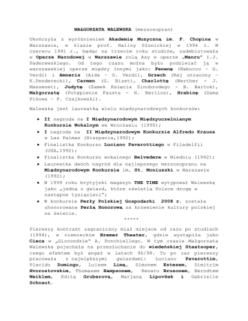 MAŁGORZATA WALEWSKA (mezzosopran) Ukończyła z wyróżnieniem Akademię Muzyczną im. F. Chopina w Warszawie, w klasie prof. Haliny Słonickiej w 1994 r. W czerwcu 1991 r., będąc na trzecim roku studiów, zadebiutowała w Operze Narodowej w Warszawie rolą Azy w operze „Manru” I.J. Paderewskiego. Od tego czasu można było podziwiać ją w warszawskiej operze między innymi jako: Fenenę (Nabucco – G. Verdi) i Amneris (Aida – G. Verdi), Grzech (Raj utracony – K.Penderecki), Carmen (G. Bizet), Charlottę (Werther - J. Massenet), Judytę (Zamek Księcia Sinobrodego - B. Bartok), Małgorzatę (Potępienie Fausta - H. Berlioz), Hrabinę (Dama Pikowa – P. Czajkowski). Walewska jest laureatką wielu międzynarodowych konkursów: II nagroda na I Międzynarodowym Międzyuczelnianym Konkursie Wokalnym we Wrocławiu (1990); I nagroda na II Międzynarodowym Konkursie Alfredo Krausa w Las Palmas (Hiszpania,1992); Finalistka Konkursu Luciano Pavarottiego w Filadelfii (USA,1992); Finalistka Konkursu wokalnego Belvedere w Wiedniu (1992); Laureatka dwóch nagród dla najlepszego mezzosopranu na Międzynarodowym Konkursie im. St. Moniuszki w Warszawie (1992); W 1999 roku brytyjski magazyn THE TIME wytypował Walewską jako „jedną z gwiazd, które oświetlą Polsce drogę w następne tysiącleci”; W konkursie Perły Polskiej Gospodarki 2008 r. została uhonorowana Perłą Honorową za krzewienie kultury polskiej na świecie. ***** Pierwszy kontrakt zagraniczny miał miejsce od razu po studiach (1994), w niemieckim Bremer Theater, gdzie wystąpiła jako Cieca w „Giocondzie“ A. Ponchiellego. W tym czasie Małgorzata Walewska pojechała na przesłuchanie do wiedeńskiej Staatsoper, czego efektem był angaż w latach 96/98. Tu po raz pierwszy pracowała z największymi gwiazdami: Luciano Pavarottim, Placido Domingo, Luisem Limą, Simonem Estesem, Dimitrim Hvorostovskim, Thomasem Hampsonem, Renato Brusonem, Berndtem Weiklem, Editą Gruberovą, Marjaną Lipovšek i Gabrielle Schnaut. We Włoszech Walewska zadebiutowała w 1995 r. jako Magdalena (Rigoletto) w festiwalowej produkcji Teatro della Opera di Roma w Villa Borghese. Konsekwencją tego wydarzenia był kontrakt z Teatro Comunale di Bologna w sezonie 03/04, gdzie śpiewała Ulrykę w Balu Maskowym. Wraz z bolońską obsadą pod dyrekcją maestro Danielle Gattiego została zaproszona na tournee po Emilli Romanii (występowała w Ferrarze, Piacenzy, Reggio Emilii, Modenie). W Semperoper w Dreźnie (od 1999) przez kilka sezonów Małgorzata Walewska śpiewała między innymi Miss Quickly w Falsaffie i Ulrykę w Balu maskowym G.Verdiego. W Deutsche Oper Berlin zadebiutowała jako Ms. Quickly, a potem śpiewała Amneris i po raz pierwszy Azucenę w Trubadurze Verdiego. W 2007 r. została zaproszona ponownie do roli tytułowej bohaterki w operze Cassandra Vittorio Gnecchiego. Kolejny występ w tej operze miał miejsce w maju 2011 r., kiedy to Walewska jako Dalila i Jose Cura jako Samson zostali owacyjnie przyjęci przez berlińską publiczność. W Deutsche Oper am Rhein (Düsseldorf) w Essen i Luxemburgu Walewska debiutowała rolą Amneris, W Holandii wystąpiła w Den Haag w roli Carmen a w Rotterdamie i Utrechcie w roli Santuzzy. Debiut francuski nastąpił w roku 2004 w Montpellier, gdzie Walewska po raz kolejny zaśpiewała Ulrykę w Balu Maskowym. Tą samą rolą zadebiutowała we wrześniu 2008 roku w Teatro Real w Madrycie, przedstawieniami dyrygował Jesus Lopez Cobos. W grudniu 2007r. po raz pierwszy zaśpiewała w Teatro Nacional de Sao Carlos w Lizbonie. W marcu 2008 Maestro Domingo zaprosił ją do Waszyngtonu, gdzie jej kreacja Magdaleny w Rigoletto spotkała się z ciepłym przyjęciem krytyków. 16.III 2005 r. zadebiutowała w Metropolitan Opera w Nowym Jorku jako Dalila w „Samsonie i Dalili”. W roli Samsona partnerował jej Jose Cura. Publiczność nagrodziła spektakl owacją na stojąco. Tu należałoby wspomnieć o znakomitych recenzjach z debiutu Walewskiej jako Dalili w Palm Beach Opera na Florydzie w 1998 r. pod dyrekcją śp. Maestro A.Guadagno. Oprócz Dalili Walewska zaśpiewała w MET Santuzzę i Amneris. Konsekwencją debiutu w MET są kolejne kontrakty w USA: w Waszyngtonie (Magdalena), Baltimore (Fenena), Honolulu (Dalila). Kreacja Judyty w Zamku Sinobrodego (II-2009) w operze w Seattle spotkała się z wielkim entuzjazmem i zaowocowała kontraktami w tym teatrze na kolejne sezony: Azucena w Trubadurze w 2010, Masseneta i Carmen 2011r. Dulcynea w Don Kichocie Jula Od 1998 r. śpiewaczka przez wiele lat zapraszana była do Finlandii na letni festiwal w Savonlinnie, gdzie śpiewała Santuzzę, Amneris i Carmen. W Operze Narodowej w Helsinkach zadebiutowała w 2003 jako Eboli. Do niezapomnianych należy też interpretacja Carmen przede wszystkim w Wiedeńskiej Staatsoper i w Herodion Teather w Atenach. Wiosną 2009 Walewska ponownie stanęła w tym pięknym, antycznym teatrze, tym razem jako Amneris. We wrześniu 2006 zadebiutowała w New National Theatre w Tokio, śpiewając rolę księżniczki Eboli w Don Carlosie. W kwietniu 2009 roku Małgorzata Walewska po raz pierwszy wystąpiła w Królewskiej Operze Covent Garden w Londynie. Jako Azucena zaśpiewała cykl przedstawień Trubadura w słynnej inscenizacji Eljasa Moschinskiego. W roli Manrica partnerował jej Roberto Alagna, a przedstawienia prowadził Maestro Carlo Rizzi. Kolejnym doświadczeniem był debiut na francuskim festiwalu Sanxay, gdzie zaśpiewała swoją ulubioną rolę w operze „Aida” prasa pisała o Walewskiej „jej wysokość Amneris”. Kolejny debiut nastąpił trzy miesiące później w październiku w San Francisco Opera, tam zaśpiewała Azucenę. W maju 2012 r. Walewska zadebiutowała w Palacio de Bellas Artes w Meksyku niezwykle trudną rolą Amme w „Kobiecie bez cienia” Ryszarda Straussa. W listopadzie 2012 odniosła swój sukces w Szwajcarii w Grand Théâtre de Genève, gdzie zaśpiewała Dalilę w „Samsonie i Dalili