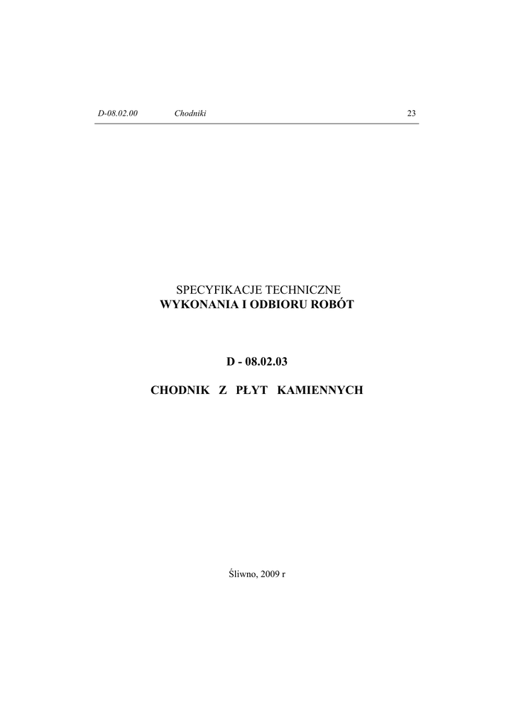 D-08.02.00 Chodniki 23 SPECYFIKACJE TECHNICZNE WYKONANIA I ODBIORU ROBÓT D - 08.02.03 CHODNIK Z PŁYT KAMIENNYCH Śliwno, 2009 r 24 Chodniki D-08.02.00 SPIS TREŚCI D-08.02.03 CHODNIK Z PŁYT KAMIENNYCH 1. WSTĘP ......................................................................................................................... 27 2. MATERIAŁY .............................................................................................................. 27 3. SPRZĘT........................................................................................................................ 30 4. TRANSPORT............................................................................................................... 30 5. WYKONANIE ROBÓT.............................................................................................. 30 6. KONTROLA JAKOŚCI ROBÓT.............................................................................. 32 7. OBMIAR ROBÓT....................................................................................................... 33 8. ODBIÓR ROBÓT ....................................................................................................... 33 9. PODSTAWA PŁATNOŚCI ........................................................................................ 34 10. PRZEPISY ZWIĄZANE............................................................................................. 34 D-08.02.00 Chodniki 25 1. WSTĘP 1.1. Przedmiot ST Przedmiotem niniejszej specyfikacji technicznej (ST) są wymagania dotyczące wykonania i odbioru robót związanych z wykonaniem chodnika z płyt kamiennych na zadaniu: „Przebudowa schodów przy pomniku wraz z budową miejsc parkingowych” w Świdwinie. 1.2. Zakres stosowania ST Specyfikacja techniczna (ST) jest stosowana jako dokument przetargowy i kontraktowy przy zlecaniu i realizacji robót wymienionych w punkcie 1.1. 1.3. Zakres robót objętych ST Ustalenia zawarte w niniejszej specyfikacji dotyczą zasad prowadzenia robót związanych z wykonaniem chodnika z płyt kamiennych o wymiarach 1,00 x 0,70 m wbudowanych na powierzchni 44,80 m2. 1.4. Określenia podstawowe 1.4.1. Płyty chodnikowe kamienne - elementy płytowe z kamienia naturalnego obcięte do określonych wymiarów i kształtu oraz mające odpowiednią fakturę powierzchni, przeznaczone do budowy chodnika dla pieszych. 1.4.2. Pozostałe określenia podstawowe są zgodne z obowiązującymi, odpowiednimi polskimi normami i z definicjami i z definicjami podanymi w ST D-M-00.00.00 „Wymagania ogólne” pkt 1.4. 1.5. Ogólne wymagania dotyczące robót Ogólne wymagania dotyczące robót podano w ST D-M-00.00.00 „Wymagania ogólne” pkt 1.5. 2. MATERIAŁY 2.1. Ogólne wymagania dotyczące materiałów Ogólne wymagania dotyczące materiałów, ich pozyskiwania i składowania, podano w ST D-M-00.00.00 „Wymagania ogólne” pkt 2. 2.2. Płyty chodnikowe kamienne 2.2.1. Rodzaje materiału kamiennego do wytwarzania płyt Płyty chodnikowe kamienne mają być wykonywane z granitu. W zaleŜności od sposobu obróbki powierzchni licowej (wierzchniej) faktura płyt moŜe być: piłowana lub groszkowana. 26 D-08.02.00 Chodniki Płyty powinny odpowiadać wymaganiom BN-86/6747-06 [7]. Cechy fizykomechaniczne płyt chodnikowych kamiennych podaje tablica 1. Dopuszczalne wady płyt chodnikowych kamiennych podaje tablica 2. Tablica 1.Cechy fizykomechaniczne płyt chodnikowych kamiennych wg BN-86/6747-06[7] Lp. Płyty kamienne z Cechy granitu sjenitu piaskowca 1 Wytrzymałość na ściskanie w stanie nasycenia wodą, MPa, nie mniej niŜ 100 100 51 2 Wytrzymałość na ściskanie po badaniu mrozoodporności, MPa, nie mniej niŜ 80 80 45 3 Ścieralność na tarczy Boehmego w stanie nasycenia wodą, cm, nie więcej niŜ 0,75 0,75 1,0 4 Nasiąkliwość wodą, %, nie więcej niŜ 0,5 0,5 5,0 5 Odporność na zamraŜanie, w cyklach, nie więcej niŜ 25 25 25 6 Odporność na niszczące działanie atmosfery przemysłowej w środowisku o zawartości SO2, w mg/m3 od 10 do 200 od 0,5 do 10 Tablica 2. Dopuszczalne wady płyt chodnikowych kamiennych wg BN-86/6747-06 [7] D-08.02.00 Chodniki Lp. 27 Faktura płyty Nazwa wady 1 Skrzywienie licowej, mm wichrowatość 2 Odchyłki kątowe (stykowych), mm/m 3 Dopuszczalne zmiany materiałowe wg BN84/6716-03 [5] p. 3.1 jak dla gatunków bloków z płyt surowych powierzchni powierzchni bocznych 4 Występowanie rdzawych plam 5 Szczerby na krawędziach ograniczających powierzchnię licową − liczba na kaŜde 100 cm długości krawędzi płyty z: a) granitu i sjenitu b) piaskowca − długość, mm, dla płyty z: a) granitu i sjenitu b) piaskowca − głębokość, mm, dla płyty z: a) granitu i sjenitu b) piaskowca piłowana groszkowana 1,5 2 ±2 ±2 III III dopuszcza się na powierzchni do 20% powierzchni płyty 4 5 6 8 3 4 2.2.2. Składowanie płyt Płyty kamienne powinny być składowane na podłoŜu wyrównanym i odwodnionym. Płyty powinny być posegregowane według rodzajów, odmian, typów i wymiarów. Płyty prostokątne powinny być ustawione na jednym z dłuŜszych boków, powierzchniami obrobionymi do siebie. Płyty naleŜy ustawiać na podkładkach drewnianych i zabezpieczyć krawędzie przed uszkodzeniem przekładkami. 2.3. Piasek Piasek na podsypkę i do wypełnienia spoin powinien odpowiadać wymaganiom PN-B-06712 [2]. Piasek do zaprawy cementowo-piaskowej powinien odpowiadać wymaganiom PNB-06711 [1]. 2.4. Cement Cement do zaprawy cementowo-piaskowej powinien być cementem portlandzkim klasy „32,5” i odpowiadać wymaganiom PN-B-19701 [3]. 28 Chodniki D-08.02.00 Przechowywanie cementu powinno być zgodne z BN-88/6731-08 [6]. 2.5. Woda Woda powinna być odmiany „1” i odpowiadać wymaganiom PN-B-32250 [4]. 3. SPRZĘT 3.1. Ogólne wymagania dotyczące sprzętu Ogólne wymagania dotyczące sprzętu podano w ST D-M-00.00.00 „Wymagania ogólne” pkt 3. 3.2. Sprzęt do wykonania chodnika Wykonawca przystępujący do wykonani