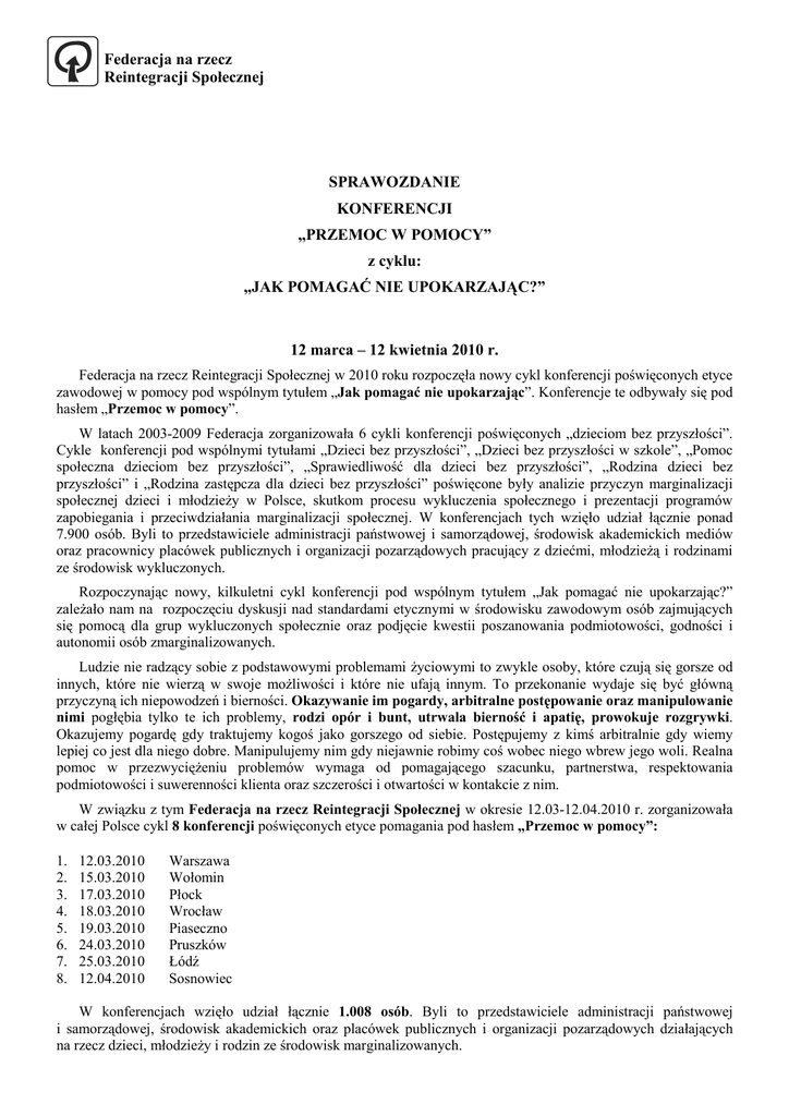 Federacja na rzecz Reintegracji Społecznej SPRAWOZDANIE KONFERENCJI „PRZEMOC W POMOCY” z cyklu: „JAK POMAGAĆ NIE UPOKARZAJĄC?” 12 marca – 12 kwietnia 2010 r. Federacja na rzecz Reintegracji Społecznej w 2010 roku rozpoczęła nowy cykl konferencji poświęconych etyce zawodowej w pomocy pod wspólnym tytułem „Jak pomagać nie upokarzając”. Konferencje te odbywały się pod hasłem „Przemoc w pomocy”. W latach 2003-2009 Federacja zorganizowała 6 cykli konferencji poświęconych „dzieciom bez przyszłości”. Cykle konferencji pod wspólnymi tytułami „Dzieci bez przyszłości”, „Dzieci bez przyszłości w szkole”, „Pomoc społeczna dzieciom bez przyszłości”, „Sprawiedliwość dla dzieci bez przyszłości”, „Rodzina dzieci bez przyszłości” i „Rodzina zastępcza dla dzieci bez przyszłości” poświęcone były analizie przyczyn marginalizacji społecznej dzieci i młodzieŜy w Polsce, skutkom procesu wykluczenia społecznego i prezentacji programów zapobiegania i przeciwdziałania marginalizacji społecznej. W konferencjach tych wzięło udział łącznie ponad 7.900 osób. Byli to przedstawiciele administracji państwowej i samorządowej, środowisk akademickich mediów oraz pracownicy placówek publicznych i organizacji pozarządowych pracujący z dziećmi, młodzieŜą i rodzinami ze środowisk wykluczonych. Rozpoczynając nowy, kilkuletni cykl konferencji pod wspólnym tytułem „Jak pomagać nie upokarzając?” zaleŜało nam na rozpoczęciu dyskusji nad standardami etycznymi w środowisku zawodowym osób zajmujących się pomocą dla grup wykluczonych społecznie oraz podjęcie kwestii poszanowania podmiotowości, godności i autonomii osób zmarginalizowanych. Ludzie nie radzący sobie z podstawowymi problemami Ŝyciowymi to zwykle osoby, które czują się gorsze od innych, które nie wierzą w swoje moŜliwości i które nie ufają innym. To przekonanie wydaje się być główną przyczyną ich niepowodzeń i bierności. Okazywanie im pogardy, arbitralne postępowanie oraz manipulowanie nimi pogłębia tylko te ich problemy, rodzi opór i bunt, utrwala bierność i apatię, prowokuje rozgrywki. Okazujemy pogardę gdy traktujemy kogoś jako gorszego od siebie. Postępujemy z kimś arbitralnie gdy wiemy lepiej co jest dla niego dobre. Manipulujemy nim gdy niejawnie robimy coś wobec niego wbrew jego woli. Realna pomoc w przezwycięŜeniu problemów wymaga od pomagającego szacunku, partnerstwa, respektowania podmiotowości i suwerenności klienta oraz szczerości i otwartości w kontakcie z nim. W związku z tym Federacja na rzecz Reintegracji Społecznej w okresie 12.03-12.04.2010 r. zorganizowała w całej Polsce cykl 8 konferencji poświęconych etyce pomagania pod hasłem „Przemoc w pomocy”: 1. 2. 3. 4. 5. 6. 7. 8. 12.03.2010 15.03.2010 17.03.2010 18.03.2010 19.03.2010 24.03.2010 25.03.2010 12.04.2010 Warszawa Wołomin Płock Wrocław Piaseczno Pruszków Łódź Sosnowiec W konferencjach wzięło udział łącznie 1.008 osób. Byli to przedstawiciele administracji państwowej i samorządowej, środowisk akademickich oraz placówek publicznych i organizacji pozarządowych działających na rzecz dzieci, młodzieŜy i rodzin ze środowisk marginalizowanych. Poszczególne konferencje zostały objęte honorowymi patronatami przez: Prezydenta Miasta Wrocławia Pana Rafała Dutkiewicza Starostę Powiatu Pruszkowskiego Panią ElŜbietę Smolińską Wsparcia finansowego i rzeczowego udzielili nam: Fundacja BRE Banku, Warszawa Firma A. Blikle Miejski Ośrodek Kultury „Kamyk” w Pruszkowie Miejski Ośrodek Pomocy Rodzinie w Zabrzu Południowo-Zachodnia Spółdzielcza Kasa Oszczędnościowo-Kredytowa „Wspólnota” Sąd Okręgowy w Łodzi Urząd Miasta Płocka, Wydział Zdrowia i Spraw Społecznych Urząd Miasta Wrocławia, Wydział Zdrowia i Spraw Społecznych Urząd Miasta i Gminy Piaseczno Wrocławskie Centrum Wspierania Organizacji Pozarządowych Sektor 3 Współorganizatorzy: Akademickie Liceum Ogólnokształcące w Płocku Centrum Integracji Społecznej we Wrocławiu II Zespół Kuratorskiej SłuŜby Sądowej Sądu Rejonowego w Piasecznie III Zespół Kuratorskiej SłuŜby Sądowej Sądu Rejonowego w Pruszkowie III Zespół Kuratorskiej SłuŜby Sądowej Sądu Rejonowego w Wołominie Mazowiecka Fundacja Pomocy Społecznej „Rodzina” Miejski Ośrodek Pomocy Społecznej we Wrocławiu Państwowa WyŜsza Szkoła Zawodowa w Płocku Stowarzyszenie na Rzecz Rodziny i Rodzicielstwa Zastępczego Nowy Dom, Katowice Stowarzyszenie Pomocy Dzieciom, MłodzieŜy i Rodzinom „Przystanek”, Wrocław Towarzystwo Psychoprofilaktyczne Oddział w Warszawie Towarzystwo Rozwijania Aktywności Dzieci „Szansa” w Łodzi WyŜsza Szkoła Humanitas w Sosnowcu Informacje i publikacje w mediach i portalach internetowych 1. 2. 3. 4. 5. 6. 7. 8. 9. 10. www.ops.pl „Jak pomagać nie upokarzając?” www.innov2010.eu – informacja o konferencji w Warszawie www.wiadomosci.ngo.pl Konferencja „Przemoc w pomocy” www.niebieskalinia.pl Konferencja „Przemoc w pomocy” www.wykluczenie.pl Konferencja „Przemoc w pomocy” Gazeta.pl Konferencja o przemocy w płockiej PWSZ www.poik.e-sochaczew Konferencja „Przemoc w pomocy” Telewizja TOYA - informacja o konferencji w Łodzi Radio Łódź - informacja o konferencji w Łodzi www.ludzkasprawa.pl „Przemoc w pomocy” 13.02.09 13.02.10 18.02.10 18.02.10 23.02.10 14.03.10 17.03.10 25.03.10 25.03.10 12.04.10 Przemówienia otwierające wygłosili m.in.: Wykłady i prezentacje przeprowadzili przedstawiciele: środowisk akademickich: dr Dorota Dyjakon dr Agnieszka Golczyńska-Grondas dr Arkadiusz Kamiński dr hab. Maria Kolankiewicz dr Agnieszka Pawłowska prof. dr hab. Zofia Rosińska prof. dr hab. ElŜbieta Tarkowska dr Liliana Tomaszewska - Dolnośląska Szkoła WyŜsza Instytut Socjologii Uniwersytetu Łódzkiego Instytut Pedagogiki Uniwersytetu Wrocławskiego Wydział Pedagogiki Uniwersytetu 