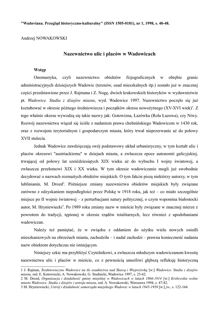 "Wadoviana. Przegląd historyczno-kulturalny" (ISSN 1505-0181), nr 1, 1998, s. 40-48. Andrzej NOWAKOWSKI Nazewnictwo ulic i placów w Wadowicach Wstęp Onomastyka, czyli nazewnictwo obiektów fizjograficznych w obrębie granic administracyjnych dzisiejszych Wadowic (terenów, osad mieszkalnych itp.) zostało już w znacznej części przedstawione przez J. Rajmana i Z. Nogę, dwóch krakowskich historyków w wydawnictwie pt. Wadowice. Studia z dziejów miasta, wyd. Wadowice 1997. Nazewnictwo poczęło się już kształtować w okresie późnego średniowiecza i początków okresu nowożytnego (XV-XVI wiek)1. Z tego właśnie okresu wywodzą się takie nazwy jak: Gotowizna, Łazówka (Rola Łazowa), czy Niwy. Rozwój nazewnictwa wiązał się ściśle z nadaniem prawa chełmińskiego Wadowicom w 1430 rok, oraz z rozwojem terytorialnym i gospodarczym miasta, który trwał nieprzerwanie aż do połowy XVII stulecia. Jednak Wadowice zawdzięczają swój podstawowy układ urbanistyczny, w tym kształt ulic i placów okresowi "austriackiemu" w dziejach miasta, a zwłaszcza epoce autonomii galicyjskiej, trwającej od połowy lat sześćdziesiątych XIX wieku aż do wybuchu I wojny światowej, a zwłaszcza przełomowi XIX i XX wieku. W tym okresie wadowiczanie mogli już swobodnie decydować o nazwach rozmaitych obiektów miejskich. O tym fakcie piszą niektórzy autorzy, w tym lublinianin, M. Drozd2. Późniejsze zmiany nazewnictwa obiektów miejskich były związane zarówno z odzyskaniem niepodległości przez Polskę w 1918 roku, jak też – co miało szczególnie miejsce po II wojnie światowej – z perturbacjami natury politycznej, o czym wspomina białostocki autor, M. Hryniewiecki3. Po 1989 roku zmiany nazw w mieście były związane w znacznej mierze z powrotem do tradycji, tępionej w okresie rządów totalitarnych, lecz również z upodobaniami wadowiczan. Należy też pamiętać, że w związku z oddaniem do użytku wielu nowych osiedli mieszkaniowych na obrzeżach miasta, zachodziła – i nadal zachodzi – prawna konieczność nadania nazw obiektom dotychczas nie istniejącym. Niniejszy szkic ma przybliżyć Czytelnikowi, a zwłaszcza młodszym wadowiczanom kwestię nazewnictwa ulic i placów w mieście, co z pewnością umożliwi głębszą refleksję historyczną 1 J. Rajman, Średniowieczne Wadowice na tle osadnictwa nad Skawą i Wieprzówką [w:] Wadowice. Studia z dziejów miasta, red. E. Kotowiecki, A. Nowakowski, G. Studnicki, Wadowice 1997, s. 23-62. 2 M. Drozd, Organizacja i działalność gminy miejskiej w Wadowicach w latach 1866-1914 [w:] Królewskie wolne miasto Wadowice. Studia z dziejów i ustroju miasta, red. A. Nowakowski, Warszawa 1994, s. 47-82. 3 M. Hryniewiecki, Ustrój i działalność samorządu miejskiego Wadowic w latach 1945-1950 [w:] jw., s. 122-164. związaną z dziejami Wadowic. 1. Nazewnictwo w okresie autonomii galicyjskiej Jak wiadomo, "królewskie wolne miasto Wadowice" (ten status prawny miasta potwierdził swym patentem cesarz Franciszek I w 1793 roku), w 1819 roku stały się siedzibą cyrkułu, czyli stolicą lokalnej austriackiej administracji rządowej, zwaną wówczas "polityczną". Ten fakt wpłynął zdecydowanie na kształt urbanistyczny miasta, łącznie z zabudową wadowickiego rynku oraz ulic wychodzących z rynku4. Niedługo później – w 1827 roku Wadowice stały się miastem garnizonowym, w którym stale w koszarach przebywały niektóre batalion austriackiego pułku piechoty. Jednak przełomowe znaczenie dla rozwoju miasta miały kolejne ustawy: ogólnopaństwowa z 1862 roku oraz krajowa dla Galicji z 1866 roku o samorządzie gminnym, zmodyfikowana następnie w 1889 roku ustawą o 30 dużych miastach galicyjskich, do których również zaliczono Wadowice5. Do aktów ustawodawczych mających wpływ na rozwój miasta należy też zaliczyć ogólnopaństwową ustawę z 1868 roku o równouprawnieniu wyznań, reasumowaną kolejną ustawą z 1890 roku, co spowodowało znaczny wzrost osadnictwa żydowskiego w Wadowicach (bezpośrednio przed II wojną światową diaspora żydowska w mieście sięgała 20 % ogółu mieszkańców)6. Rozwój samorządności miejskiej wpłynął w sposób istotny na charakter Wadowic. Oprócz uruchomionego w 1866 roku gimnazjum, Wadowice stawały się ośrodkiem życia oświatowego (dzięki aktywności szkolnej władzy samorządowej, tj. Powiatowej Wysokiej Szkolnej Rady) i kulturalnego7. W Wadowicach oraz w najbliższym sąsiedztwie miasta kwitło życie religijne dzięki temu, że od 1785 roku Wadowice były siedzibą dekanatu 8. Należy jeszcze dodać, że w 1867 roku utworzono w Wadowicach nową jednostkę władzy rządowej i samorządowej – powiat ze starostą i Wydziałem Powiatowym, zaś w latach 1888-1899 doprowadzono do Wadowic kolej (budowę linii "drogi żelaznej", jak wówczas nazywano kolej rozpoczęto w okolicach Wadowic już w 1881 roku). Te okoliczności przesądziły o dalszej urbanizacji oraz industrializacji Wadowic. Ze względów natury porządkowej, nowe obiekty w mieście musiały posiadać swoje nazwy. Każda nieruchomość miejska winna była posiadać tzw. numer policyjny, czyli czytelną, znormalizowaną tabliczkę z nazwą ulicy, bądź placu. Tak bowiem stanowiło pedantyczne austriackie ustawodawstwo. Ustalanie nazw ulic i placów miejskich należało do wyłącznej kompetencji rady 4 K. Kuśnierz, Z historii rozwoju przestrzennego Wadowic [w:] W. Zin, A. Kadłuczka, K. Kuśnierz, Wadowice, miasto Jana Pawła II, Kraków 1997, s. 43 i in. 5 A. Nowakowski, Samorząd terytorialny w Galicji na przełomie XIX-XX wieku, "Samorząd Terytorialny", R III, 1993, nr 1-2, s. 93-100. 6 K. Iwańska, Status prawny wadowickiej gminy żydowskiej na przełomie XIX i XX wieku [w:] Miscellanea HistoricoIuridica Bialostocensia, red. P. Fiedorczyk, A. Nowakowski, Białystok 1995, s. 163-182. 7 G. Studnicki, Pierwsza wśród równych. Dzieje Gimnazjum i Liceum w Wadowicach, Wadowice 1991; idem, Zar