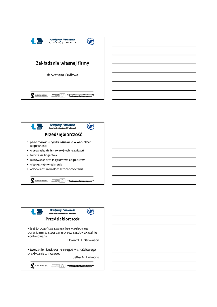 Zakładanie własnej firmy dr Svetlana Gudkova Przedsiębiorczość • podejmowanie ryzyka i działanie w warunkach niepewności • wprowadzanie innowacyjnych rozwiązań • tworzenie bogactwa • budowanie przedsiębiorstwa od podstaw • elastyczność w działaniu • odpowiedź na wieloznaczność otoczenia Przedsiębiorczość • jest to pogoń za szansą bez względu na ograniczenia, stwarzane przez zasoby aktualnie kontrolowane. Howard H. Stevenson • tworzenie i budowanie czegoś wartościowego praktycznie z niczego. Jeffry A. Timmons Twórczy niepokój Stan przyszły Stan obecny Przedsię Przedsiębiorczość biorczość jest to raczej proces stawania się niż określony stan rzeczy. William D. Bygrave Proces przedsiębiorczy Komunikacja Szansa Kreatywność Zasoby Zespół Przywództwo Timmons, 2004 Pasja Podstawą sukcesu jest pasja, której niezwykła siła udziela się pracownikom oraz pobudza ich do aktywnego działania. Pasja daje energię do „rozsiewania iskierek” entuzjazmu wśród pracowników oraz inspiruje ich do podejmowania wyzwań. Konosuke Matsushita Proces przedsię przedsiębiorczy Wartość oraz struktura umowy Negocjacje Kryteria oceny potencjału Venture capital Kapitał własny Finansowe Zasoby Szansa Źródła Kreatywność nabyte Inne źródła Kapitał obcy Budowa relacji z kredytodawcami Ludzkie Inne aktywa Cechy osobowe Network Zespół wrodzone Zarząd Konsultanci Pełnomocnicy Case studies Menadżer Przedsiębiorca Kryzysy Rozwój przedsiębiorstwa Tworzenie zespołu Prognozowanie Intervention Motywacja Kompetencje przedsiębiorcze Filozofia i postawy Etyka Przyczyny Nieformalnie inwestorzy Biznesplan Weryfikacja szans Pomysł Źródła informacji Ocena zapotrzebowania Kultura organizacyjna Jeffry A. Timmons, „New Venture Creation: Entrepreneurship for the 21st Century”, Irwin/Mc Graw-Hill, 1999. Rodzaje przedsiębiorczości wymuszona oparta na szansie Small Business vs Przedsiębiorczość Potencjał rozwojowy Innowacyjność Small Business Przedsiębiorczość Cele strategiczne Paradoksy przedsiębiorczości Na pozór mało intratna okazja może stanowić szansę o dużym potencjale rynkowym. Aby dużo zarobić, należy najpierw sporo stracić. Kreatywność i innowacyjność powinny iść w parze z rygorem i dyscypliną. Aby osiągnąć sukces, należy najpierw ponieść porażkę. Aby tworzyć bogactwo, należy nim się dzielić. Szansa rynkowa Szansa rynkowa • jest to pożądany stan przyszłości kreowany przez przedsiębiorcę, który jest przekonany o możliwości jego osiągnięcia. (Howard Stevenson) • jest to sytuacja, w której przedsiębiorca tworzy nową koncepcję połączenia zasobów zdolną do generowania dochodów. (Scott Shane) Pomysł a szansa Tworzenie pomysłów generowanie nowych pomysłów Kreatywność generowanie nowych pomysłów, które mogą być użyteczne. Identyfikacja szans dostrzeganie, że pomysły są nie tylko nowe i użyteczne, lecz również mają potencjał ekonomiczny. Typy szans rynkowych • nowy produkt, • nowa usługa, • nowa technika produkcji, • nowy system operacyjny, • nowy sposób dystrybucji, • nowy sposób zarządzania relacjami wewnątrz organizacji, • budowa zaufania. P.A.Wickham, 1998 Dlaczego dostrzegamy szanse rynkowe? • • • • doświadczenia życiowe kontakty osobiste zdolności poznawcze przypadek ☺ Poszukiwanie szans rynkowych Każdy produkt/usługa może być postrzegany/a jako kombinacja potrzeb Niezaspokojone potrzeby Lepsze zaspokojenie istniejących potrzeb Zaspokojenie większej liczby potrzeb (np. dodatkowe usługi) Zaspokojenie różnych kombinacji potrzeb Oczekiwania klientów: kanapa • zapełnienie przestrzeni • podział przestrzeni • miejsce na przechowanie pościeli • trwałość • komfort • atrakcyjny model • możliwość rozłożenia • łatwość przesuwania • miejsce na przechowywanie gazet • wymiar pasujący do drzwi • łatwość czyszczenia • antystatyczny materiał • nie farbujący materiał • dopasowanie do wystroju wnętrz • możliwość postawienia kubka • miejsce na notebook • podnóżek • twarda vs miękka • cena • bezpieczna dla dzieci • pilot • możliwość zmiany koloru •… •… •… •… •… Pomysł na biznes? • • • • Przeprowadzka? Ech… Rozwiązywanie problemów innych osób Pomysł na biznes Marty Metro Źródła pomysłów na biznes • • • • • • • • • • Doświadczenia w branży (wcześniejsze zatrudnienie, praca w firmie rodzinnej) Dostrzeżona nisza rynkowa Rozwiązanie problemu (własnego lub innych osób) Pasja i zainteresowania Praca grupy kreatywnej Przypadkowe odkrycie Analiza map grup strategicznych Integracja cech różnych produktów w jednym Wynalazek, którym nikt się nie interesuje Naśladownictwo 19 Procesy poznawcze „To umysł kreuje świat wokół nas i nawet gdybyśmy stanęli tuż obok siebie na tej samej łące, moje oczy nigdy nie ujrzą tego, co widzą twoje.” George Gissing, 1903 Poznanie społeczne – sposób, w jaki ludzie myślą o sobie samych i o świecie społecznym; jak selekcjonują, interpretują, zapamiętują i wykorzystują informację społeczną w wydawaniu sądów i w podejmowaniu decyzji. (E.Aronson, T.D.Wilson, R.M.Akert) Transformacja informacji Całe myślenie jest sztuką kojarzenia. To, co masz przed sobą, wydobywa z Twojej pamięci coś, o czym prawie nie wiedziałeś, że wiesz. (Robert Frost, 1963) • Cywilizacja Inków. • Schemat myślowy „Tarka” Generowanie nowych pomysłów • Użycie analogii – wykorzystanie posiadanej wiedzy lub doświadczenia w nowej sytuacji Kreatywność: test? Rodzaje myślenia – Myślenie dywergencyjne – wytwarzanie licznych pomysłów w odpowiedzi na problem natury otwartej. – Myślenie konwergencyjne – poszukiwanie jednego poprawnego rozwiązania. Test niezwykłych zastosowań Oceniana jest: – płynność – łatwość wytwarzania - liczba 