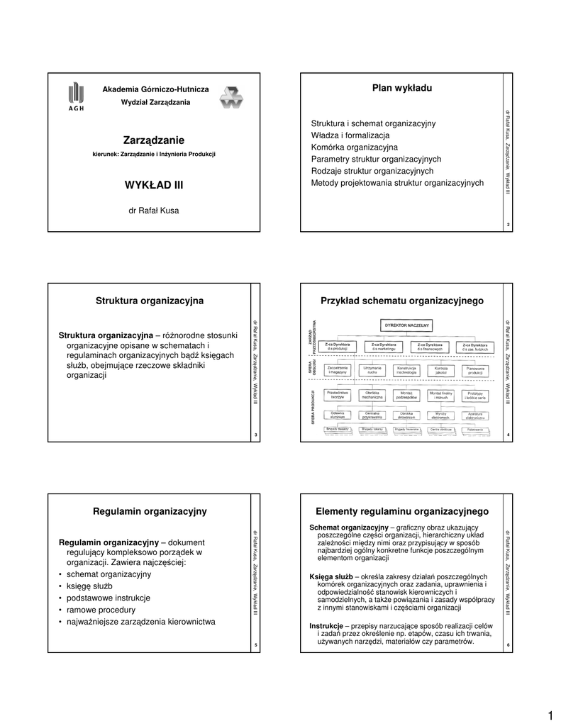Plan wykładu Akademia Górniczo-Hutnicza Wydział Zarządzania Zarządzanie kierunek: Zarządzanie i Inżynieria Produkcji WYKŁAD III dr Rafał Kusa, Zarządzanie, Wykład III Struktura i schemat organizacyjny Władza i formalizacja Komórka organizacyjna Parametry struktur organizacyjnych Rodzaje struktur organizacyjnych Metody projektowania struktur organizacyjnych dr Rafał Kusa 2 Struktura organizacyjna dr Rafał Kusa, Zarządzanie, Wykład III dr Rafał Kusa, Zarządzanie, Wykład III Struktura organizacyjna – różnorodne stosunki organizacyjne opisane w schematach i regulaminach organizacyjnych bądź księgach służb, obejmujące rzeczowe składniki organizacji Przykład schematu organizacyjnego 3 4 Regulamin organizacyjny 5 Schemat organizacyjny – graficzny obraz ukazujący poszczególne części organizacji, hierarchiczny układ zależności między nimi oraz przypisujący w sposób najbardziej ogólny konkretne funkcje poszczególnym elementom organizacji Księga służb – określa zakresy działań poszczególnych komórek organizacyjnych oraz zadania, uprawnienia i odpowiedzialność stanowisk kierowniczych i samodzielnych, a także powiązania i zasady współpracy z innymi stanowiskami i częściami organizacji Instrukcje – przepisy narzucające sposób realizacji celów i zadań przez określenie np. etapów, czasu ich trwania, używanych narzędzi, materiałów czy parametrów. dr Rafał Kusa, Zarządzanie, Wykład III dr Rafał Kusa, Zarządzanie, Wykład III Regulamin organizacyjny – dokument regulujący kompleksowo porządek w organizacji. Zawiera najczęściej: • schemat organizacyjny • księgę służb • podstawowe instrukcje • ramowe procedury • najważniejsze zarządzenia kierownictwa Elementy regulaminu organizacyjnego 6 1 Formalizacja organizacji Władza 7 Biurokracja • typ charyzmatyczny – źródłem władzy są nadzwyczajne cechy posiadane przez przywódcę, sprawowana jest ona przez okazjonalne decyzje przywódcy nieregulowane prawem • typ tradycyjny – źródłem władzy jest dziedzictwo statusu społecznego, np. monarchia, władza starszych, dużą rolę odgrywa przywiązanie do tradycji • typ racjonalny (legalny) – władza tego rodzaju pochodzi z mianowania lub wyboru dokonanego na podstawie uregulowanych prawnie procedur. Przywódcy uprawnieni są do wydawania poleceń na podstawie norm prawnych. Uleganie tej władzy oznacza więc posłuszeństwo wobec pewnego bezosobowego porządku, a nie konkretnej osoby czy zwyczaju. 8 Zasady dotyczące funkcjonariusza biurokracji • działalność urzędowa jest wyznaczona przez utrwalone na piśmie formalne przepisy, regulujące zachowanie urzędników i nadające ich urzędowym poczynaniom piętno bezosobowości. Funkcjonariusz posiada władzę nie z racji swych cech indywidualnych, lecz z racji miejsca zajmowanego w hierarchii władzy • panuje zasada kompetencji, oznaczająca stały podział obowiązków i ściśle określony zakres prawa wydawania poleceń • obowiązuje zasada hierarchii urzędowej: odpowiedzialność urzędników niższej instancji wobec wyższej, z możliwością odwołania i złożenia zażalenia do przełożonych • stanowiska i urzędy nie stanowią prywatnej własności tych, którzy je zajmują, a więc nie mogą być sprzedawane, ofiarowywane, przekazywane w spadku • środki służące wykonywaniu władzy stanowią własność organizacji, a nie prywatną własność poszczególnych funkcjonariuszy; urzędnicy nie mogą z nich korzystać dla celów osobistych i mają obowiązek wyliczania się ze sposobu wykorzystywania środków, którymi dysponują • cały proces funkcjonowania organizacji biurokratycznej opiera się na obiegu dokumentów • działalność urzędowa wymaga określonego wykształcenia, nabycia kwalifikacji i specjalizacji w wykonaniu powierzonych funkcji • czynności służbowe nie są wykonywane jako praca dodatkowa, zatrudnienie w danej instytucji urzędowej jest traktowane przez urzędnika jako stałe i podstawowe zajęcie dr Rafał Kusa, Zarządzanie, Wykład III dr Rafał Kusa, Zarządzanie, Wykład III 9 10 Komórka organizacyjna 11 Komórka organizacyjna – elementarna jednostka działania posiadająca wyodrębniony człon kierowniczy Człon kierowniczy - organ (w komórce wykonawczej zwykle jednoosobowy) posiadający w stosunku do pozostałych osób działających w jednostce określone uprawnienia władcze, umożliwiające mu kierowanie ich działaniem tak, aby zmierzało ono do realizacji przydzielonego jednostce celu cząstkowego. Kierownicy najmniejszych komórek wykonawczych oprócz funkcji kierowniczych pełnią zwykle funkcje wykonawcze. dr Rafał Kusa, Zarządzanie, Wykład III dr Rafał Kusa, Zarządzanie, Wykład III • jest osobiście wolny i wyznaczony na zajmowane stanowisko na zasadzie dobrowolnej umowy określającej zakres jego obowiązków i praw • sprawuje władzę na podstawie bezosobowych reguł, jego lojalność dotyczy wiernego wykonywania oficjalnych obowiązków • jest mianowany na stanowisko z uwagi na kwalifikacje (weryfikowane egzaminami lub przedstawieniem dyplomu) • jest zatrudniony na zajmowanym stanowisku całkowicie, a nie ubocznie • jest regularnie opłacany, adekwatnie do piastowanego stanowiska • perspektywy jego kariery zawodowej zagwarantowane są bezosobowymi prawami (zasadniczy wpływ mają staż pracy i osiągnięcia), o możliwości awansu decydują zwierzchnicy • podlega systemowi kontroli oraz ścisłej dyscyplinie formalnej Typy władzy Zasady biurokracji [Weber] Biurokracja – hierarchiczny układ pozycji urzędowych (o określonych zasadach zwierzchnictwa i podporządkowania), w którym stosunki społeczne są regulowane w całości przez przepisy wewnętrzne oraz ogólne normy prawa. Związana jest ściśle z systemem władzy legalnej. W biurokracji sformalizowane zasady zastąpiły autorytet tradycji i osób. Władza – możliwość podporządkowania zach