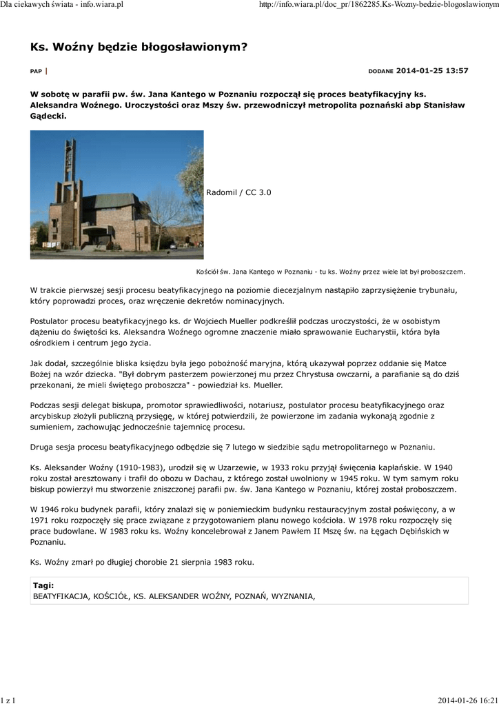 Dla ciekawych świata - info.wiara.pl 1z1 http://info.wiara.pl/doc_pr/1862285.Ks-Wozny-bedzie-blogoslawionym Ks. Woźny będzie błogosławionym? PAP | DODANE 2014-01-25 13:57 W sobotę w parafii pw. św. Jana Kantego w Poznaniu rozpoczął się proces beatyfikacyjny ks. Aleksandra Woźnego. Uroczystości oraz Mszy św. przewodniczył metropolita poznański abp Stanisław Gądecki. Radomil / CC 3.0 Kościół św. Jana Kantego w Poznaniu - tu ks. Woźny przez wiele lat był proboszczem. W trakcie pierwszej sesji procesu beatyfikacyjnego na poziomie diecezjalnym nastąpiło zaprzysiężenie trybunału, który poprowadzi proces, oraz wręczenie dekretów nominacyjnych. Postulator procesu beatyfikacyjnego ks. dr Wojciech Mueller podkreślił podczas uroczystości, że w osobistym dążeniu do świętości ks. Aleksandra Woźnego ogromne znaczenie miało sprawowanie Eucharystii, która była ośrodkiem i centrum jego życia. Jak dodał, szczególnie bliska księdzu była jego pobożność maryjna, którą ukazywał poprzez oddanie się Matce Bożej na wzór dziecka. "Był dobrym pasterzem powierzonej mu przez Chrystusa owczarni, a parafianie są do dziś przekonani, że mieli świętego proboszcza" - powiedział ks. Mueller. Podczas sesji delegat biskupa, promotor sprawiedliwości, notariusz, postulator procesu beatyfikacyjnego oraz arcybiskup złożyli publiczną przysięgę, w której potwierdzili, że powierzone im zadania wykonają zgodnie z sumieniem, zachowując jednocześnie tajemnicę procesu. Druga sesja procesu beatyfikacyjnego odbędzie się 7 lutego w siedzibie sądu metropolitarnego w Poznaniu. Ks. Aleksander Woźny (1910-1983), urodził się w Uzarzewie, w 1933 roku przyjął święcenia kapłańskie. W 1940 roku został aresztowany i trafił do obozu w Dachau, z którego został uwolniony w 1945 roku. W tym samym roku biskup powierzył mu stworzenie zniszczonej parafii pw. św. Jana Kantego w Poznaniu, której został proboszczem. W 1946 roku budynek parafii, który znalazł się w poniemieckim budynku restauracyjnym został poświęcony, a w 1971 roku rozpoczęły się prace związane z przygotowaniem planu nowego kościoła. W 1978 roku rozpoczęły się prace budowlane. W 1983 roku ks. Woźny koncelebrował z Janem Pawłem II Mszę św. na Łęgach Dębińskich w Poznaniu. Ks. Woźny zmarł po długiej chorobie 21 sierpnia 1983 roku. Tagi: BEATYFIKACJA, KOŚCIÓŁ, KS. ALEKSANDER WOŹNY, POZNAŃ, WYZNANIA, 2014-01-26 16:21