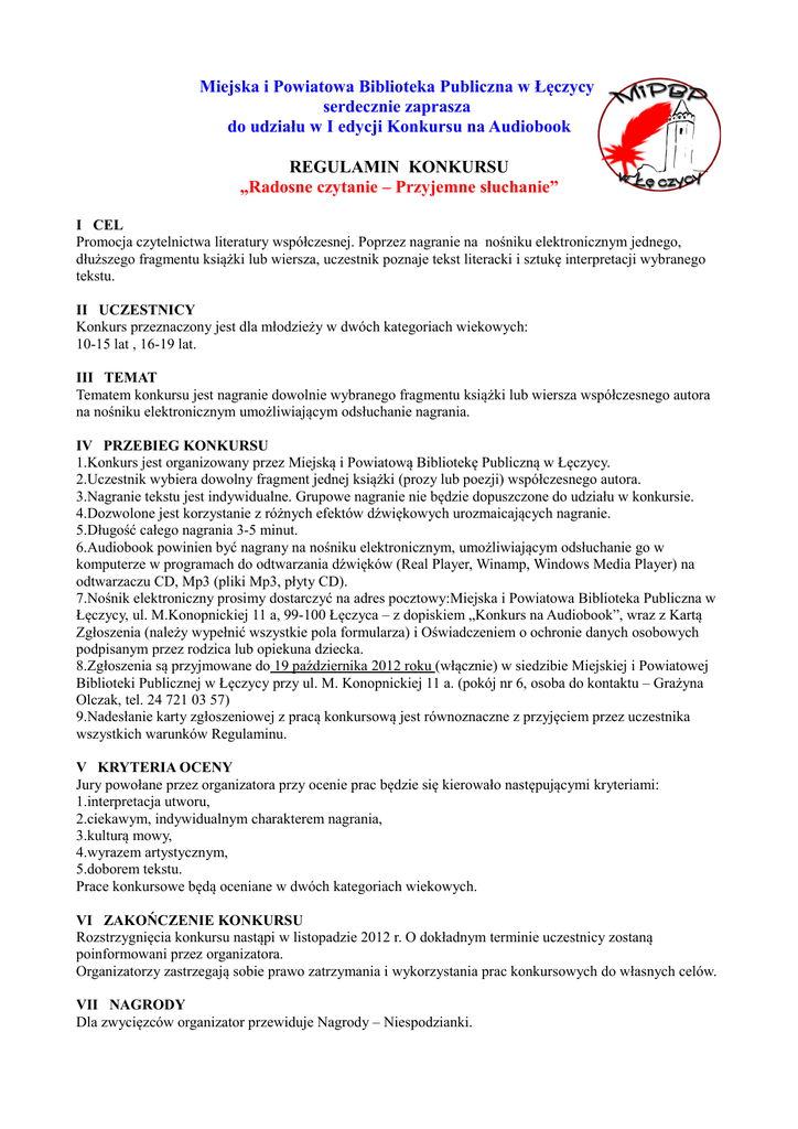 Miejska i Powiatowa Biblioteka Publiczna w Łęczycy serdecznie zaprasza do udziału w I edycji Konkursu na Audiobook REGULAMIN KONKURSU „Radosne czytanie – Przyjemne słuchanie” I CEL Promocja czytelnictwa literatury współczesnej. Poprzez nagranie na nośniku elektronicznym jednego, dłuższego fragmentu książki lub wiersza, uczestnik poznaje tekst literacki i sztukę interpretacji wybranego tekstu. II UCZESTNICY Konkurs przeznaczony jest dla młodzieży w dwóch kategoriach wiekowych: 10-15 lat , 16-19 lat. III TEMAT Tematem konkursu jest nagranie dowolnie wybranego fragmentu książki lub wiersza współczesnego autora na nośniku elektronicznym umożliwiającym odsłuchanie nagrania. IV PRZEBIEG KONKURSU 1.Konkurs jest organizowany przez Miejską i Powiatową Bibliotekę Publiczną w Łęczycy. 2.Uczestnik wybiera dowolny fragment jednej książki (prozy lub poezji) współczesnego autora. 3.Nagranie tekstu jest indywidualne. Grupowe nagranie nie będzie dopuszczone do udziału w konkursie. 4.Dozwolone jest korzystanie z różnych efektów dźwiękowych urozmaicających nagranie. 5.Długość całego nagrania 3-5 minut. 6.Audiobook powinien być nagrany na nośniku elektronicznym, umożliwiającym odsłuchanie go w komputerze w programach do odtwarzania dźwięków (Real Player, Winamp, Windows Media Player) na odtwarzaczu CD, Mp3 (pliki Mp3, płyty CD). 7.Nośnik elektroniczny prosimy dostarczyć na adres pocztowy:Miejska i Powiatowa Biblioteka Publiczna w Łęczycy, ul. M.Konopnickiej 11 a, 99-100 Łęczyca – z dopiskiem „Konkurs na Audiobook”, wraz z Kartą Zgłoszenia (należy wypełnić wszystkie pola formularza) i Oświadczeniem o ochronie danych osobowych podpisanym przez rodzica lub opiekuna dziecka. 8.Zgłoszenia są przyjmowane do 19 października 2012 roku (włącznie) w siedzibie Miejskiej i Powiatowej Biblioteki Publicznej w Łęczycy przy ul. M. Konopnickiej 11 a. (pokój nr 6, osoba do kontaktu – Grażyna Olczak, tel. 24 721 03 57) 9.Nadesłanie karty zgłoszeniowej z pracą konkursową jest równoznaczne z przyjęciem przez uczestnika wszystkich warunków Regulaminu. V KRYTERIA OCENY Jury powołane przez organizatora przy ocenie prac będzie się kierowało następującymi kryteriami: 1.interpretacja utworu, 2.ciekawym, indywidualnym charakterem nagrania, 3.kulturą mowy, 4.wyrazem artystycznym, 5.doborem tekstu. Prace konkursowe będą oceniane w dwóch kategoriach wiekowych. VI ZAKOŃCZENIE KONKURSU Rozstrzygnięcia konkursu nastąpi w listopadzie 2012 r. O dokładnym terminie uczestnicy zostaną poinformowani przez organizatora. Organizatorzy zastrzegają sobie prawo zatrzymania i wykorzystania prac konkursowych do własnych celów. VII NAGRODY Dla zwycięzców organizator przewiduje Nagrody – Niespodzianki. KARTA ZGŁOSZENIOWA Konkurs na Audiobook „Radosne czytanie – Przyjemne słuchanie” zorganizowany przez Miejską i Powiatową Bibliotekę Publiczną w Łęczycy Imię i Nazwisko uczestnika konkursu: Wiek uczestnika: Nazwa i adres szkoły: Tytuł i autor utworu (książki lub wiersza) na podstawie którego powstało nagranie: Typ nośnika elektronicznego, na który praca została nagrana: Program do odtwarzania: Adres do kontaktu: E-mail: Telefon: Oświadczenie: Wyrażam zgodę na przetwarzanie przez Miejską i Powiatową Bibliotekę Publiczną w Łęczycy moich danych osobowych w celach związanych z organizacją Konkursu na Audiobook „Radosne czytanie – Przyjemne słuchanie” oraz akceptuję wszystkie punkty regulaminu konkursu. Data: Czytelny podpis nauczyciela opiekuna: Podpis uczestnika: OŚWIADC ZEN IE *Wyrażam zgodę na wprowadzenie i przetwarzanie danych osobowych mojego dziecka w bazie danych prowadzonej przez Miejską i Powiatową Bibliotekę Publiczną w Łęczycy, ul. M. Konopnickiej 11 a, zgodnie z Ustawą z dnia 29 sierpnia 1997 r. o ochronie danych osobowych (Dz.U.z 2002 r. Nr 101, poz. 926, z późn. zm.). *Ponadto wyrażam zgodę na nieodpłatne wykorzystanie wizerunku dziecka przez organizatora Konkursu – zgodnie z Ustawą z dnia 4 lutego 1994 r. o prawie autorskim i prawach pokrewnych na cele związane z promocją Konkursu. Możliwe formy rozpowszechniania wizerunku to publikacje, internet, prasa, telewizja. *Jednocześnie oświadczam, że zostałam(em) poinformowana(y) o przysługującym mi prawie wglądu do danych, poprawiania ich, a także możliwości żądania usunięcia ich z bazy danych. …......................... Data …................................................... /podpis rodzica, opiekuna/